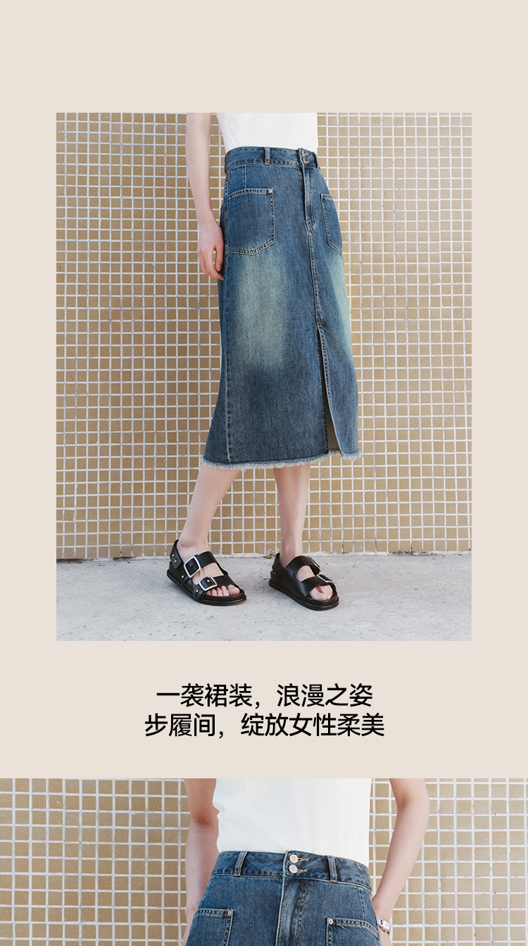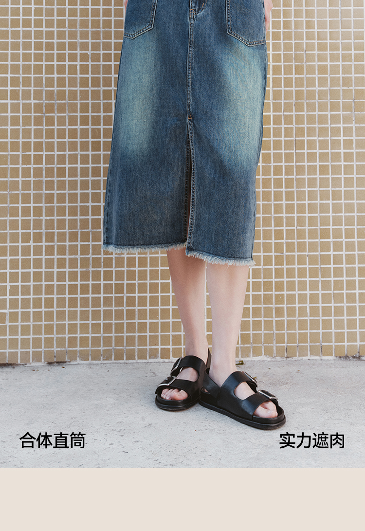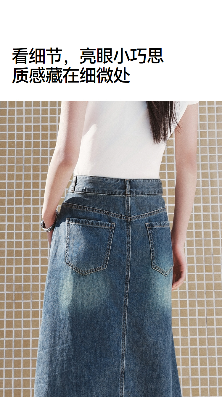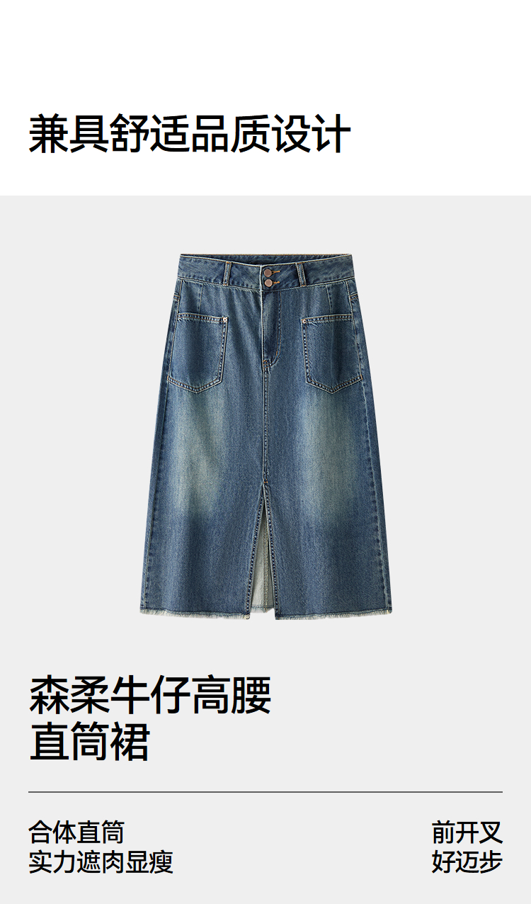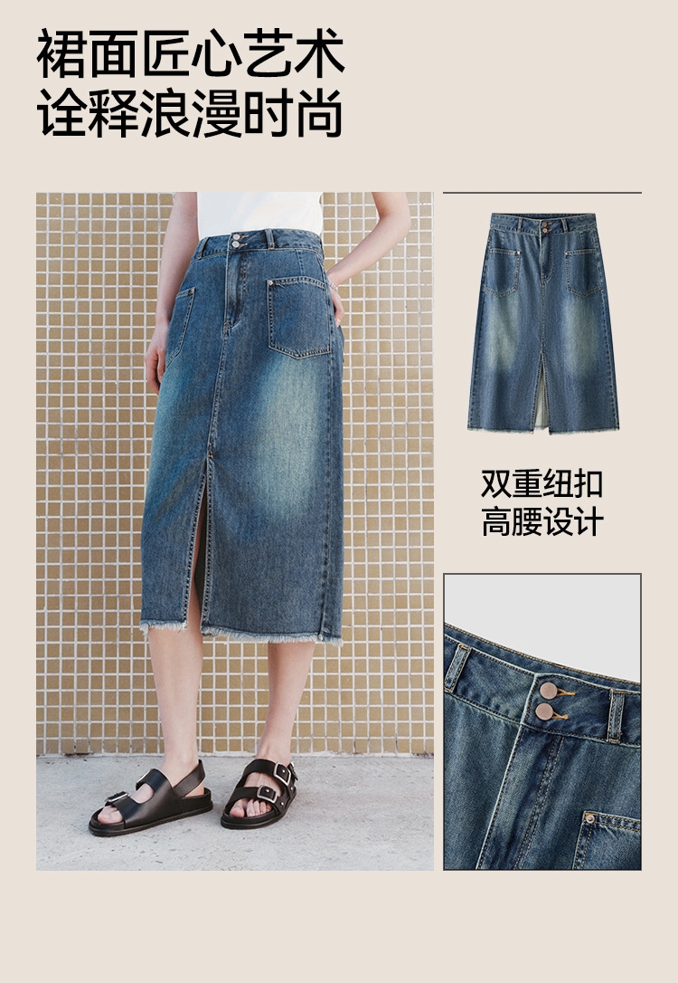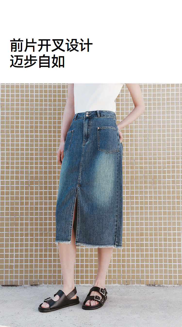 森柔|森马牛仔半身裙女夏季高腰开叉毛边长裙做旧复古潮流直筒裙