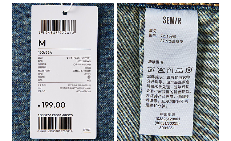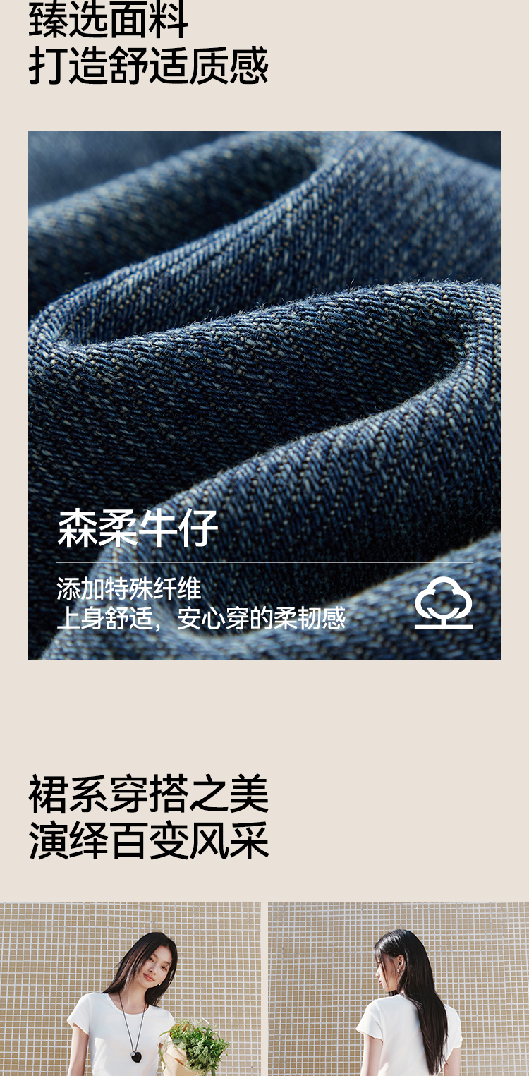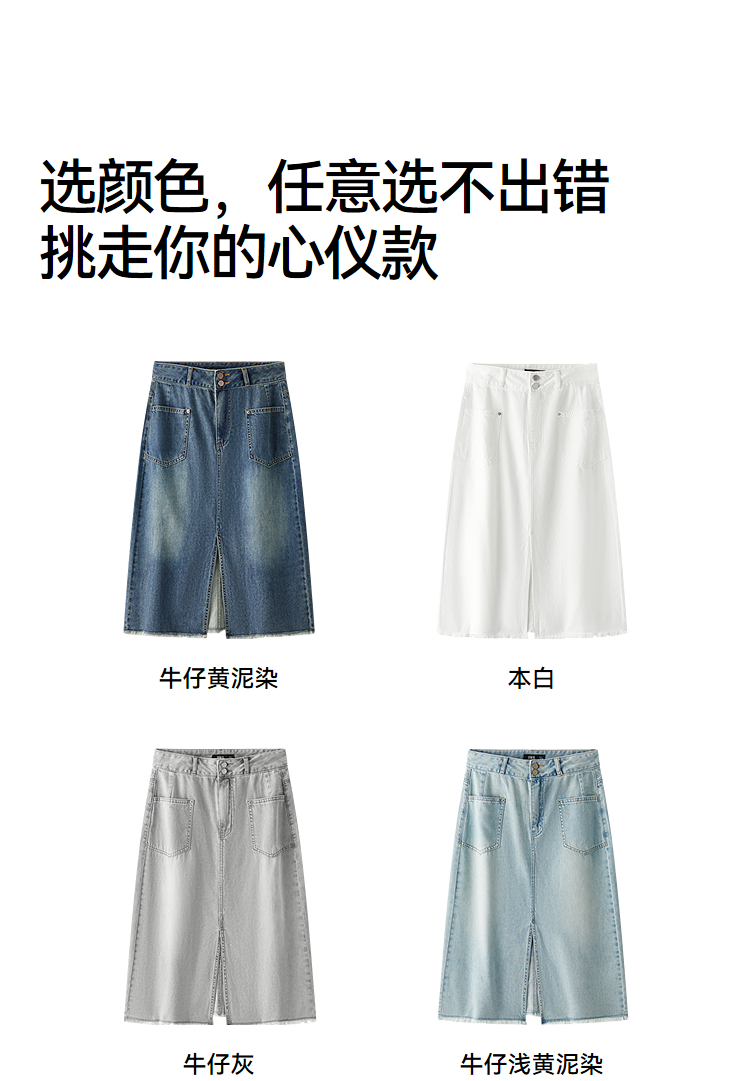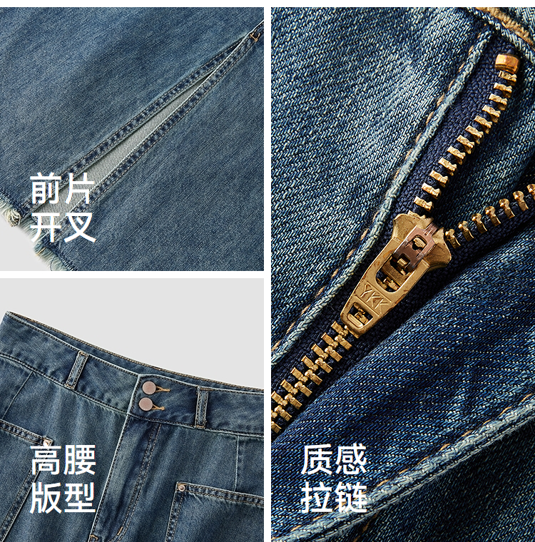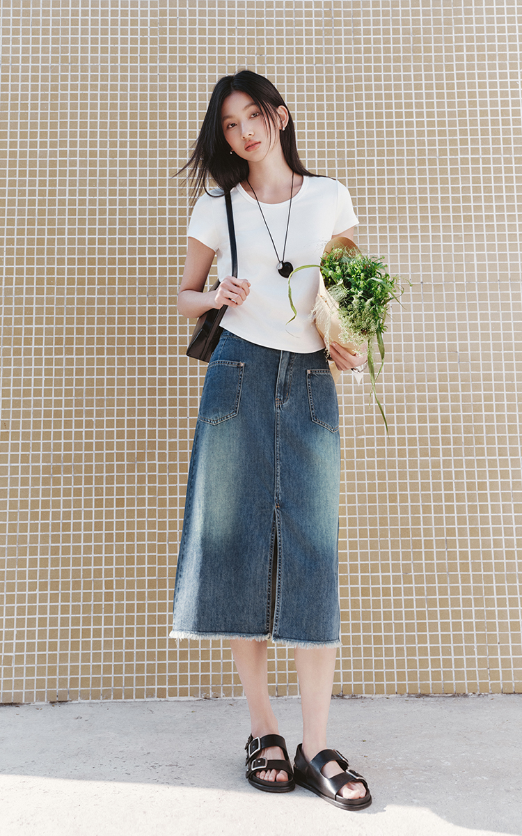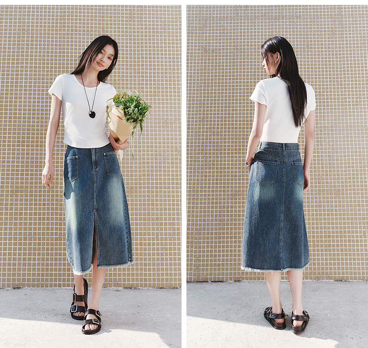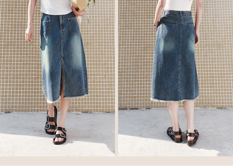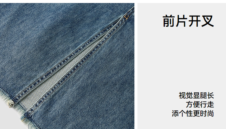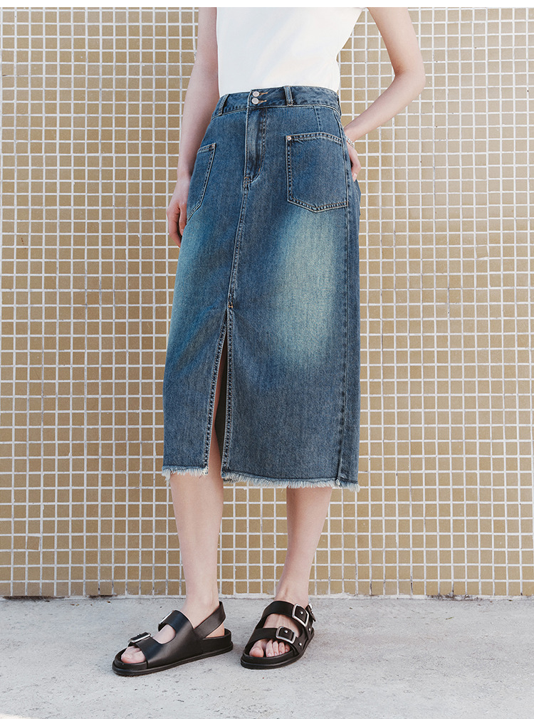 森柔|森马牛仔半身裙女夏季高腰开叉毛边长裙做旧复古潮流直筒裙