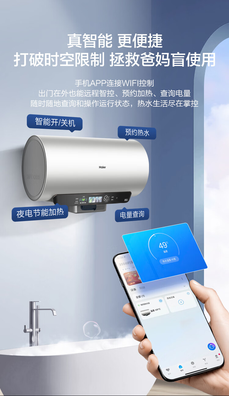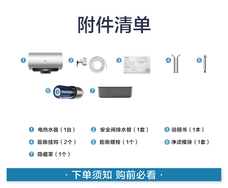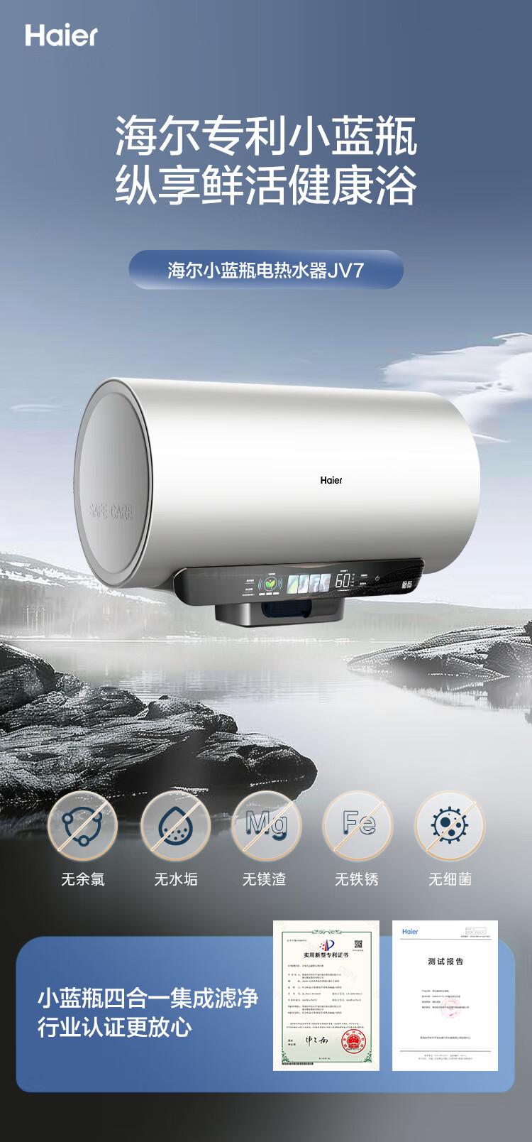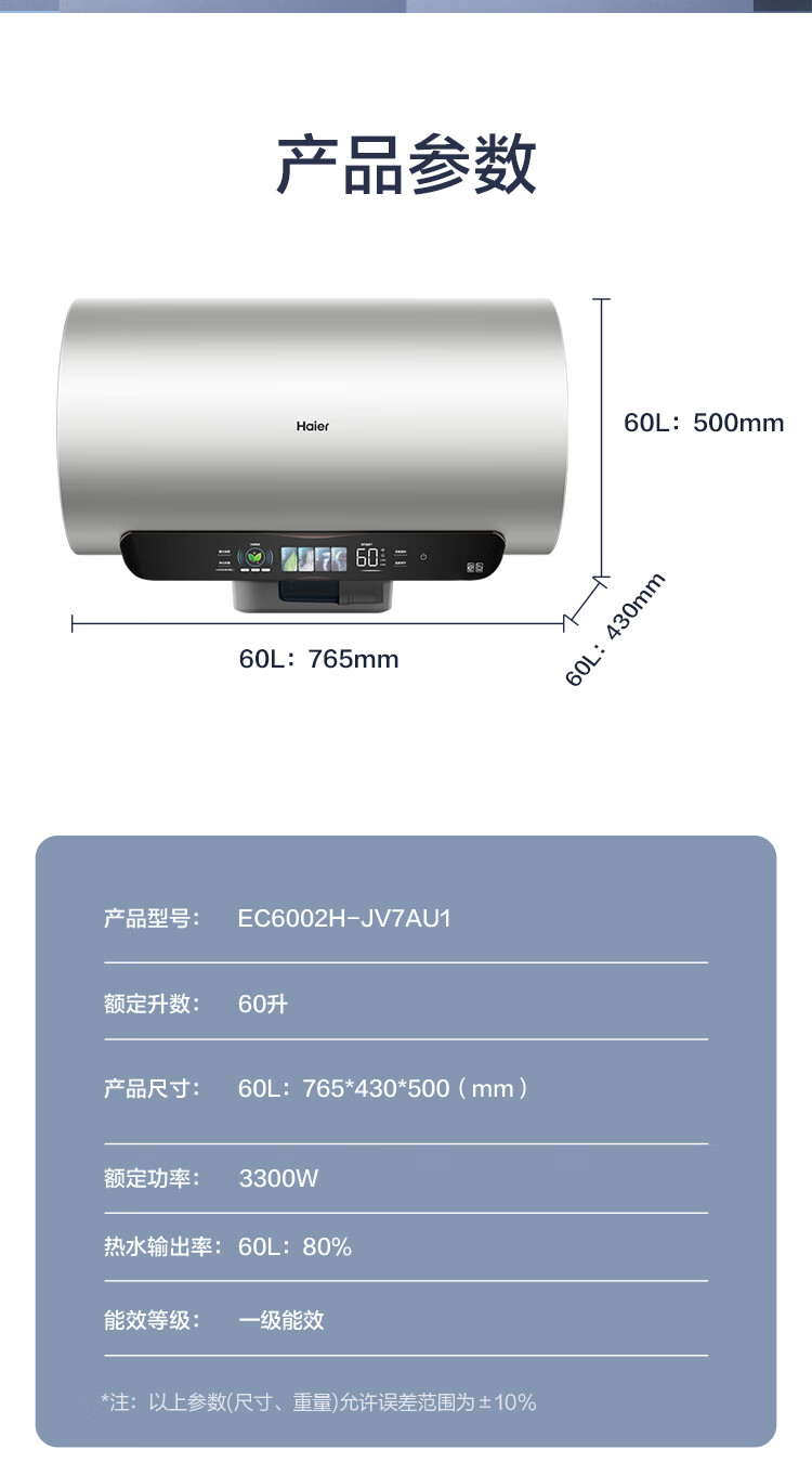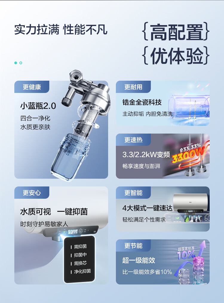 海尔(Haier)【60JV7】60升电热水器 净滤小蓝瓶2.0 3.3KW变频 锆金特护 净化可视 一级能效 ES6002H-JV7U1*