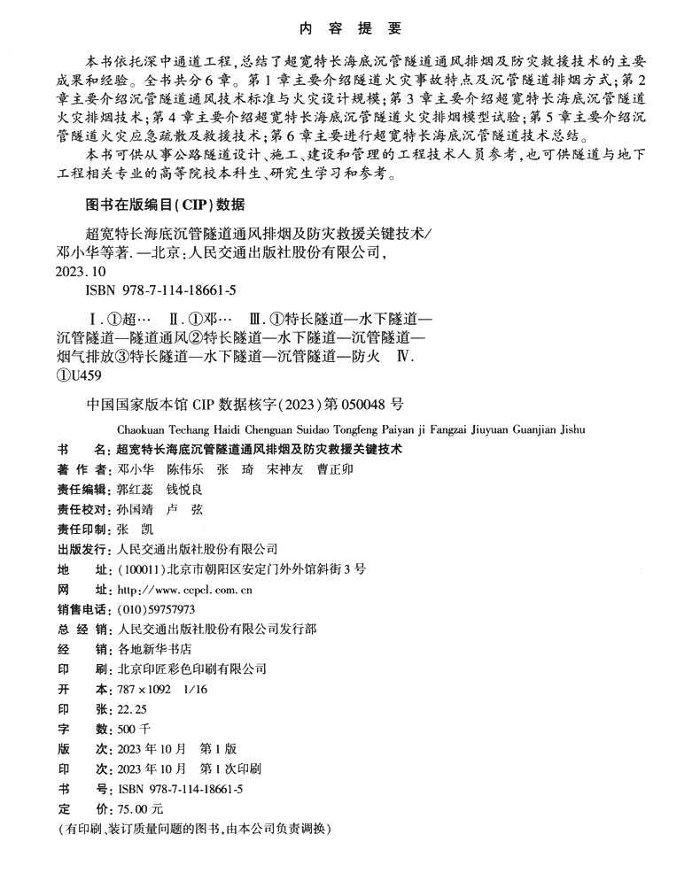 书名:超宽特长海底沉管隧道通风排烟及防灾救援关键技术