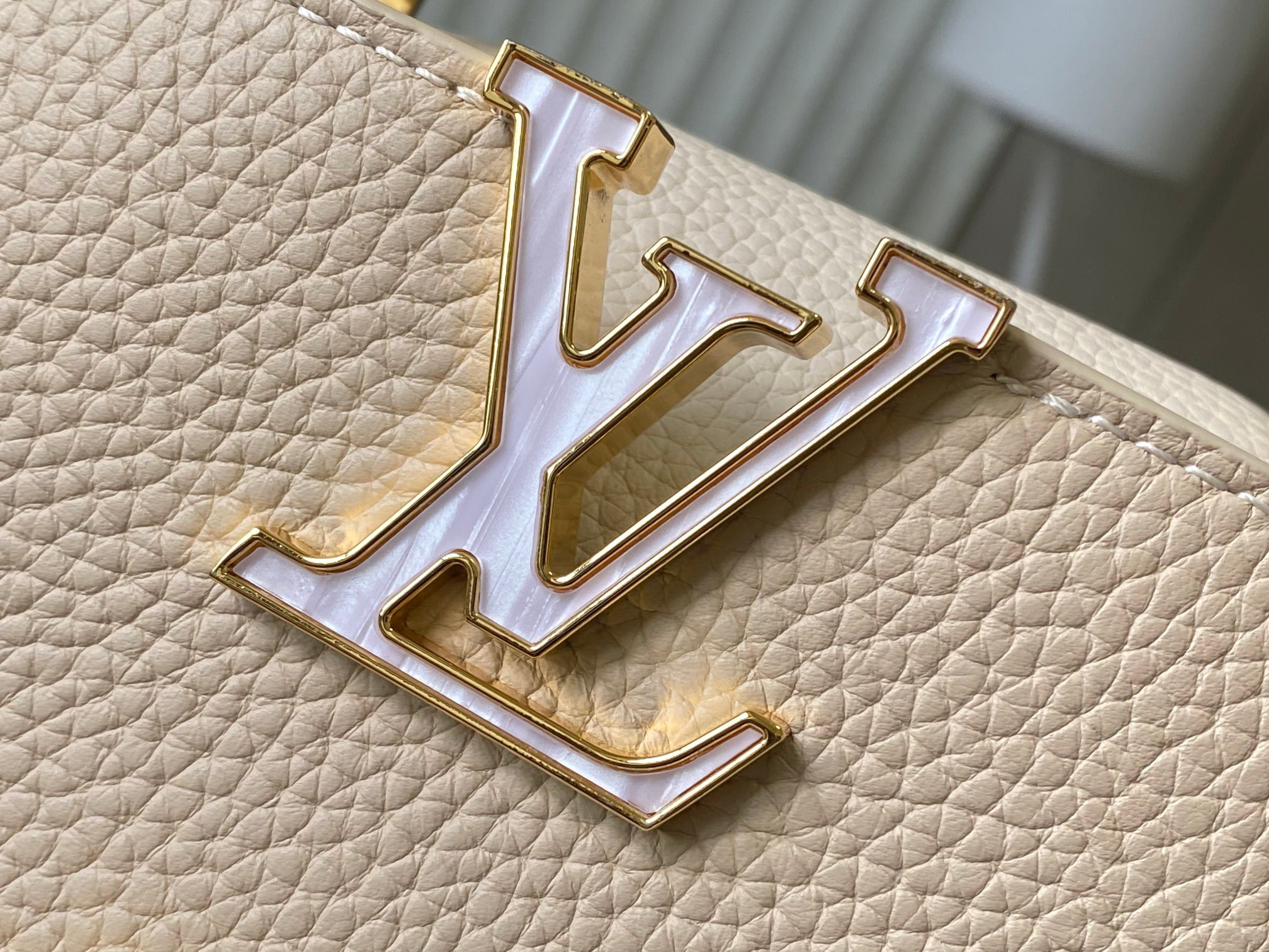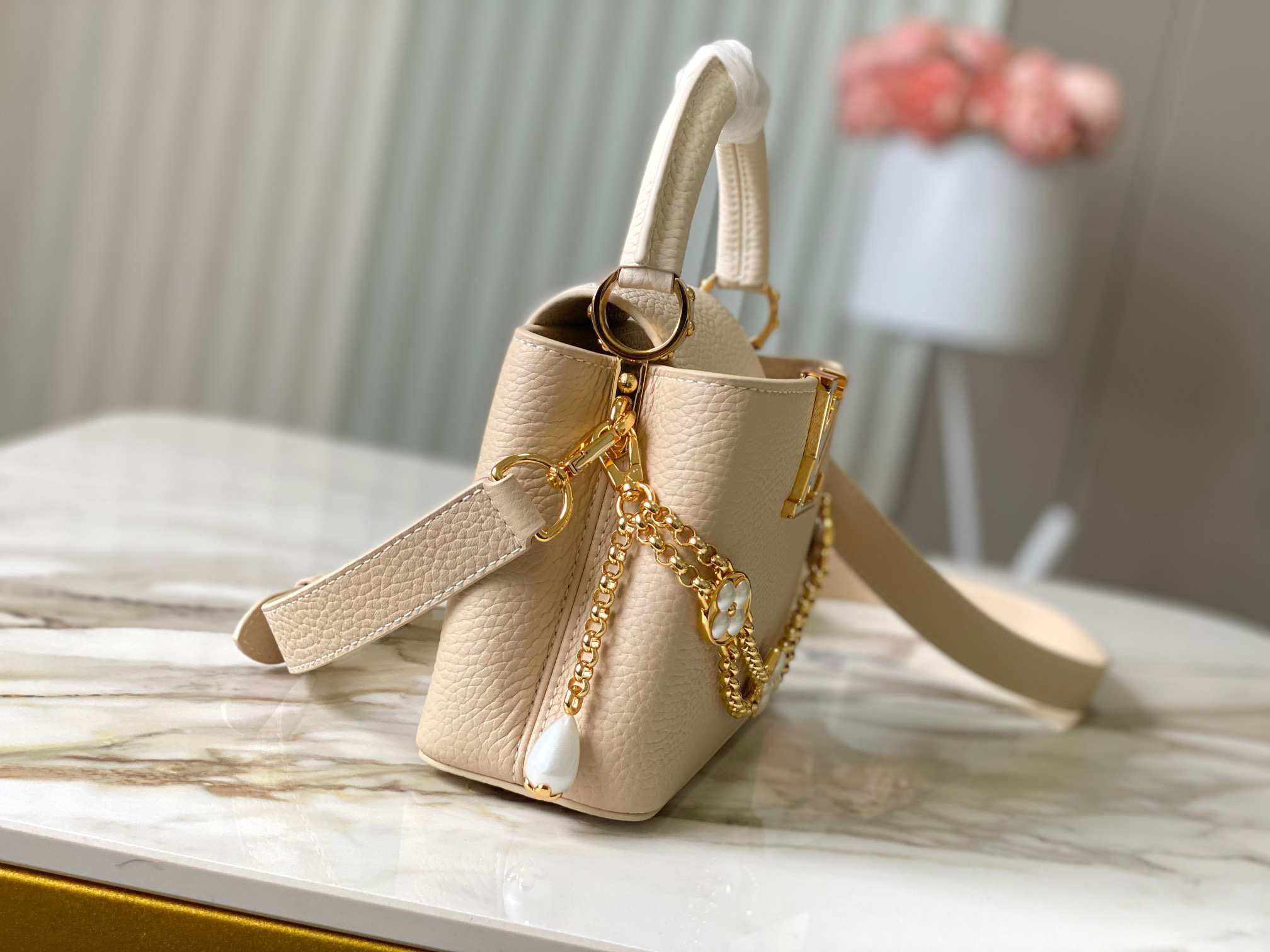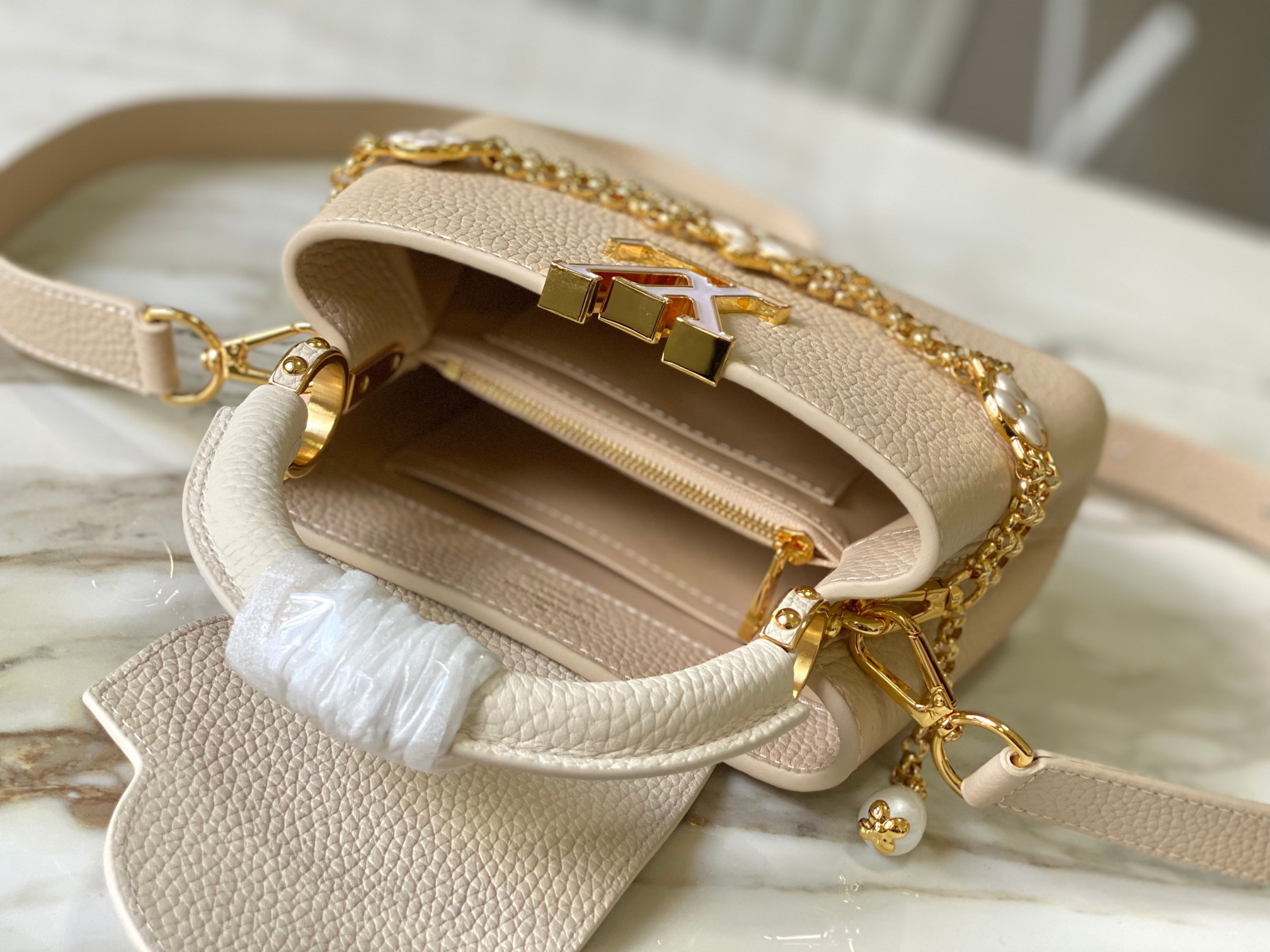 秋冬特惠💰1750 渠道级LV 新品 te级LV 动态芯片 M25461/M48865杏黄拼奶白珍珠花朵款 本款Capucines 手袋出自Daydream系列 为Taurillon 牛皮革渲染雅致色调 巧妙致意经典贝壳项链 Monogram 花卉点亮巴洛克风格链条 LV字母标识与莹润珠饰再添熠熠华彩 Size : 21 * 14 * 8CM