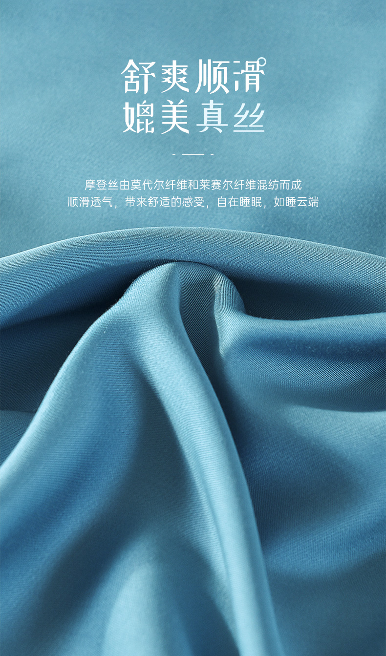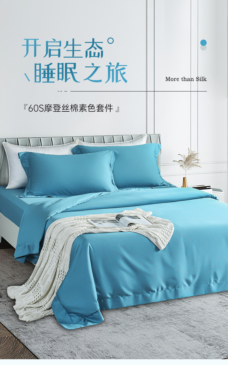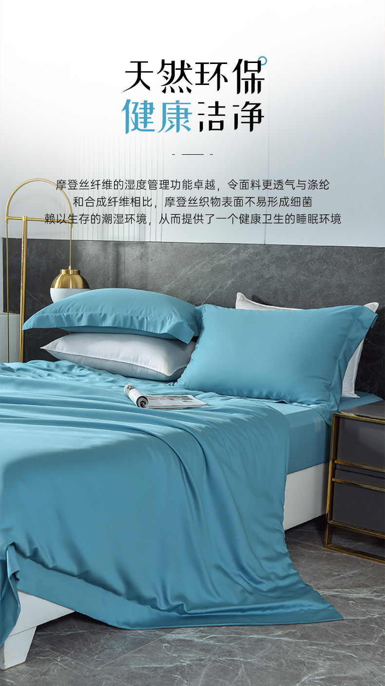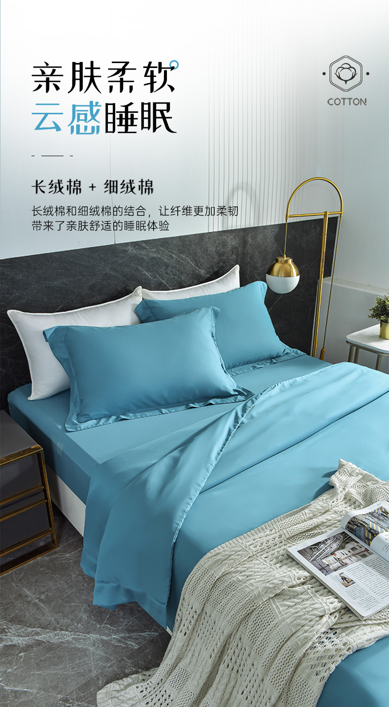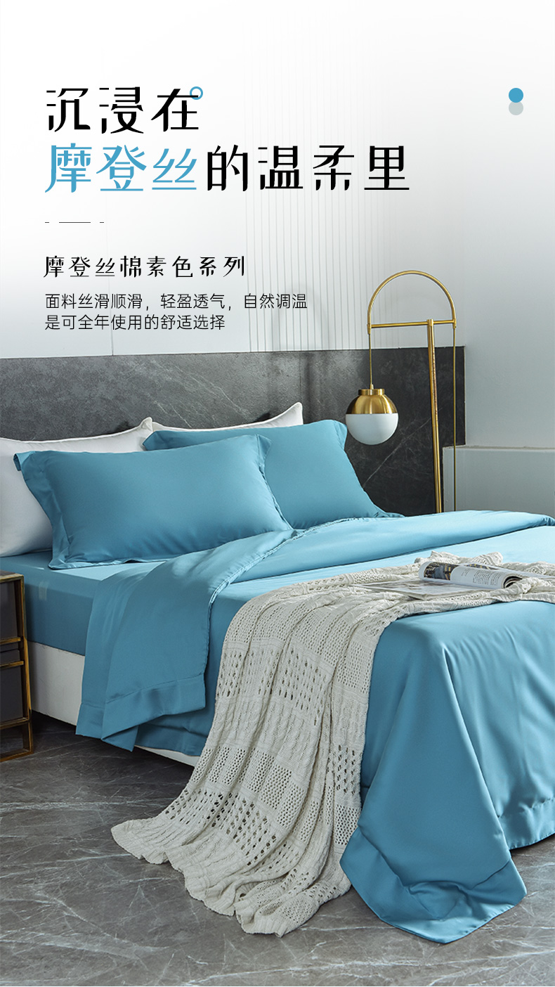 雅芳婷60S零碳摩登丝棉系列简约透气蓝色纯色床品被袋床笠四件套连芯扣家纺MC3933