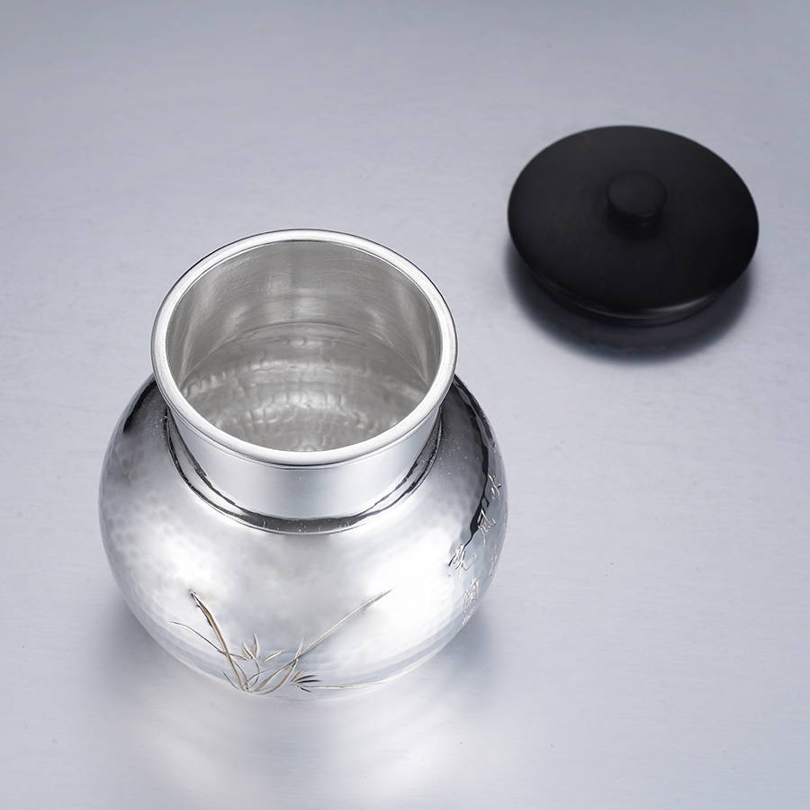 【寓意】:茶叶罐采用足银材质,经过抛光工艺处理,呈现出简约清雅的外形。以錾刻技艺刻画出《幽兰吟》部分诗句及兰花图案,寓意美好圣洁,幽谷传香。