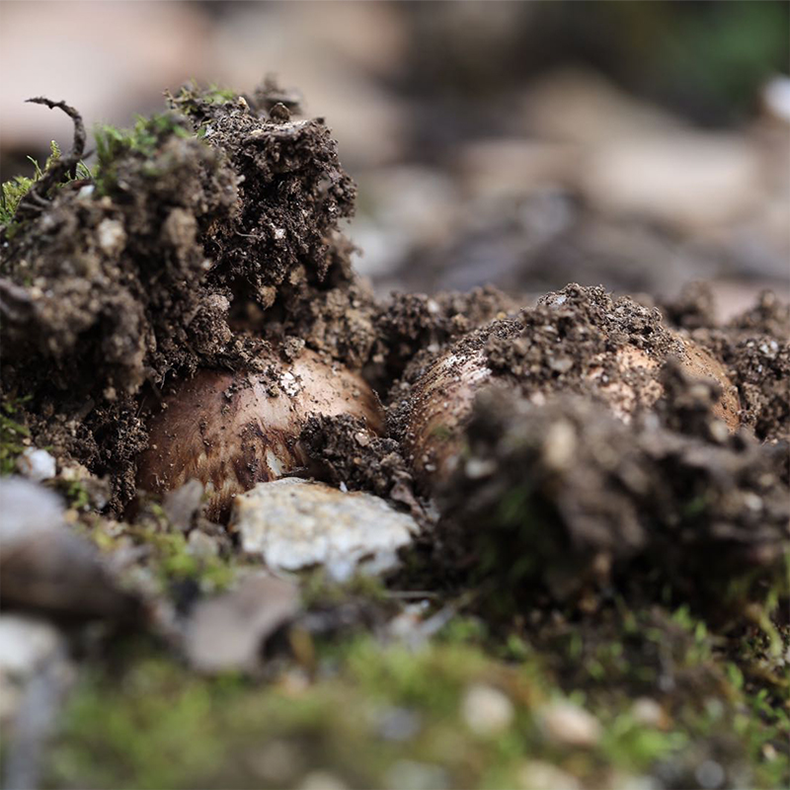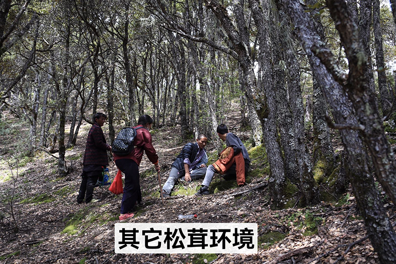 特殊的植被共生,松茸与青杠林(高山栎巴郎栎、黄背栎)形成独特的共生关系【与其它产区松茸依赖松树不同】,林下郁闭度60%~70%,阳光透过青杠林的缝隙为菌丝提供恰到好处的光热。