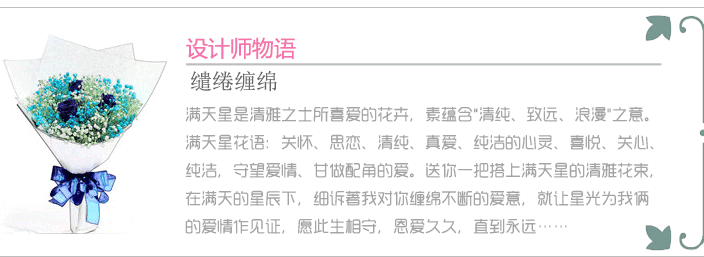 包装:浅灰色书面纸单面包装,系蓝色精美蝴蝶结 修饰。