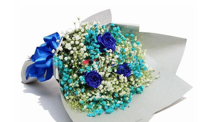 花材:3支蓝玫瑰(非天然玫瑰),适量白色,蓝 色满天星