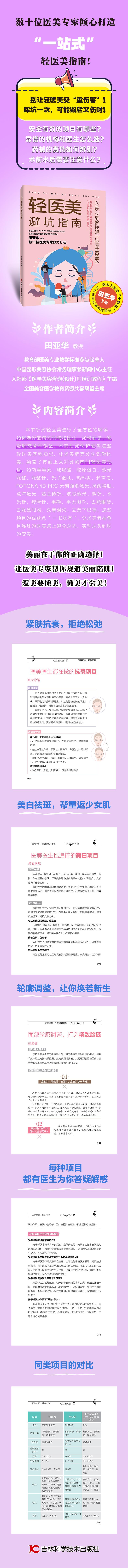 本书针对轻医美进行了全方位的解读: 如何选择靠谱的机构和医生,如何面诊,答疑解惑各种误区,术前后如何护理等这些轻医美基础知识,让求美者充分认识轻医美。涵盖了市面上大部分的热门轻医美项目,如肉毒毒素、玻尿酸、胶原蛋白、激光除皱、除皱针、光子嫩肤、热玛吉、超声刀、Fotona 4D Pro无创面雕激光、线雕、果酸换肤、点阵激光、黄金微针、皮秒激光、微针、水光针、瘦脸针、丰额、丰太阳穴、去除眼袋、去除黑眼圈、改善泪沟、去双下巴等,这些项目的优缺点“一书尽有”,让求美者在鱼目混珠的医美路上避免踩坑,实现从头到脚的变美。