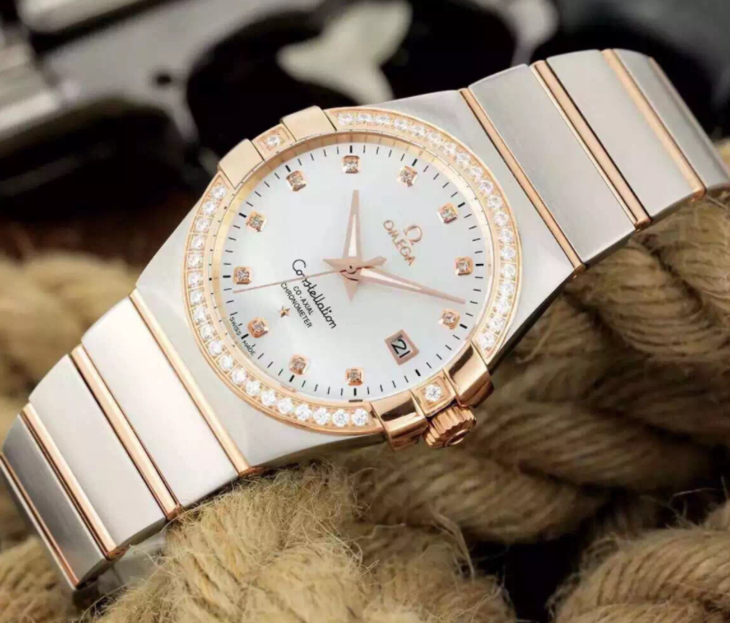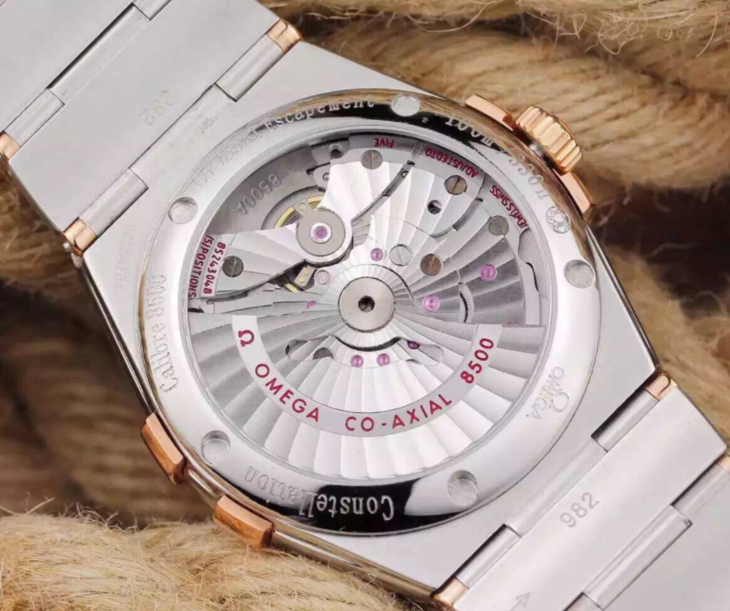 V6欧米茄星座系列123.20.38.21.52.002机械男士手表,大号38.5mm,小号35.5mm。精钢镀18k表链表壳,8500全自动机械机芯,蓝宝石镜面,具备诸多新颖设计元素。