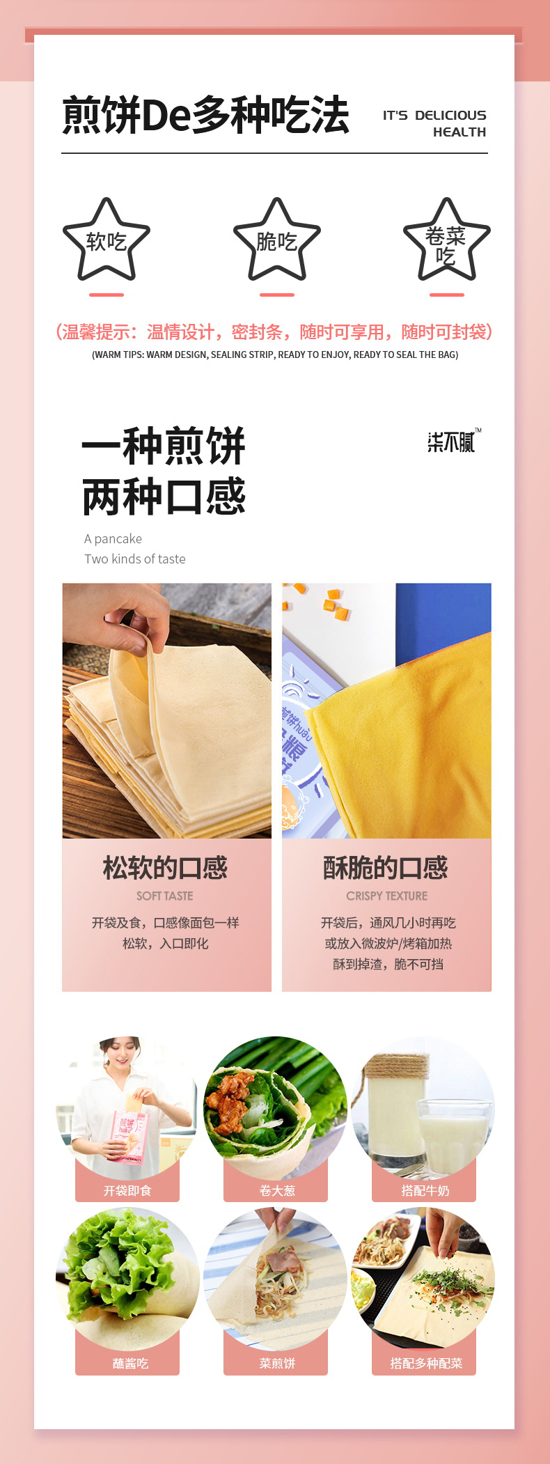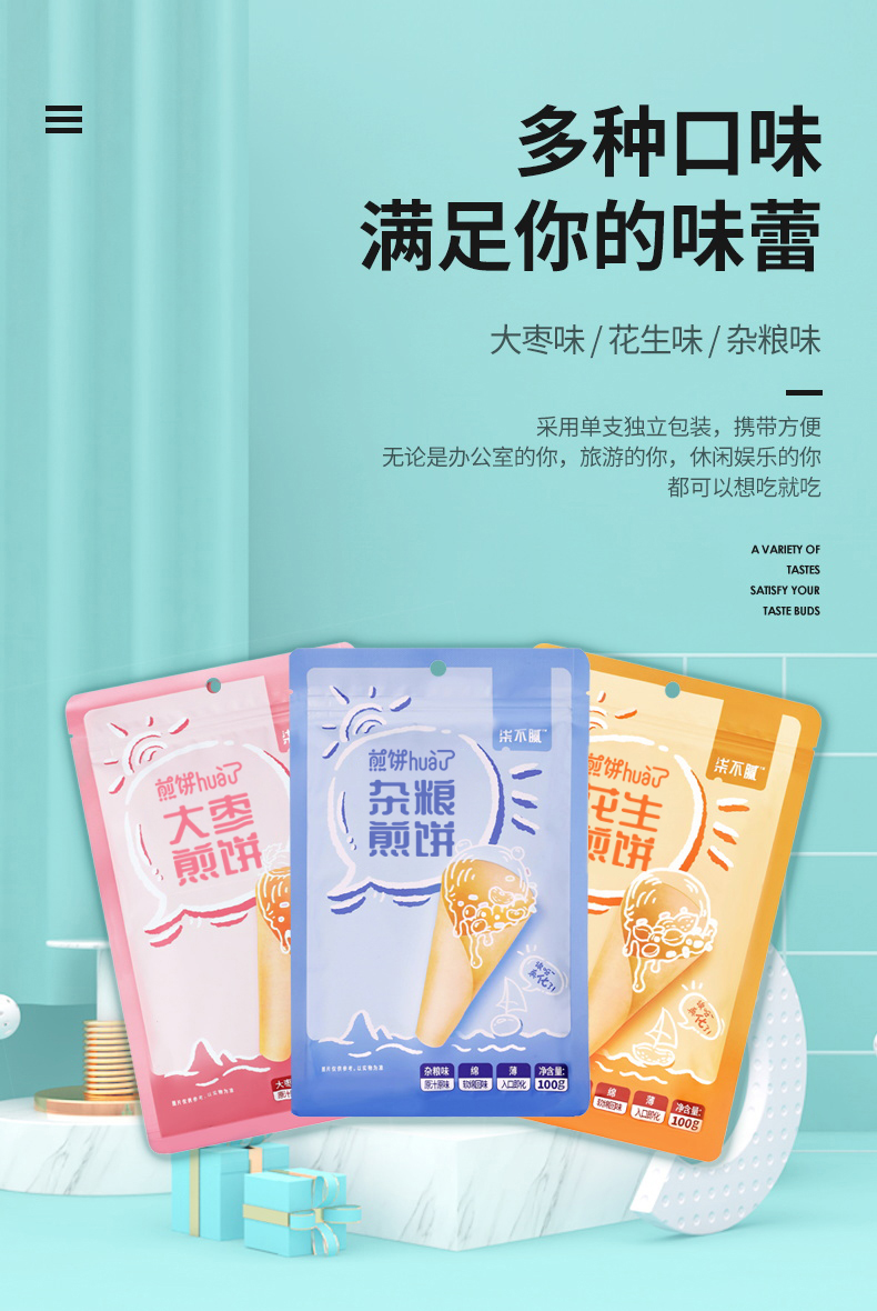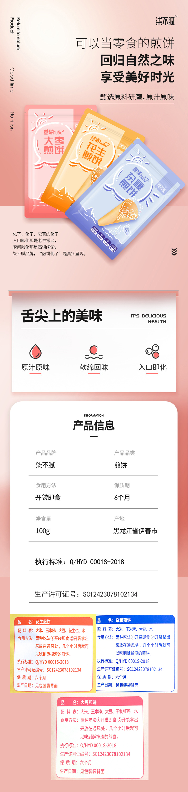 口味:红枣煎饼、花生煎饼、杂粮煎饼(40袋装固定一种口味发货,其余规格为默认三种口味混合发货)