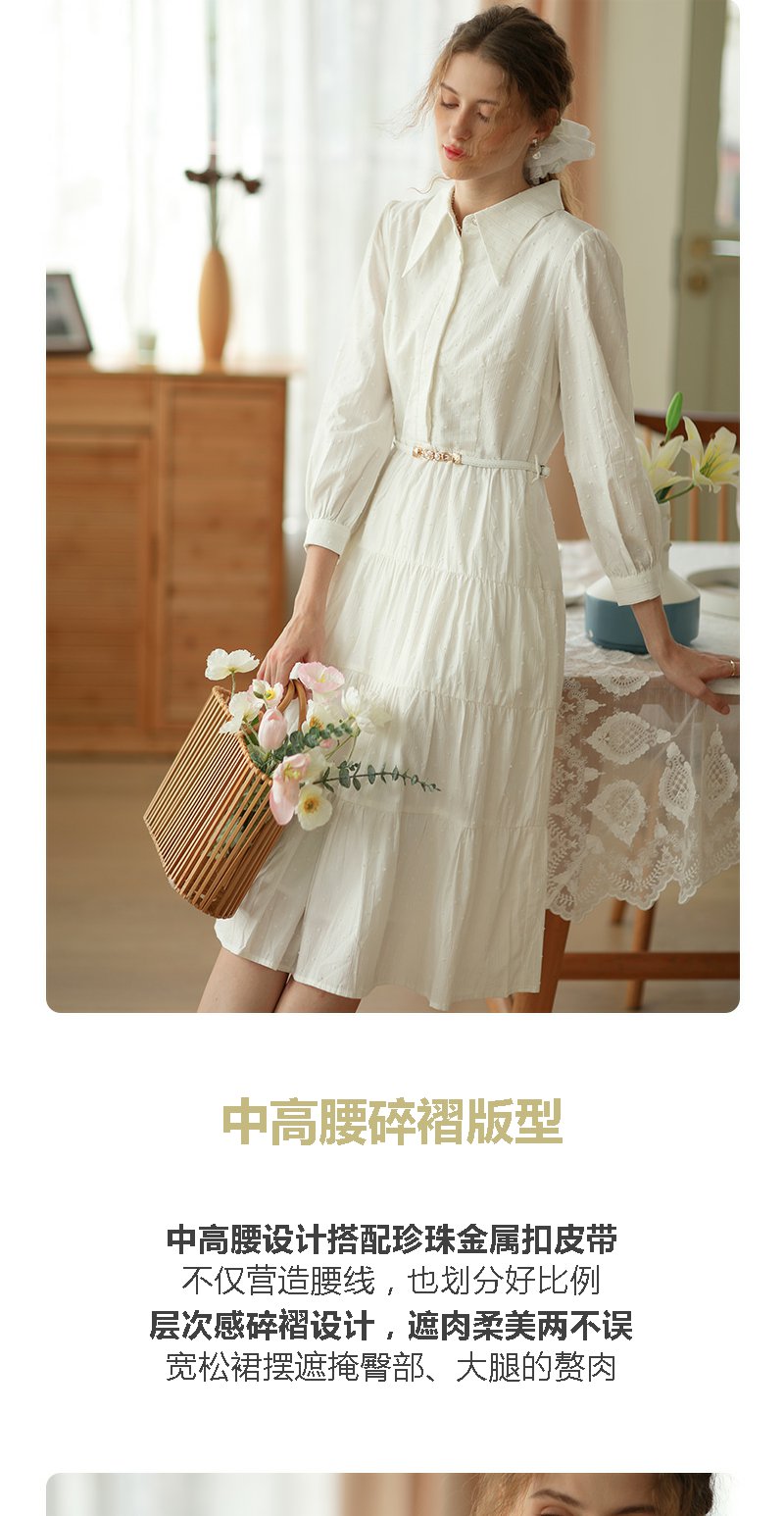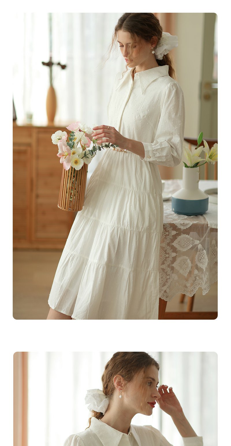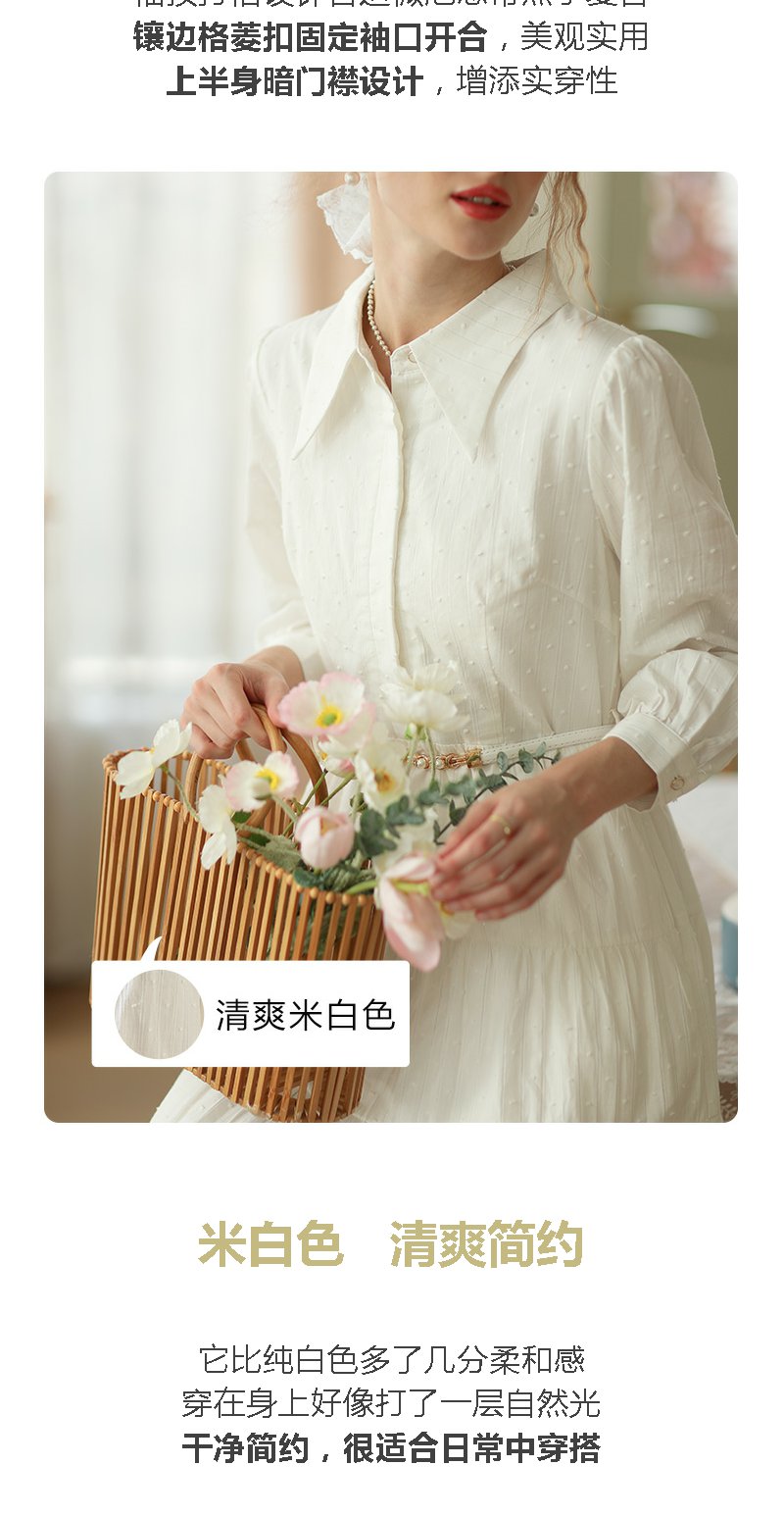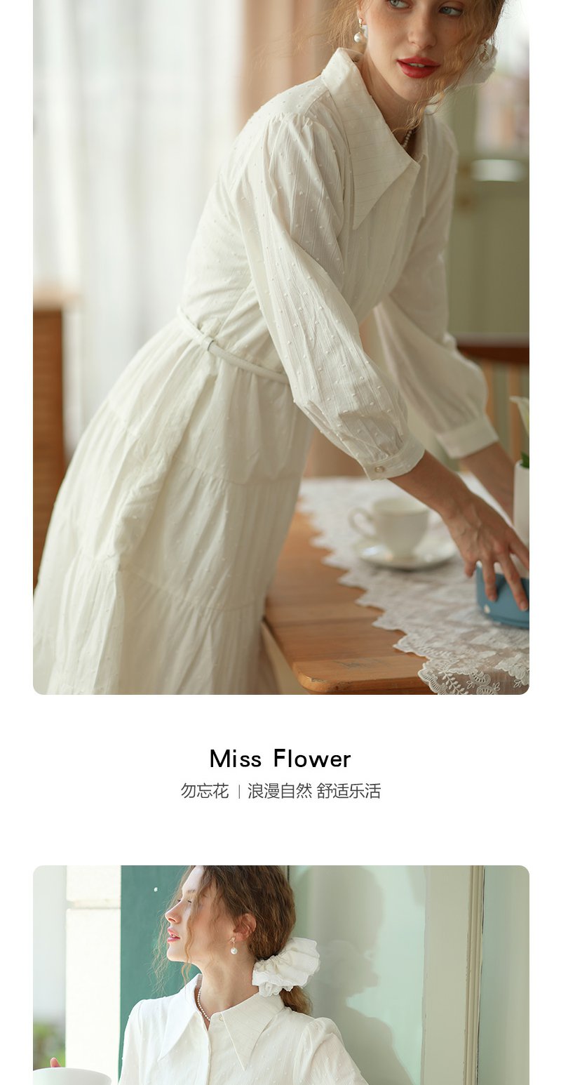 勿忘花米白色纯棉法式衬衫连衣裙春季新款长裙温柔淑女裙子