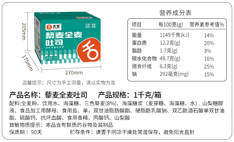 【舌里藜麦全麦吐司1000g/箱】 独立包装 一箱约20小袋