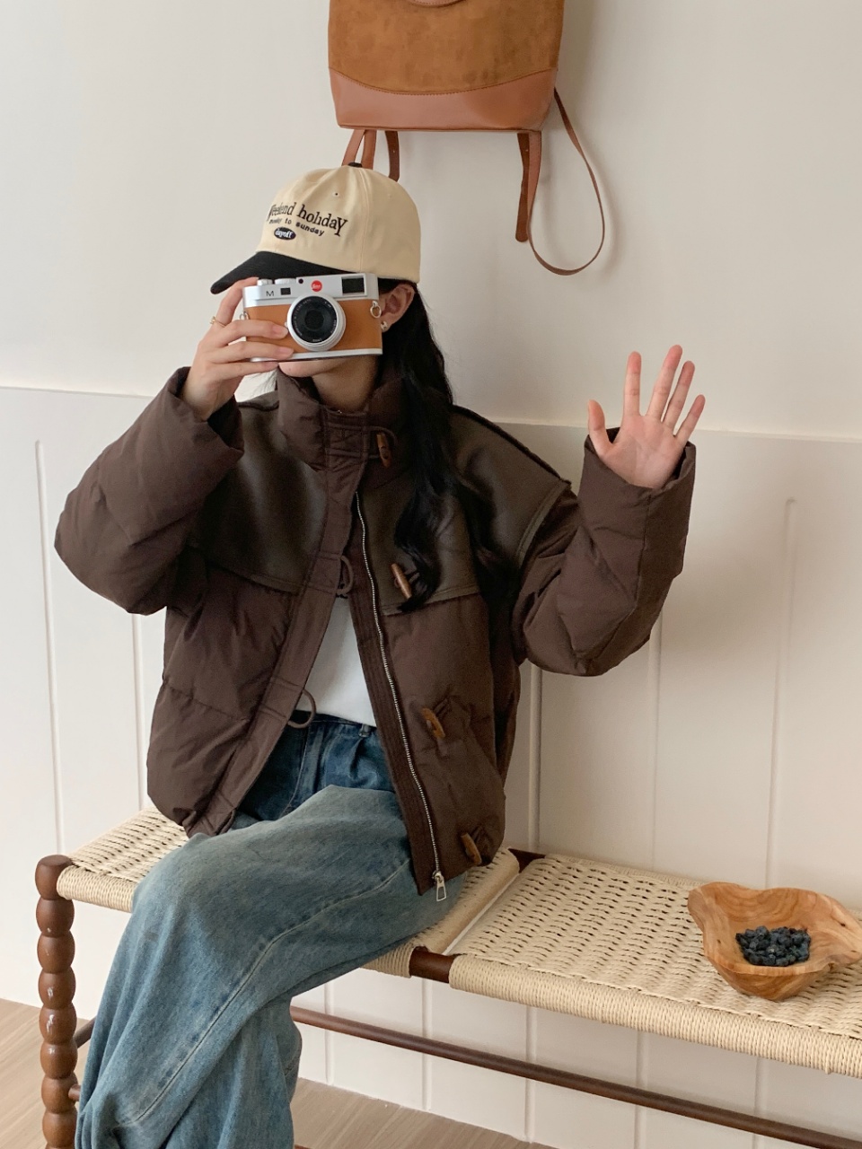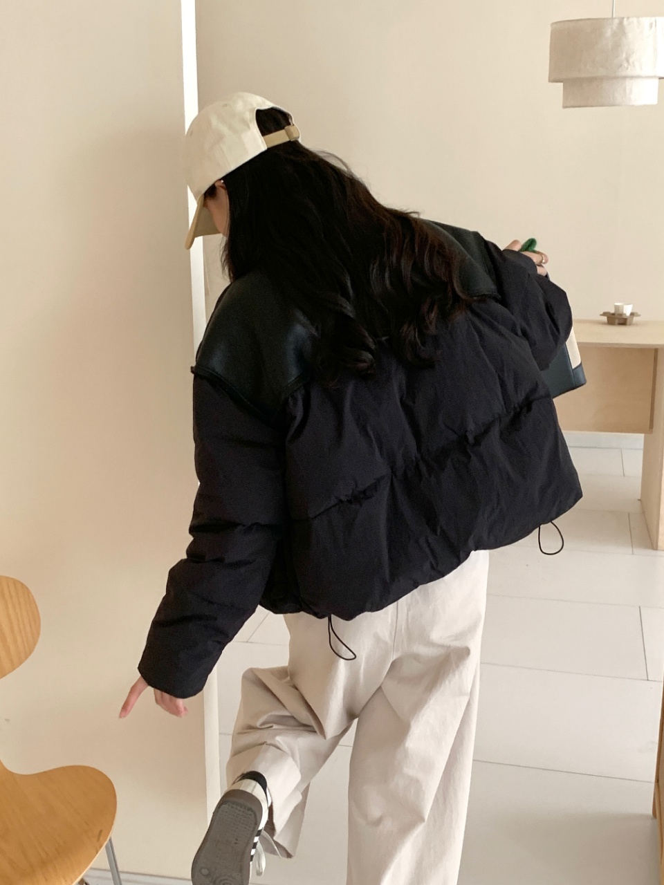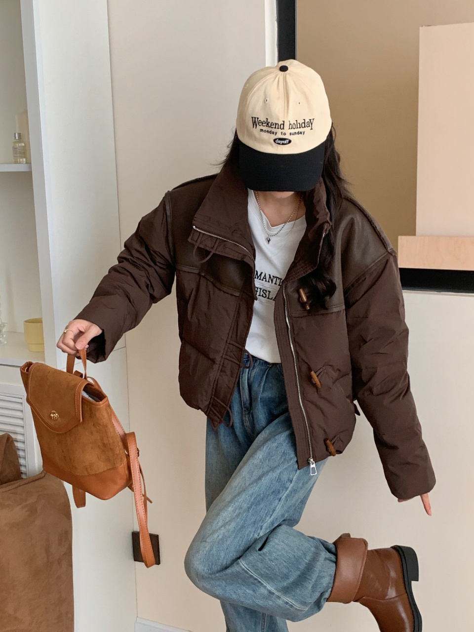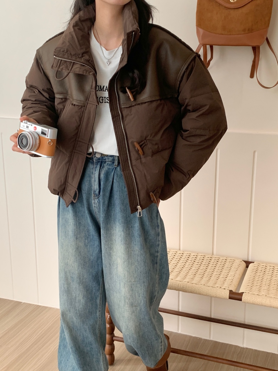 【YW】无忧购“清仓福利”韩版简约小众设计感50%白鸭绒立领拼皮羽绒外套2408(截单后7天发货)25年清仓捡漏