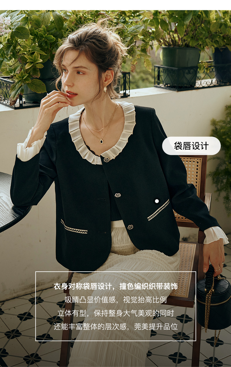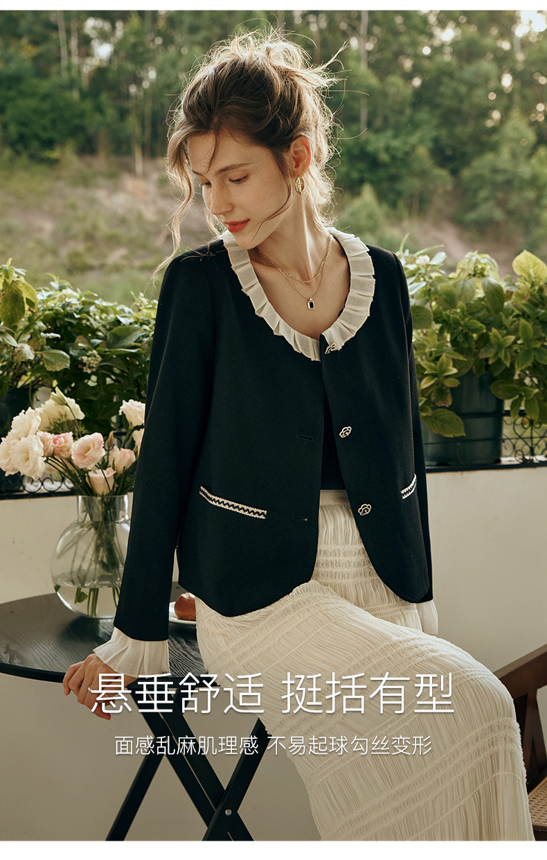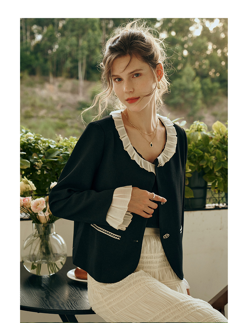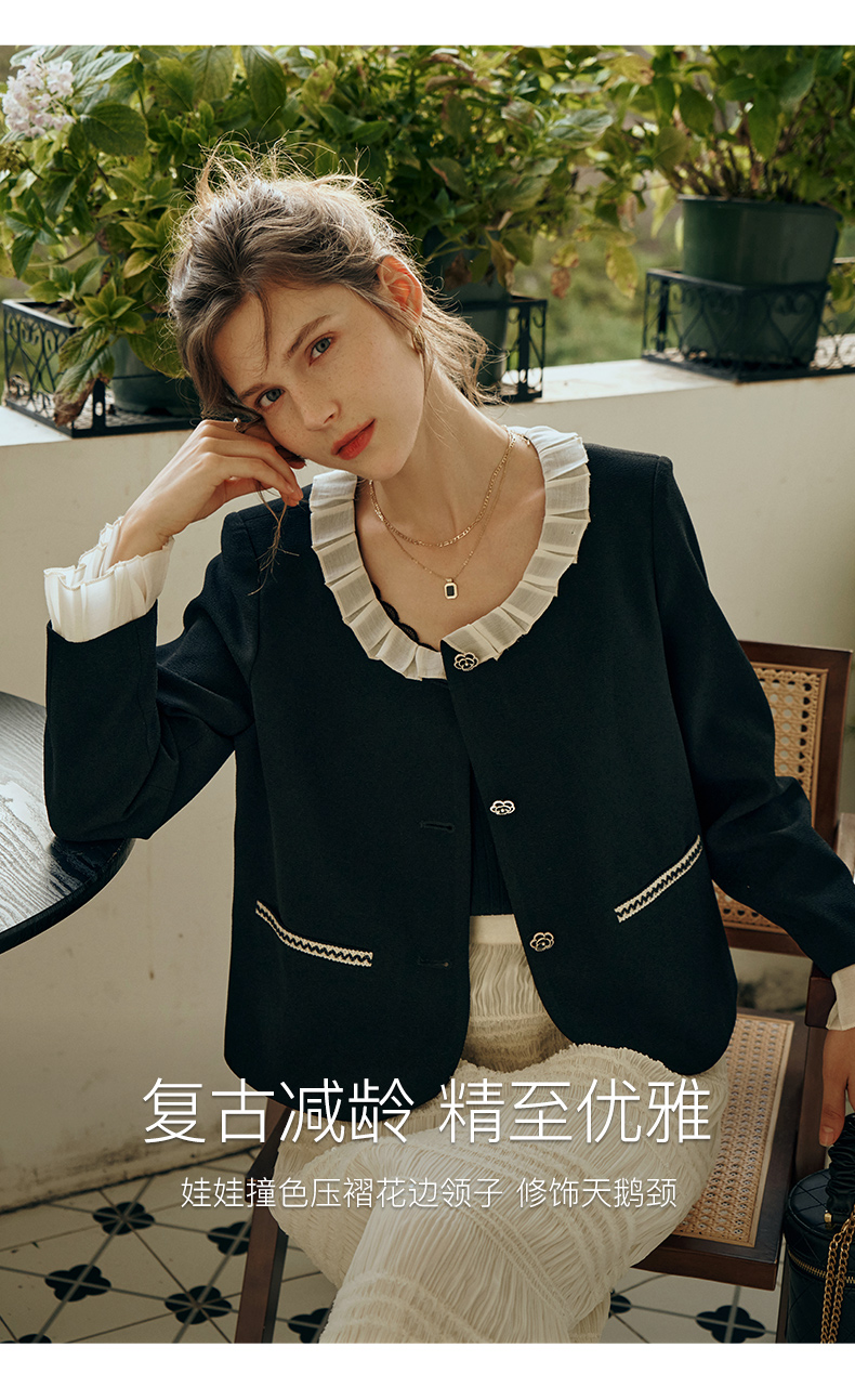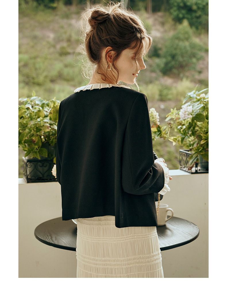 OLrain欧芮儿黑色短外套初秋2023年新款法式名媛娃娃领花边领外套