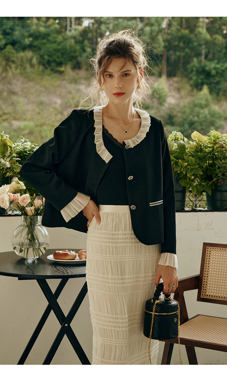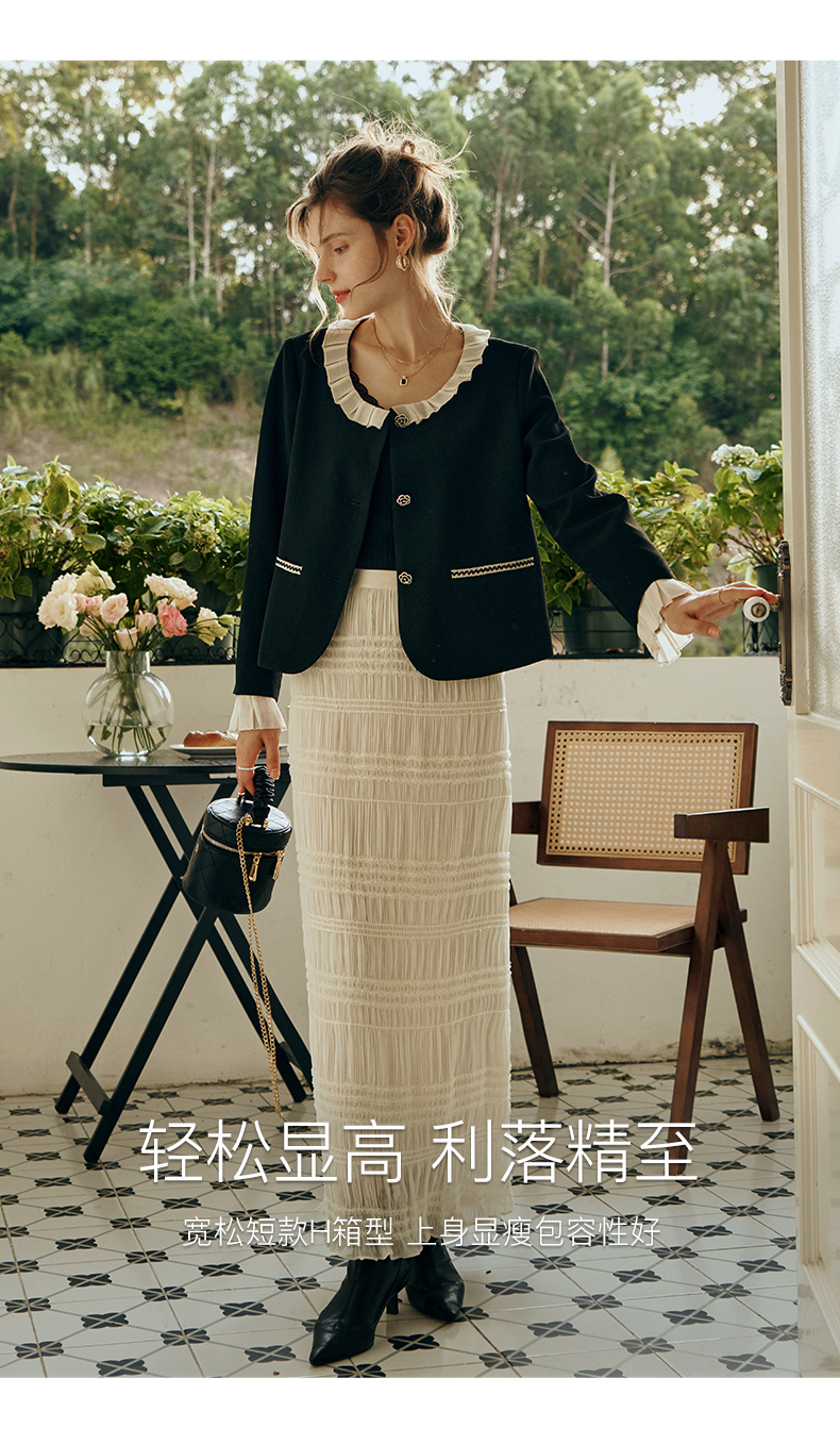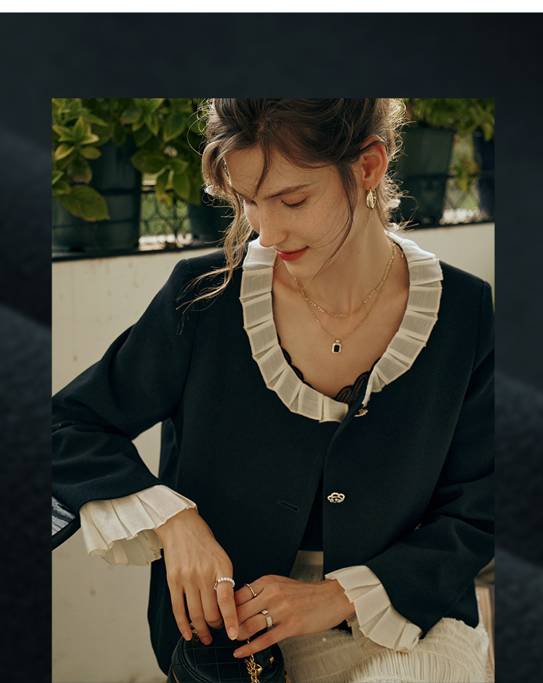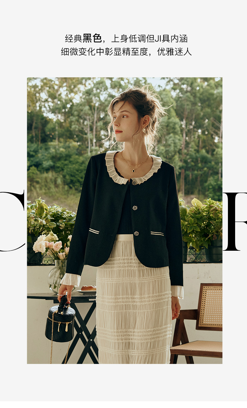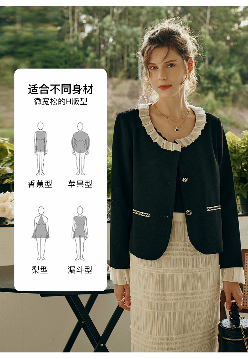 OLrain欧芮儿黑色短外套初秋2023年新款法式名媛娃娃领花边领外套