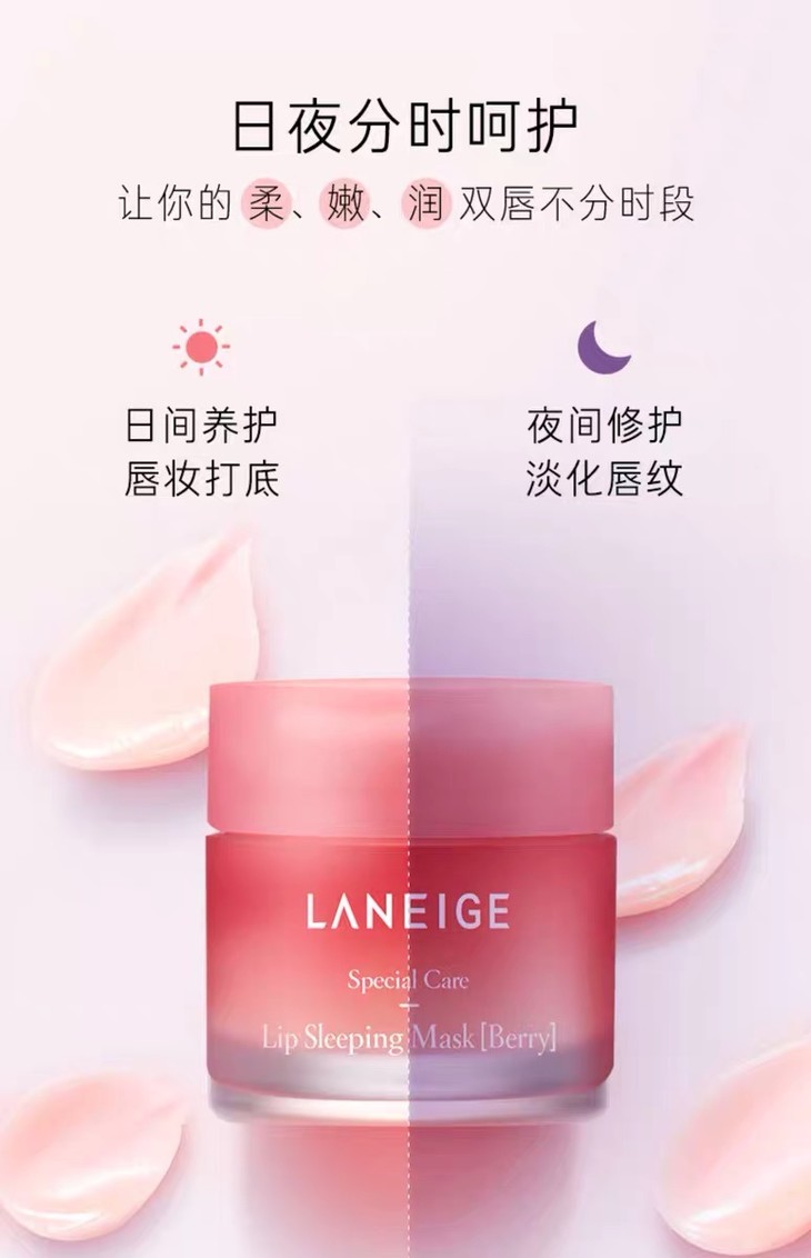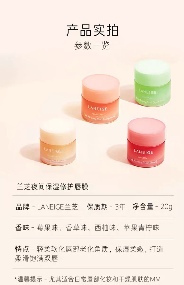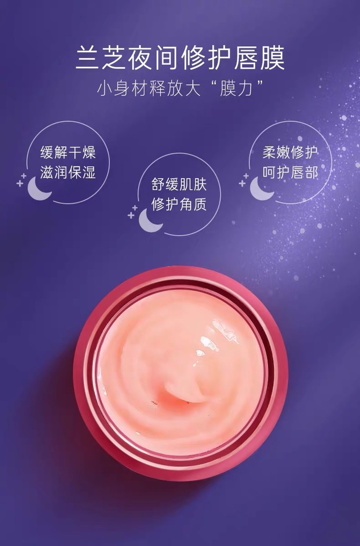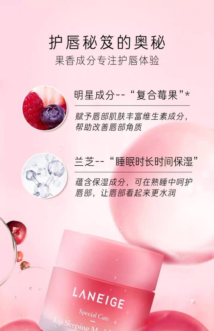 3、功效:兰芝睡眠唇膜,冬天嘴唇爱用好物。能用很久小小的一罐唇膜,用处真的很大嘴唇会干裂脱皮是因为缺乏维生素C而兰芝唇膜里恰含富有VC蓝莓、草莓、树莓,它不仅可以当作润唇膏还是优质的夜间唇部护理产品在睡前涂抹一层,第二天早起嘴唇就会非常润对于淡化唇色,抚平唇纹效果非常好!