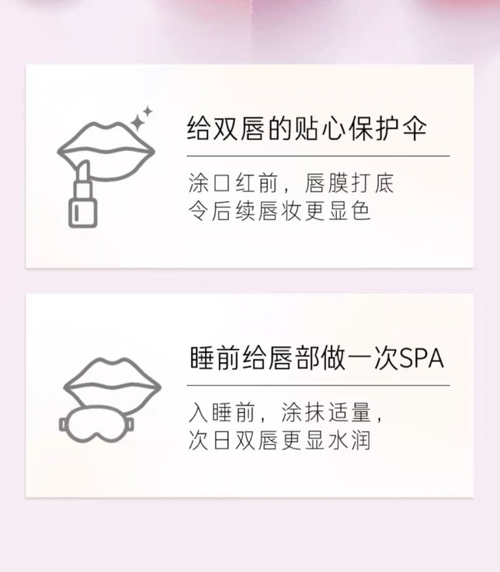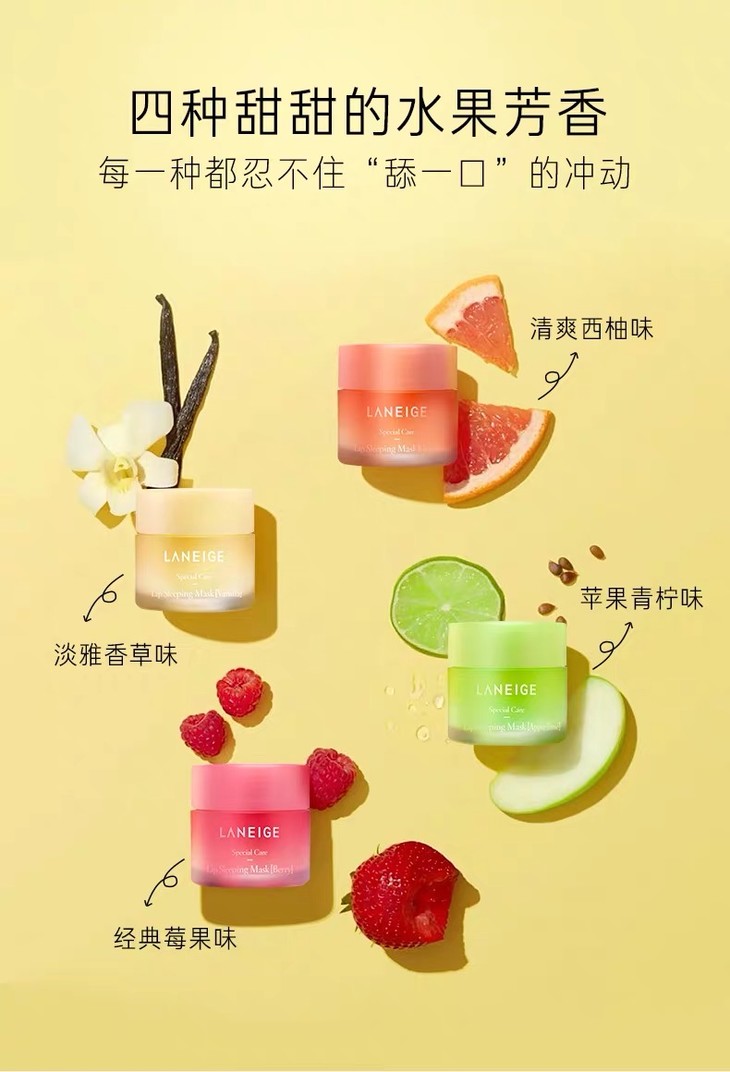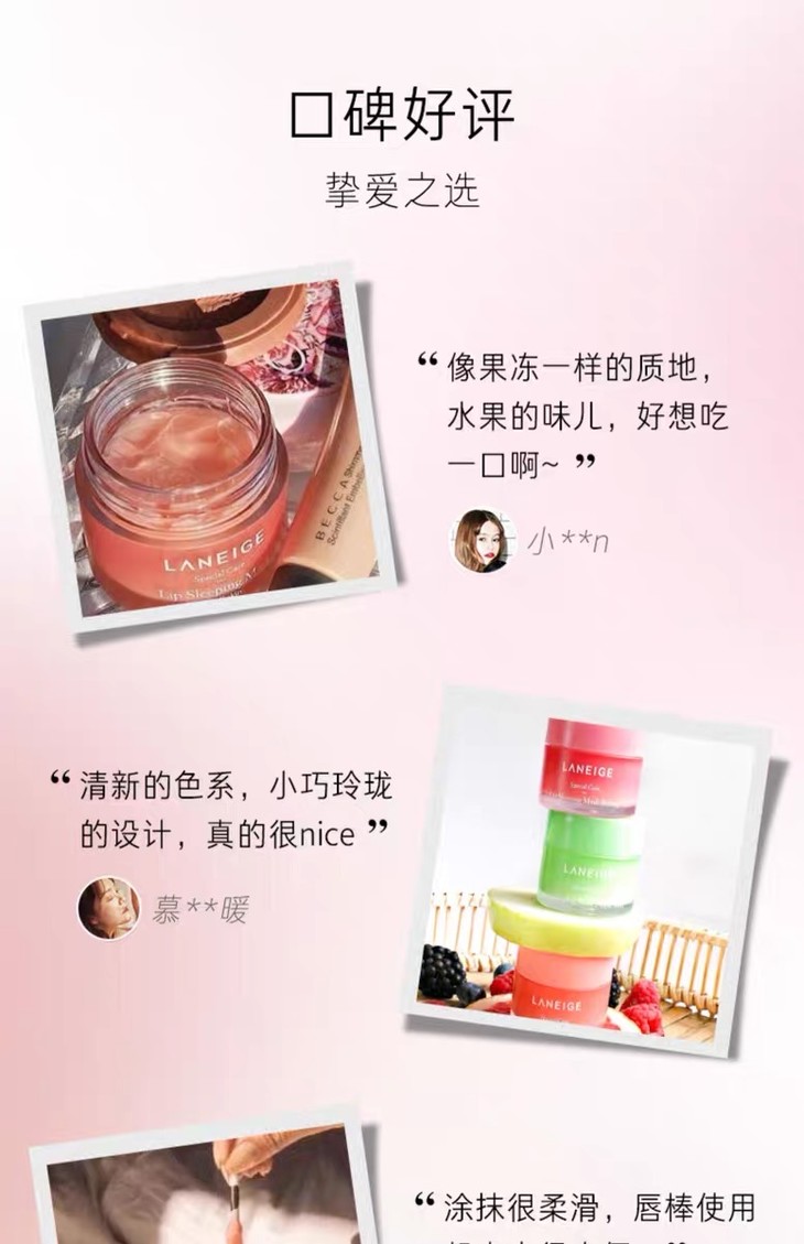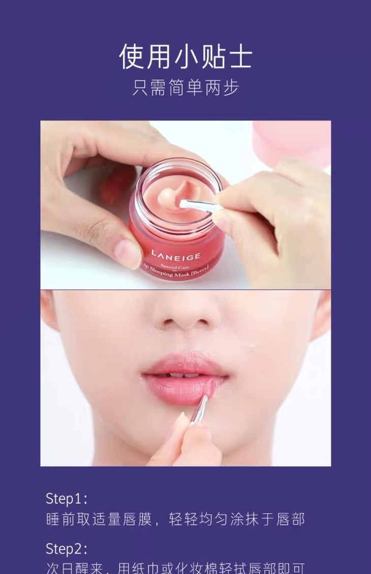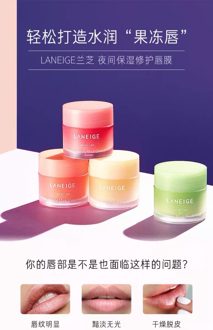3、功效:兰芝睡眠唇膜,冬天嘴唇爱用好物。能用很久小小的一罐唇膜,用处真的很大嘴唇会干裂脱皮是因为缺乏维生素C而兰芝唇膜里恰含富有VC蓝莓、草莓、树莓,它不仅可以当作润唇膏还是优质的夜间唇部护理产品在睡前涂抹一层,第二天早起嘴唇就会非常润对于淡化唇色,抚平唇纹效果非常好!