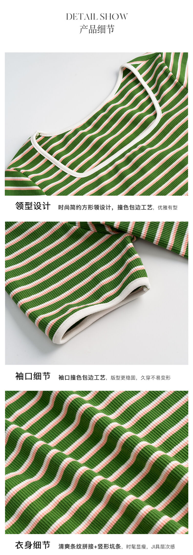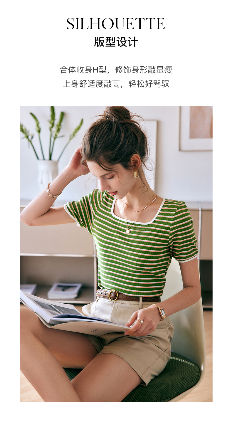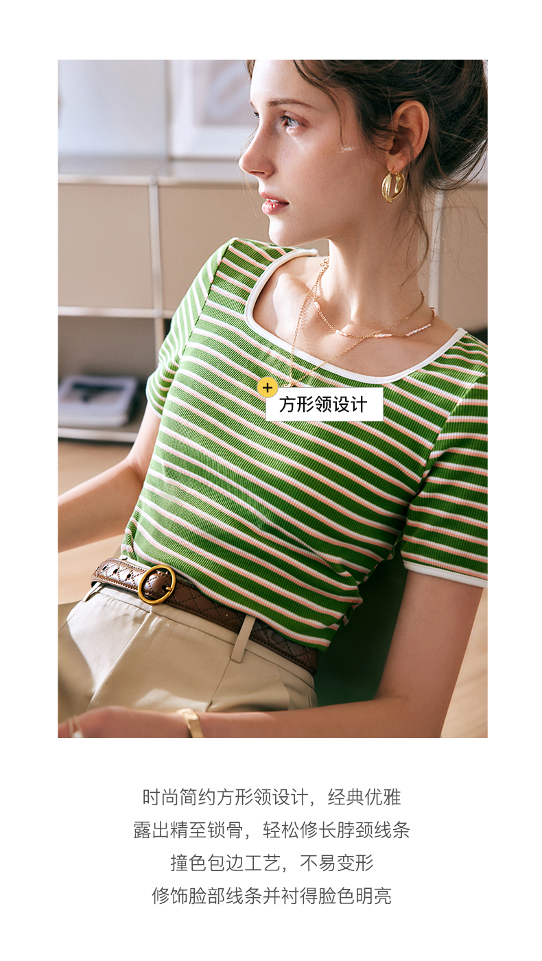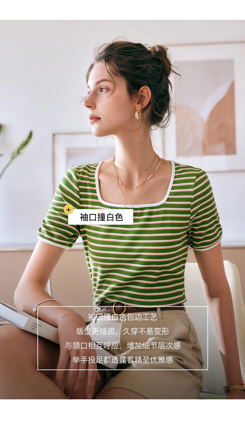 欧芮儿条纹短袖T恤女夏季2022新款修身时尚方领撞色冰爽薄款上衣