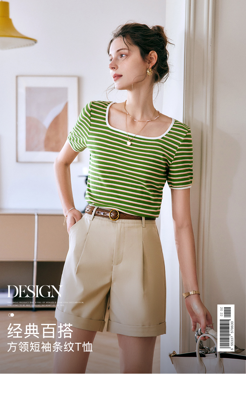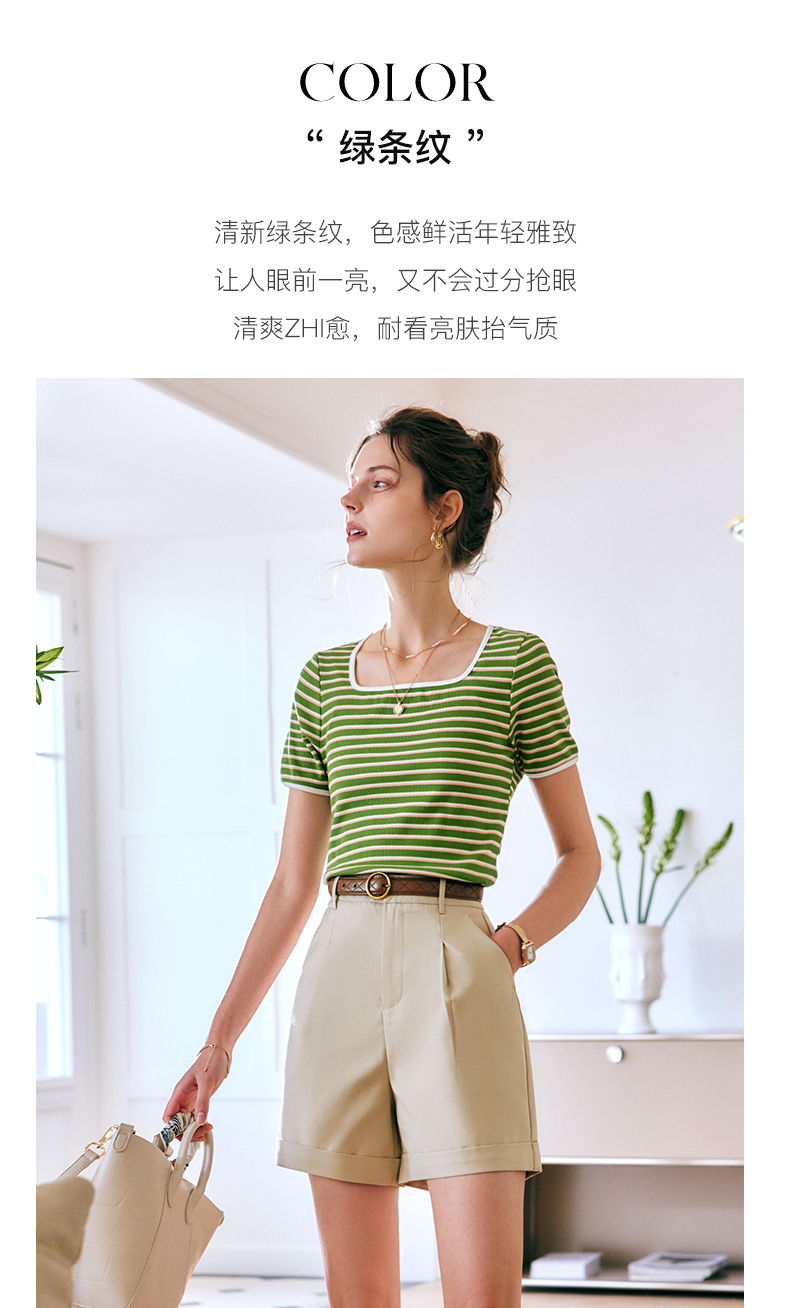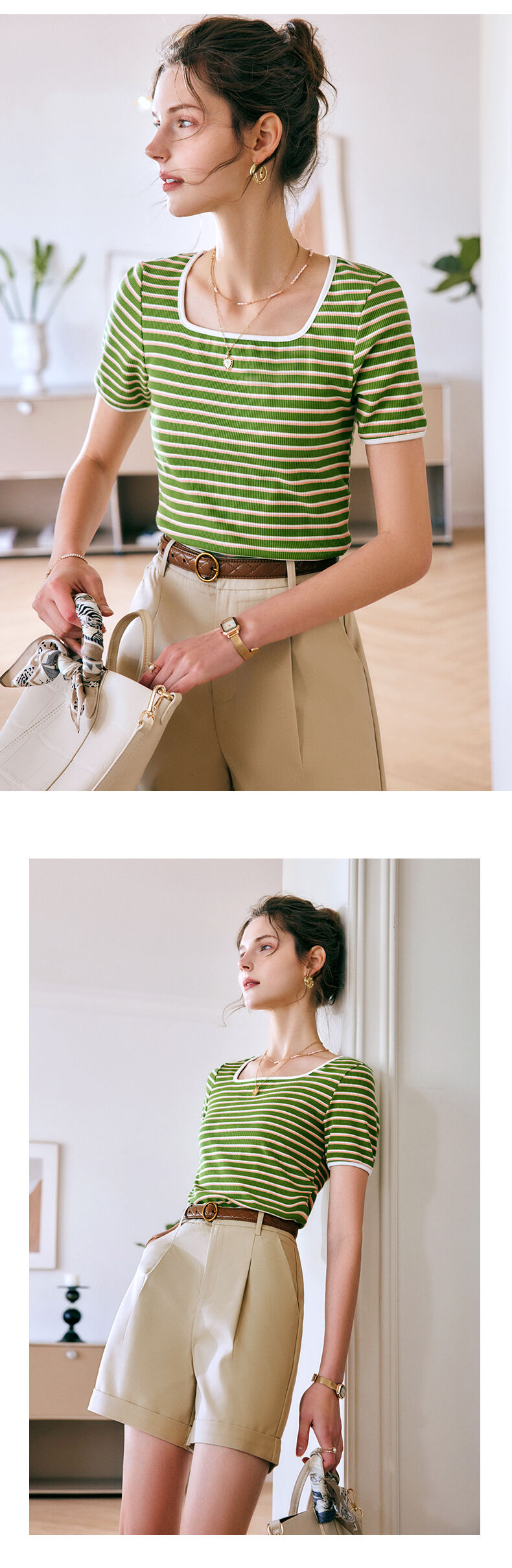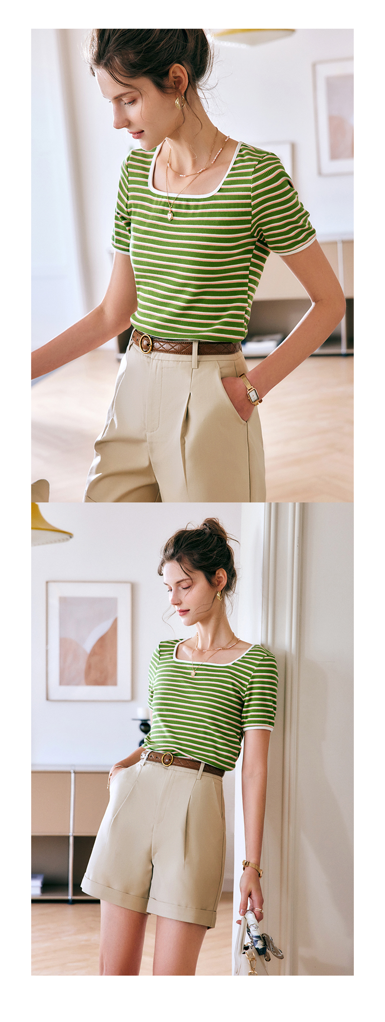 欧芮儿条纹短袖T恤女夏季2022新款修身时尚方领撞色冰爽薄款上衣