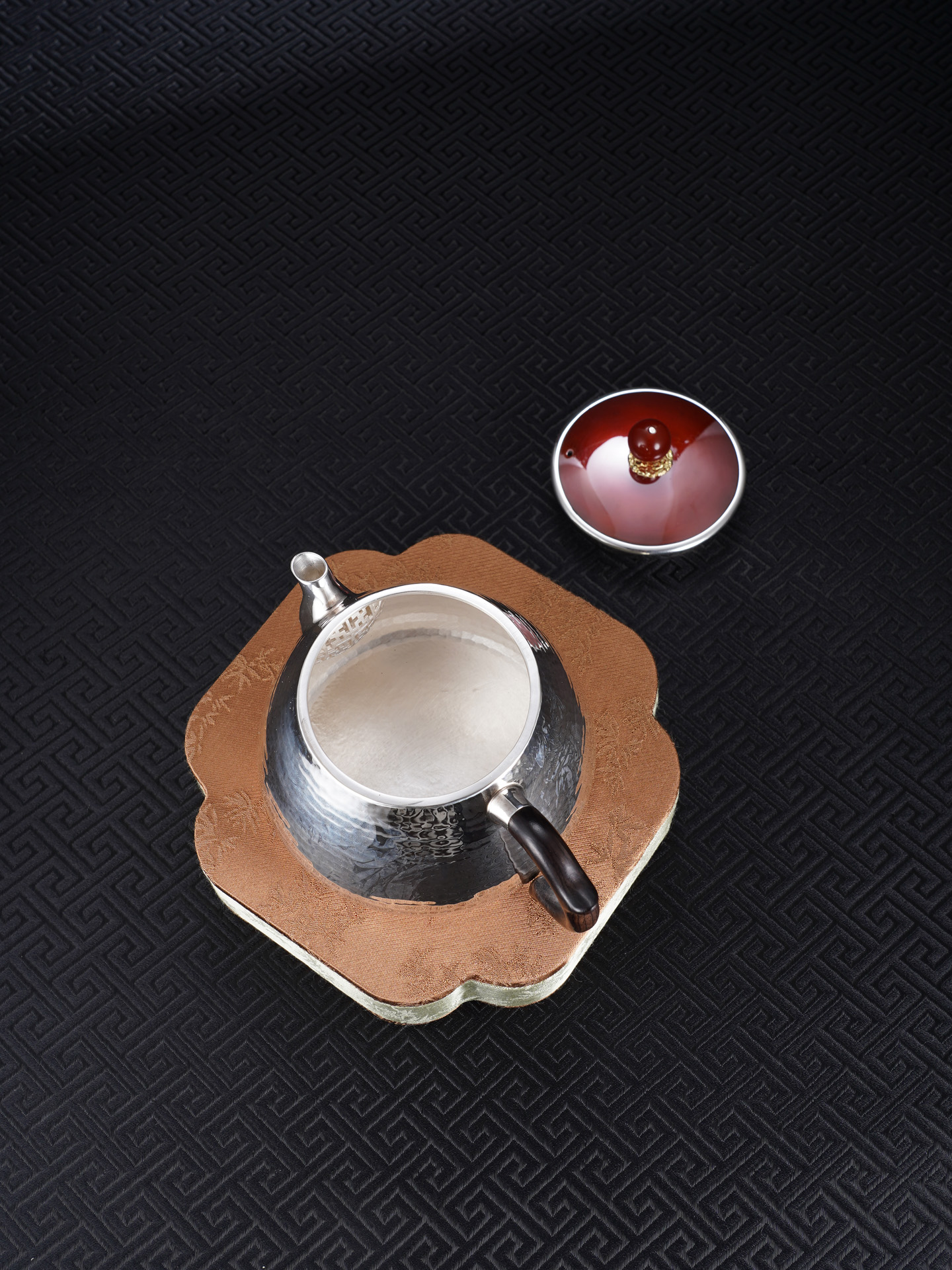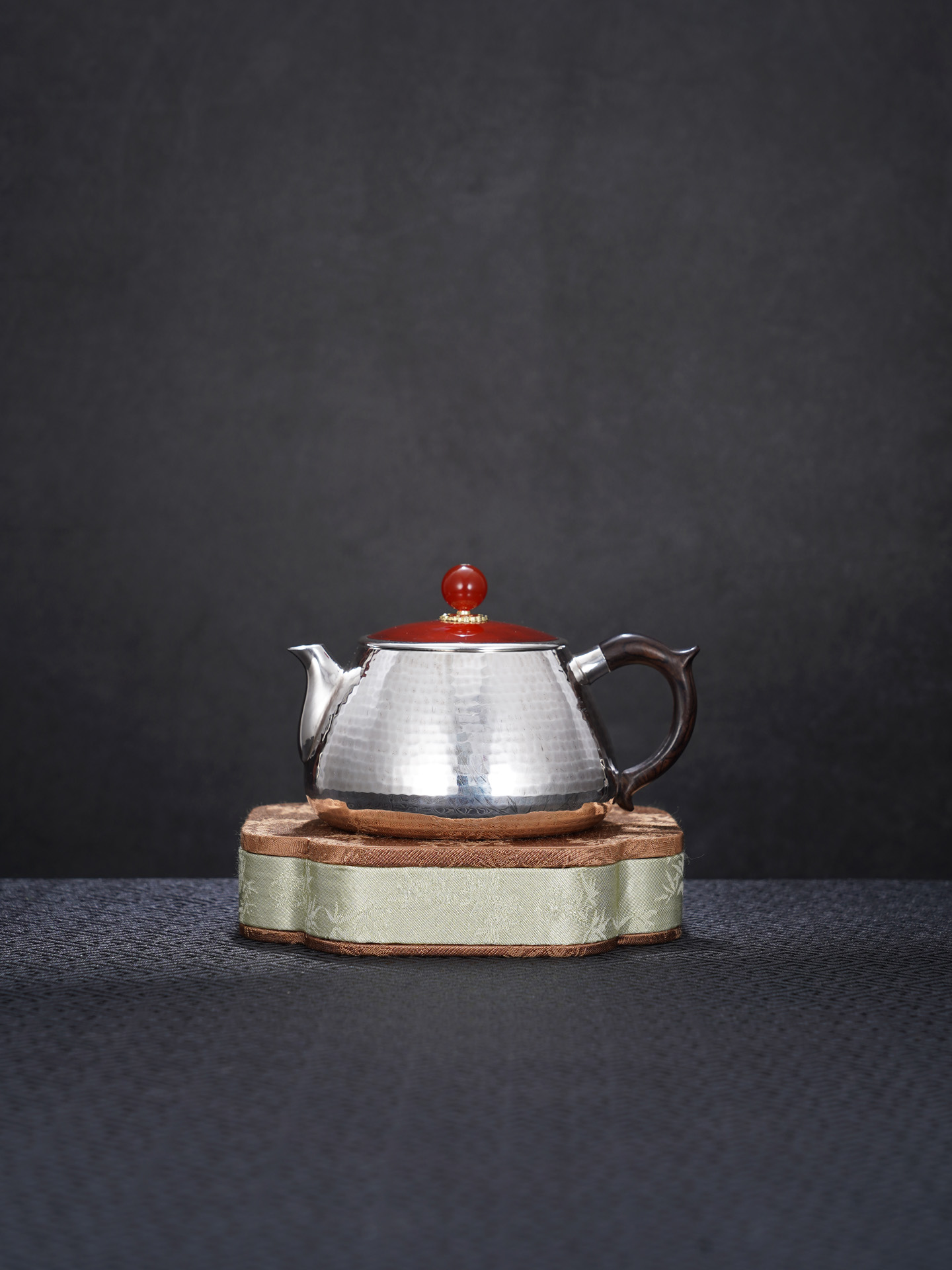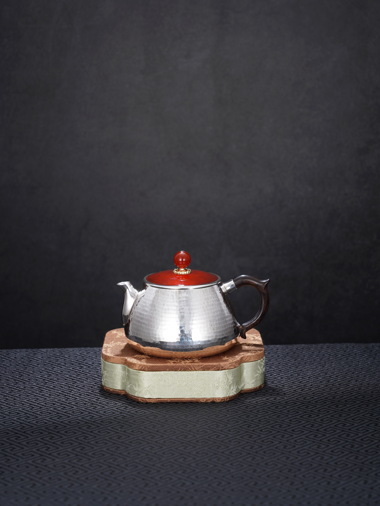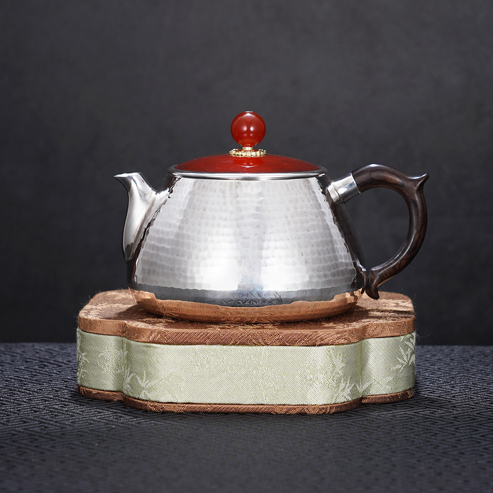 【寓意】:壶身以纯银锻造,温润如月,象征纯净与永恒;壶盖与壶摘以朱红点睛,取“鸿运当头”之吉意。寄寓生活红火、福运代代相传。