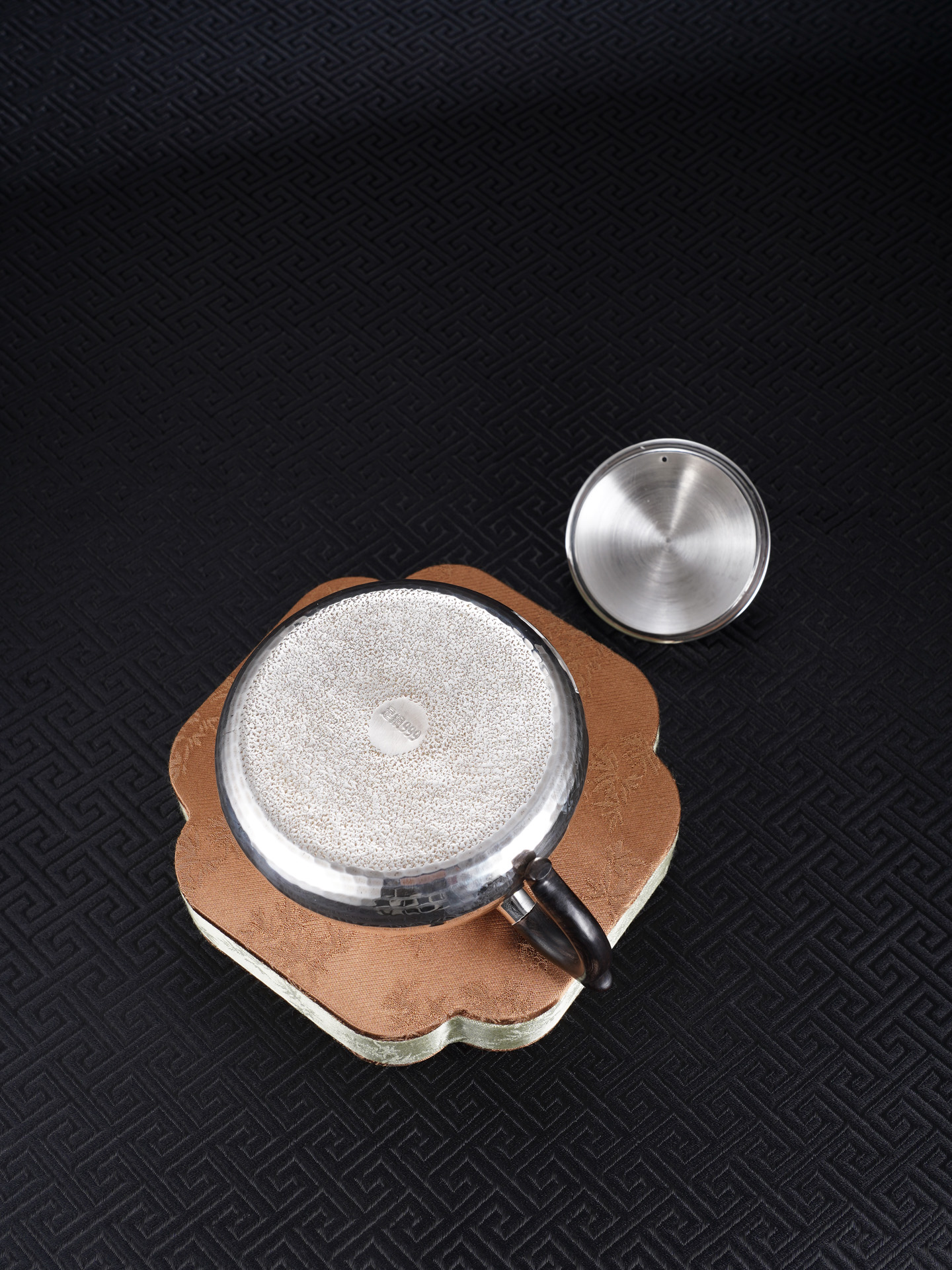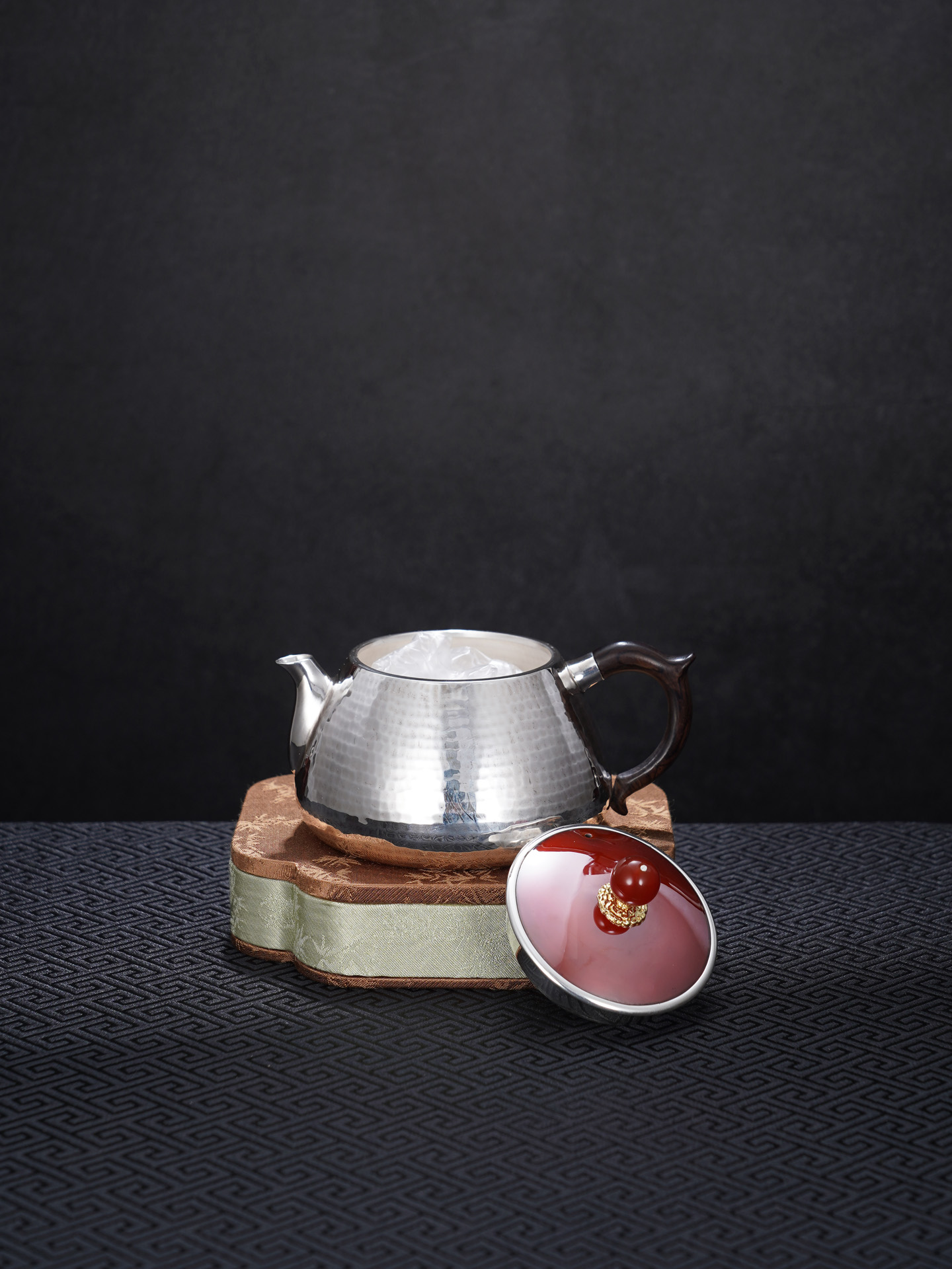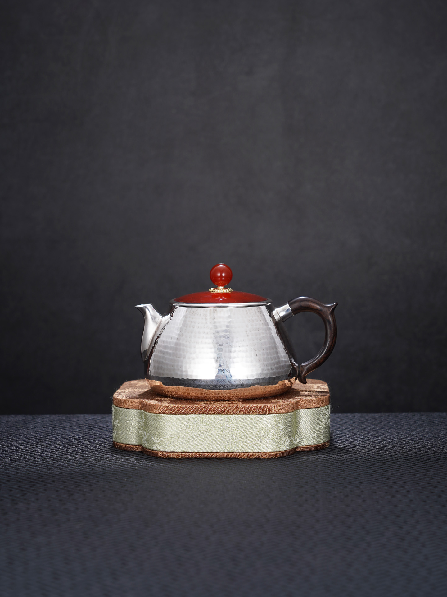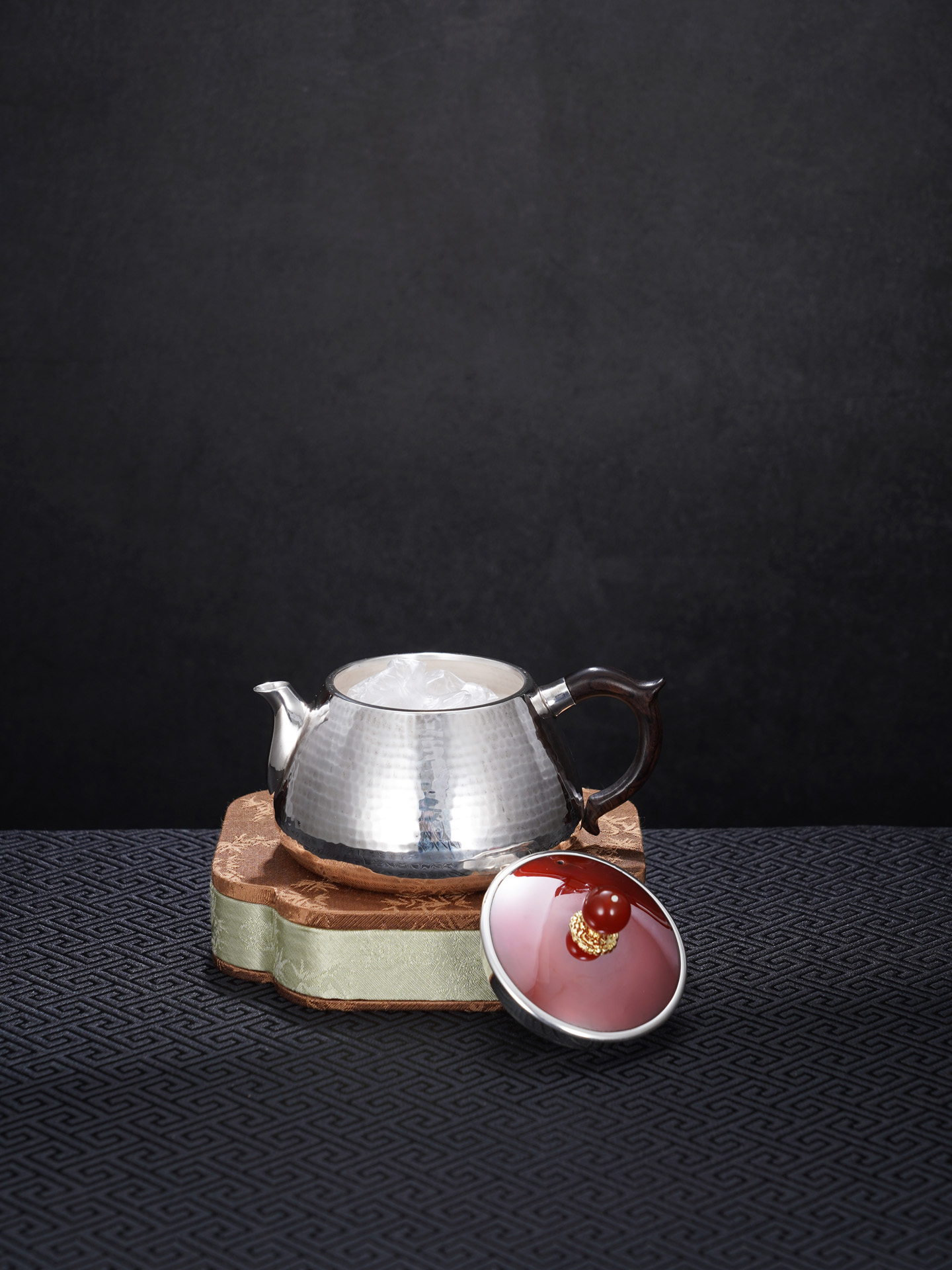 【寓意】:壶身以纯银锻造,温润如月,象征纯净与永恒;壶盖与壶摘以朱红点睛,取“鸿运当头”之吉意。寄寓生活红火、福运代代相传。