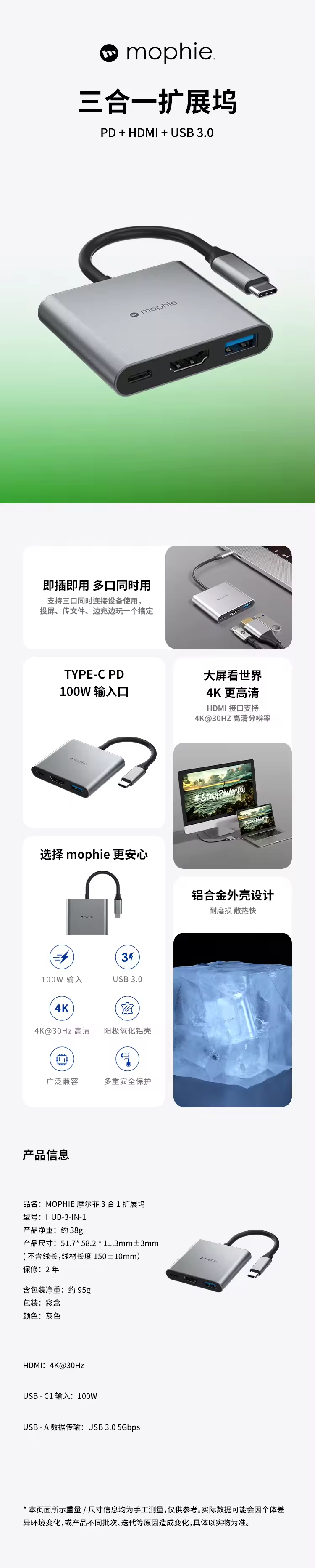 MOPHIE摩尔菲 3 合 1 扩展坞(PD100w+USB3.0+HDMI4K)