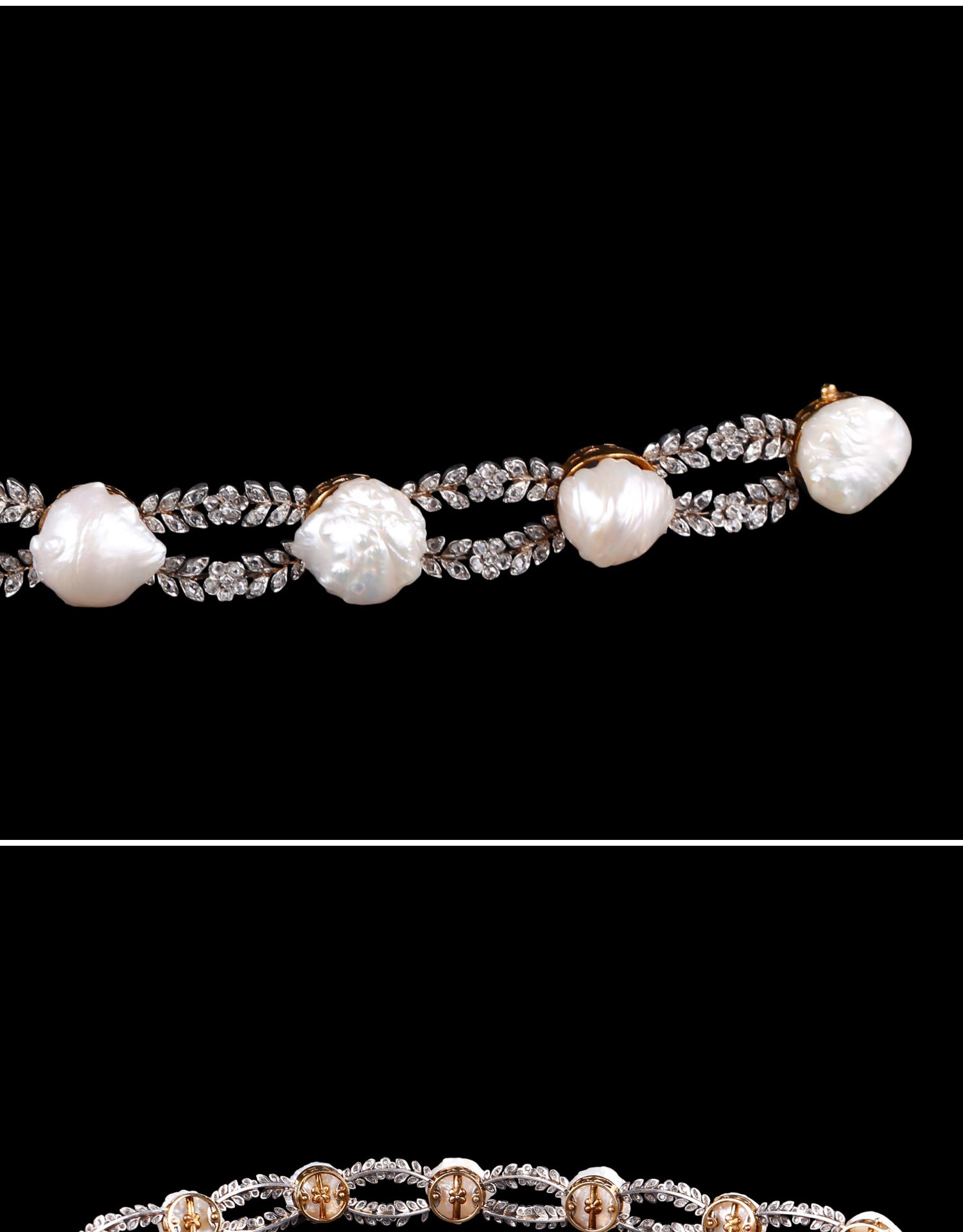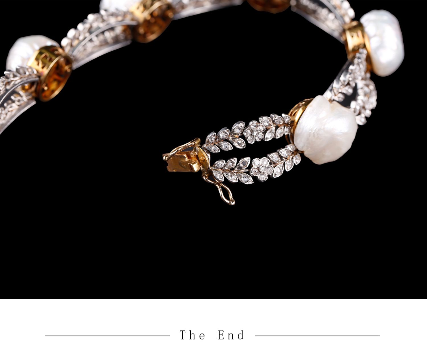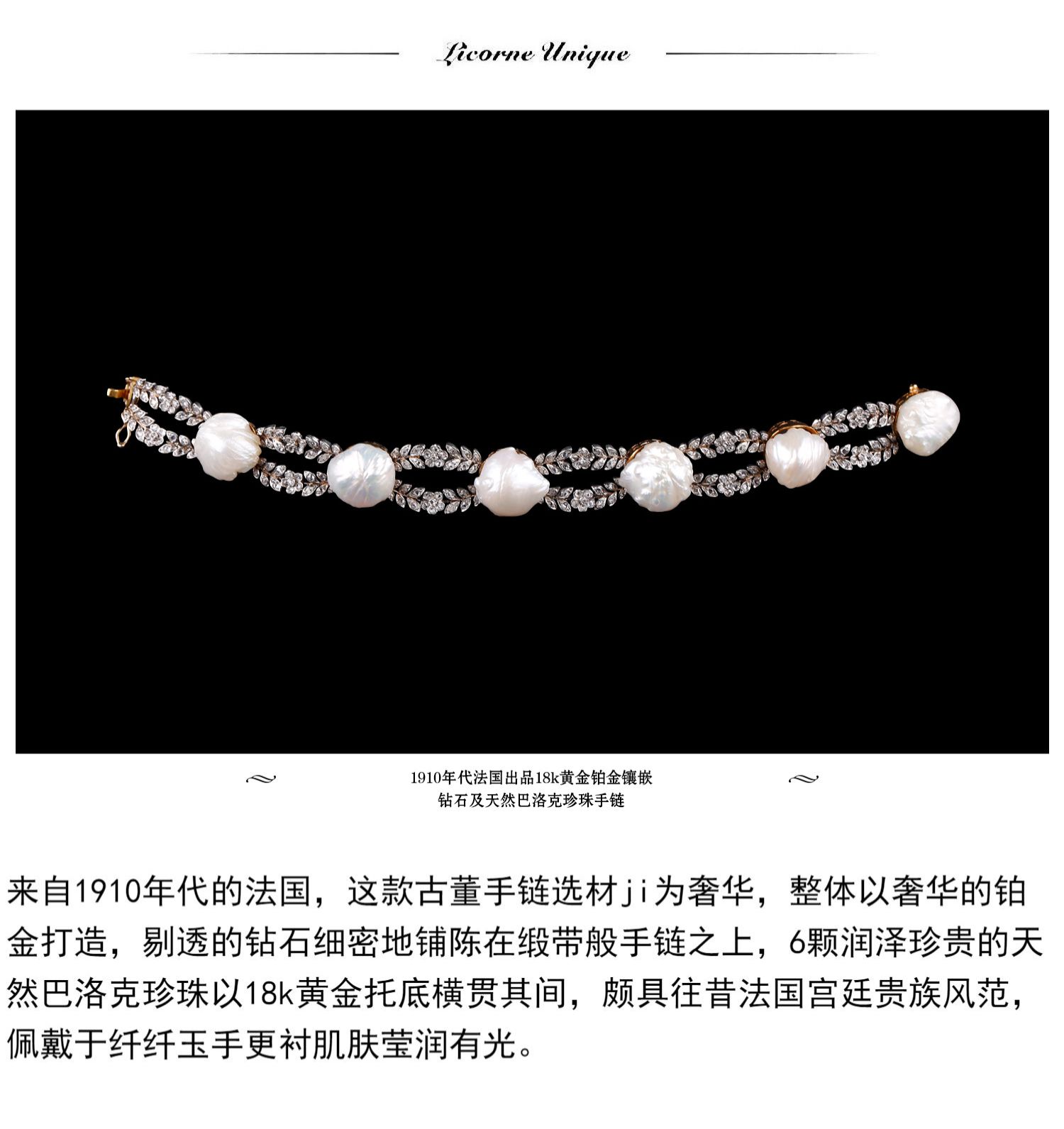 独角鹿西洋古董珠宝法国18K黄金铂金镶钻石天然巴洛克珍珠手链