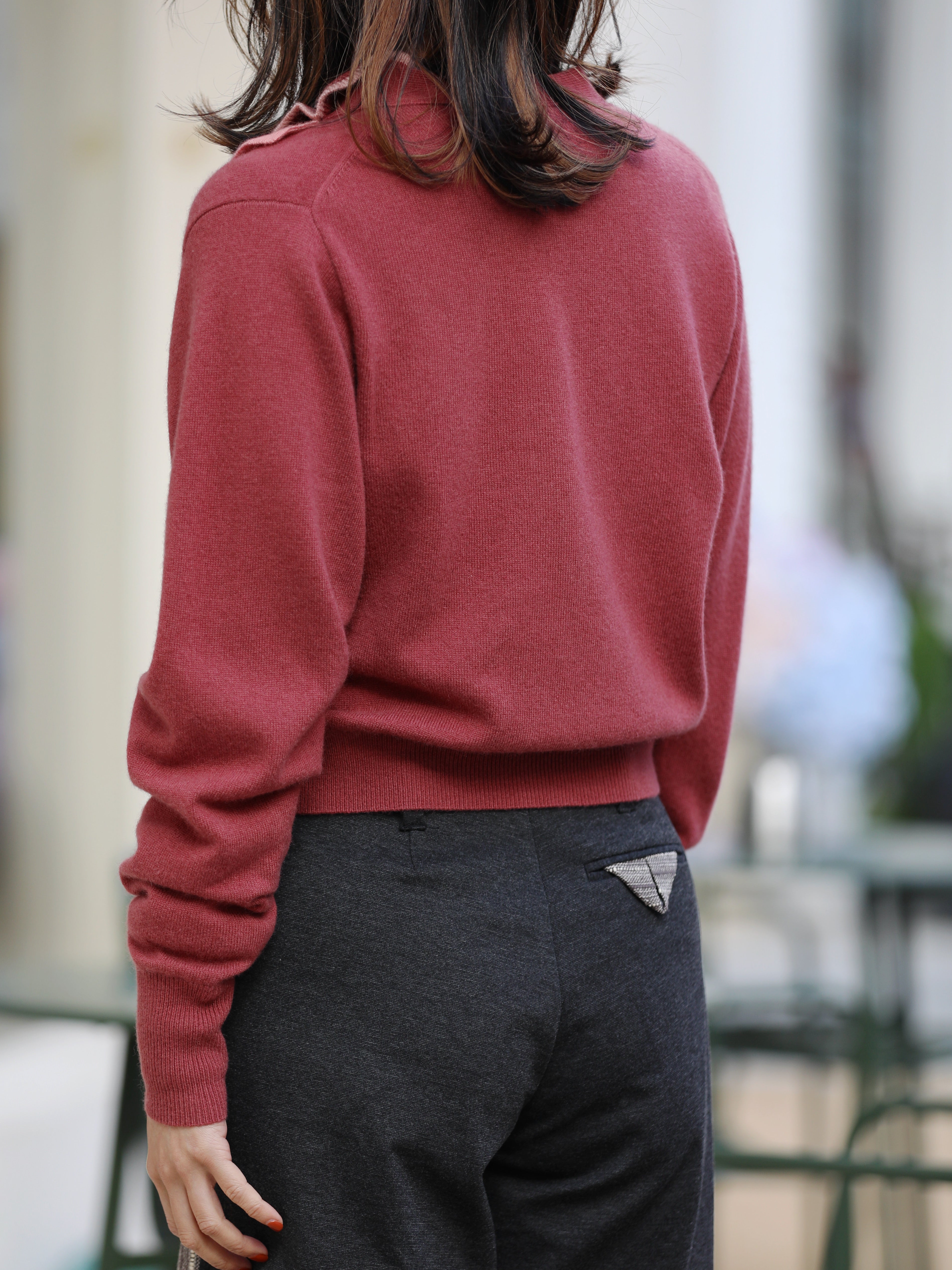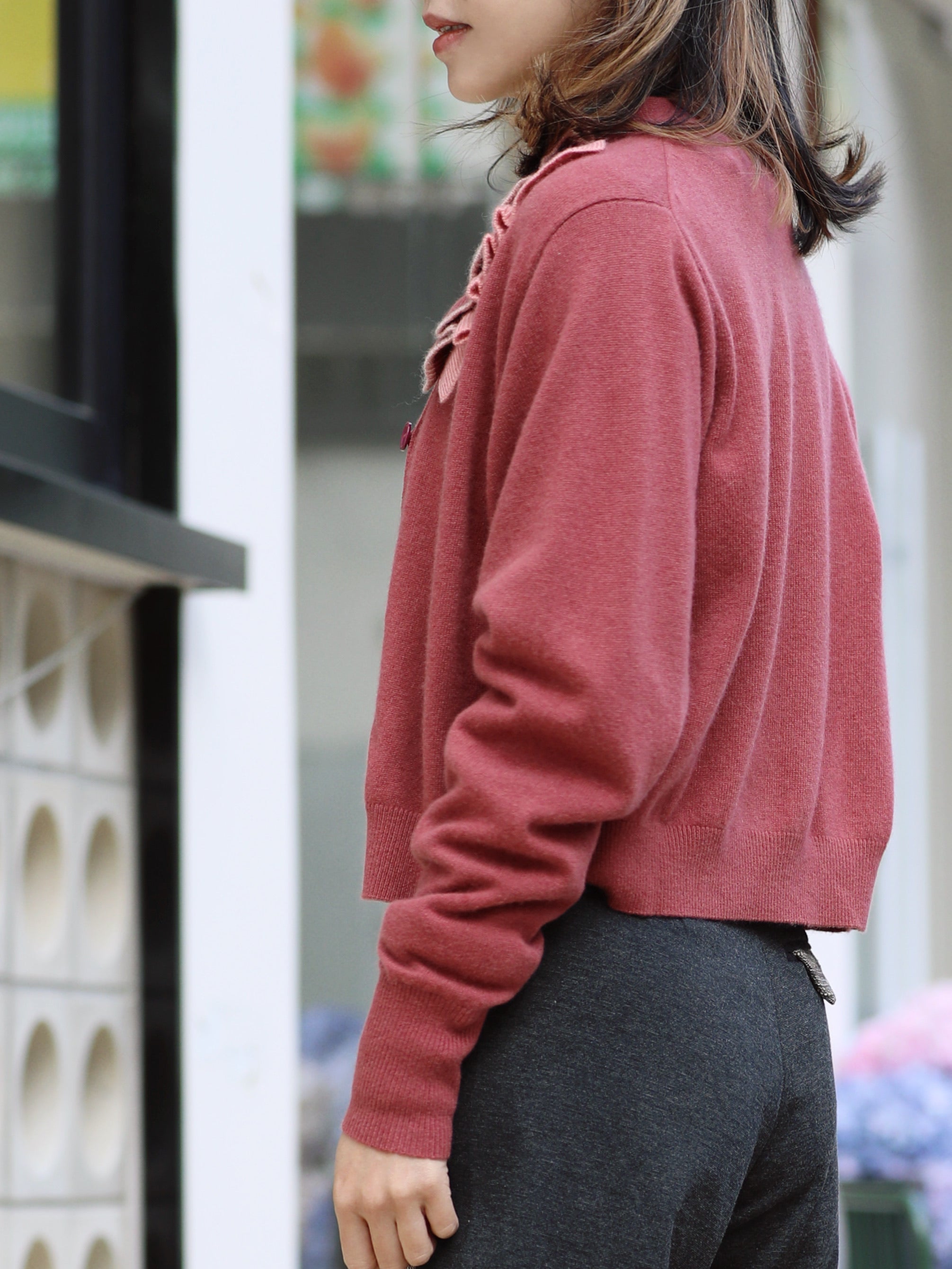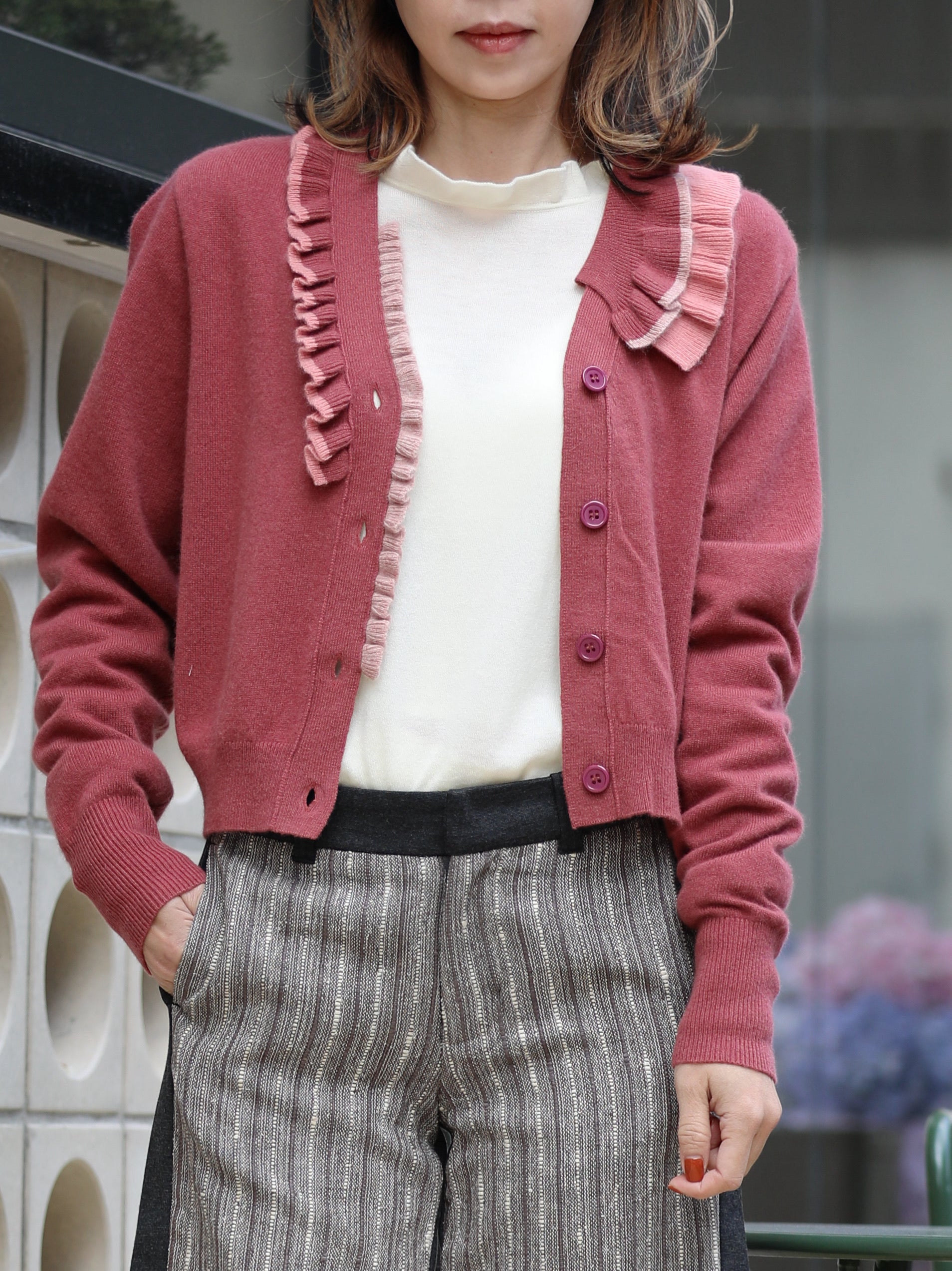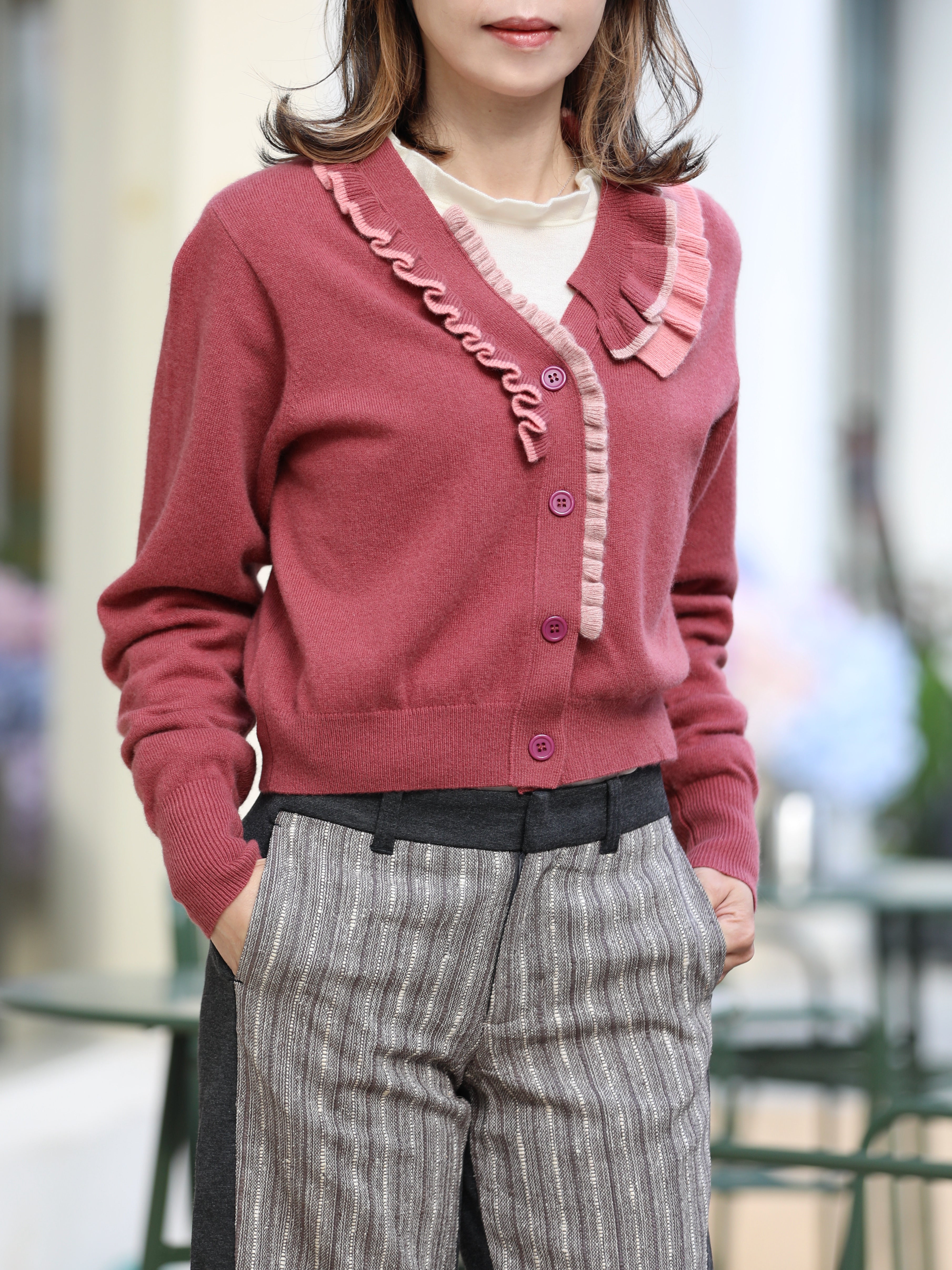TYNVIE 撞色荷叶边装饰羊绒开衫- 砖红色