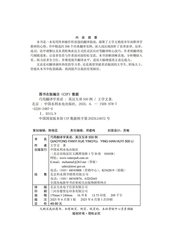 本书是一本实用性和操作性很强的翻译指南,凝聚了王学文教授多年深耕译学教研的心得。书中精选约500个经典翻译实例,深入浅出地阐释了直译意译、反译、选词、语序调整,以及各类特殊表达方式的灵活应对等翻译核心技巧。作者以亲切如交谈的风格,将翻译技巧娓娓道来,使读者感觉在与作者进行面对面的轻松交谈。本书讲解清晰直观,分析鞭辟入里,助力读者全方位、多维度提升翻译水平,进而大幅增强英文表达能力。无论是对翻译满怀热忱的学习者,还是渴望突破英语瓶颈的大学生、职场人士,皆能从本书中收获满满,找到提升自我的有效路径。
