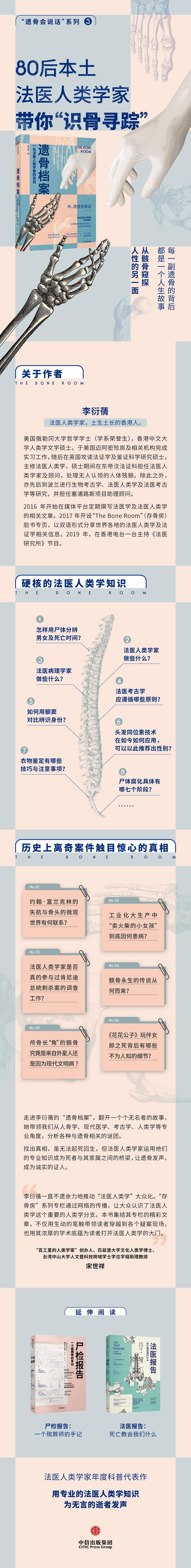 走进李衍蒨的“遗骨档案”,翻开一个一个无名者的故事,她带领我们从人骨学、现代医学、考古学、人类学等专业角度,分析各种与遗骨相关的谜团──历史上知名的离奇死亡案,工业化进程中的集体中毒,古代人的病理现象,另类的遗骸身份辨识:额窦比对、衣物鉴定、体内植入物,以及各地的丧葬遗骨文化。