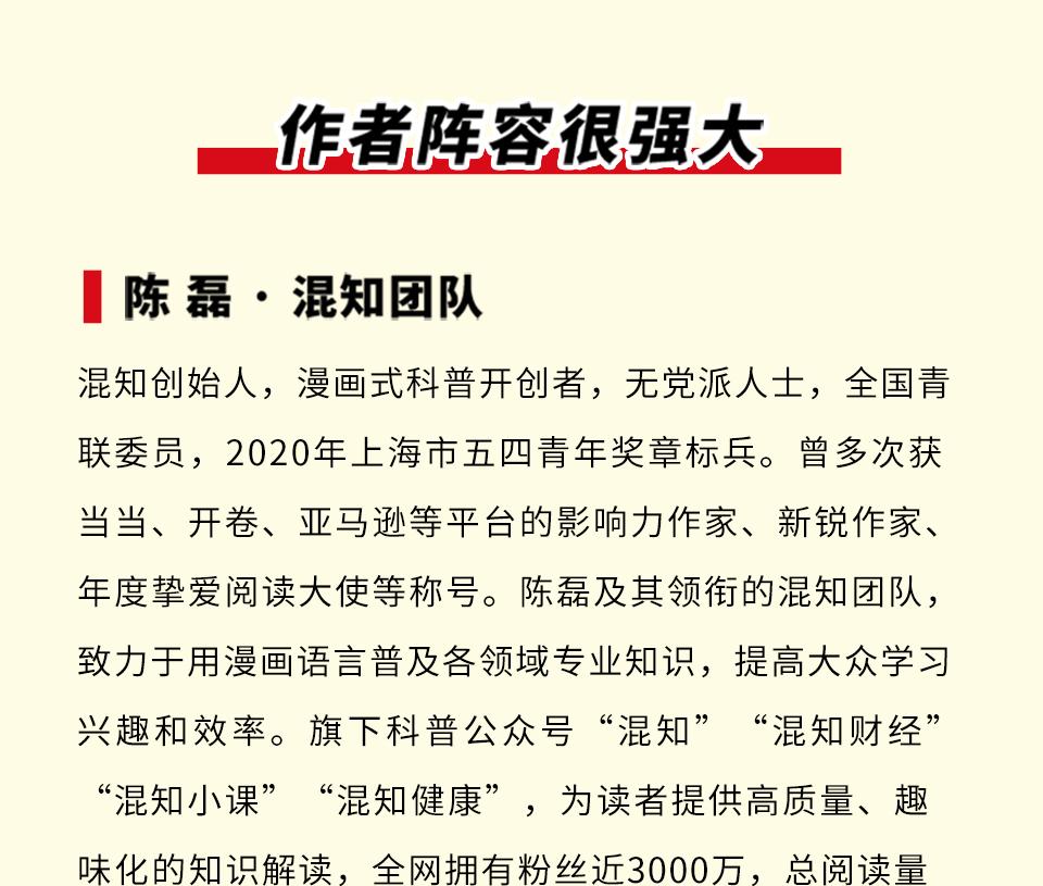 混知创始人,漫画式科普开创者,无党派人士,第十三届全国青联委员,2020年上海市五四青年奖章标兵。曾多次获当当、开卷、亚马逊等平台的影响力作家、新锐作家、年度挚爱阅读大使等称号。陈磊及其领衔的混知团队,致力于用漫画语言普及各领域专业知识,提高大众学习兴趣和效率。旗下科普公众号“混知”“混知财经”“混知小课”“混知健康”,为读者提供高质量、趣味化的知识解读,拥有全网粉丝近3000万,总阅读量超过5亿人次。