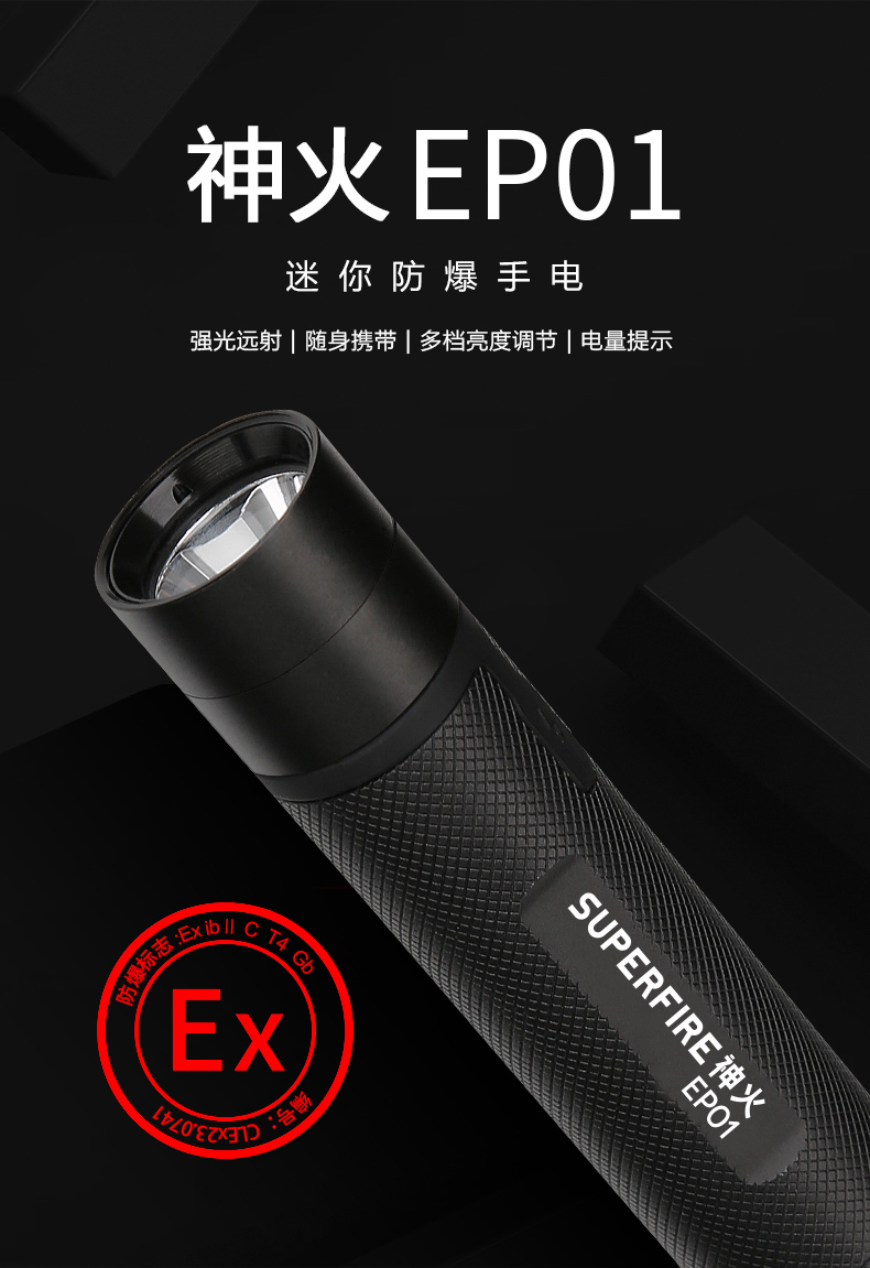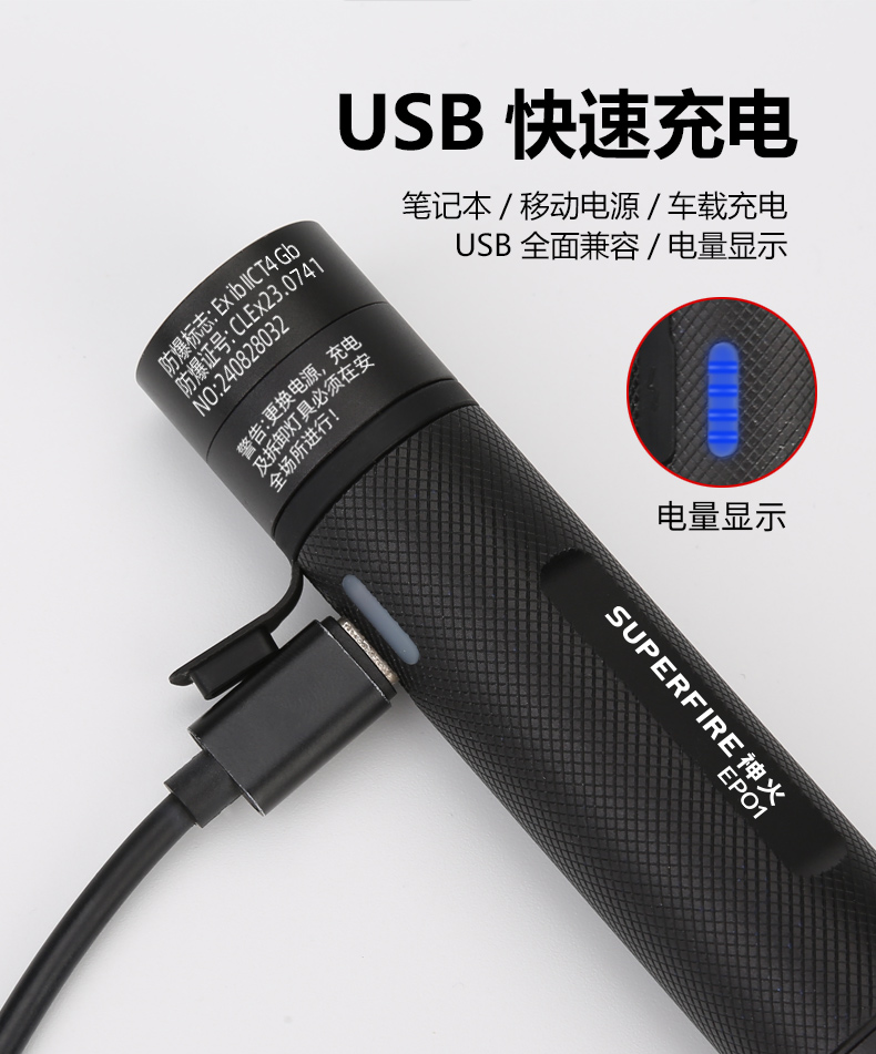 SUPERFIRE神火EP01防爆手电筒强光远射USB充电防水加油站消防巡逻迷你手电