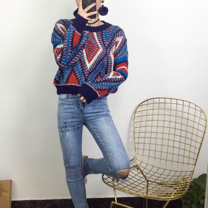 【服饰鞋包】 年秋冬宽松几何撞色灯笼袖民族风圆领毛衣针织衫