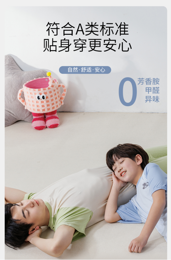 面料采用粘纤94.5%+氨纶5.5% 真的超级绝,柔软,亲肤,软糯 摸到手上就是那种软炸的那种 一触即软,有份量!不易皱! ✅A类面料!!无甲醛不含荧光剂 大家都知道给小孩子选衣服最好选A类标准的 因为A类产品对甲醛含量、着色度等要求较高 而今天给麻麻带来的这款 就完完全全符合A类纯棉标准