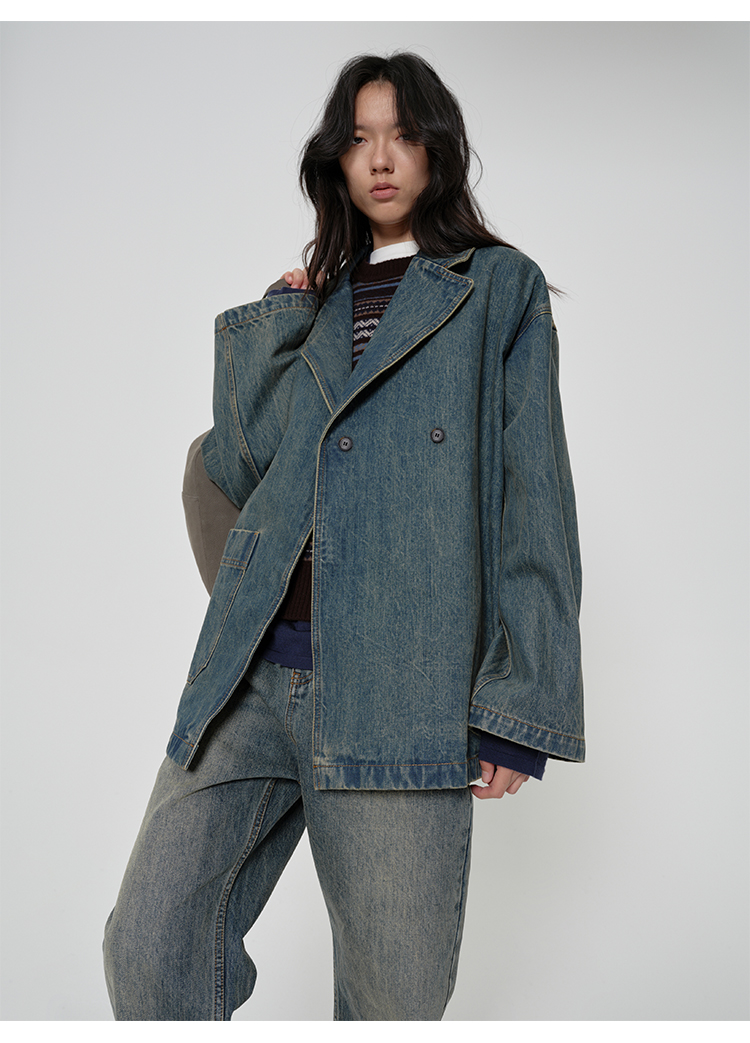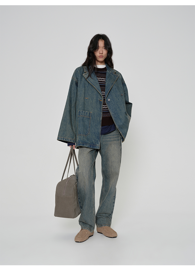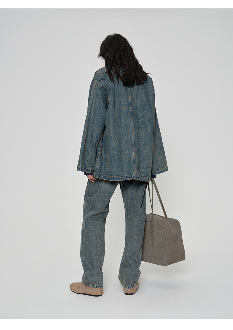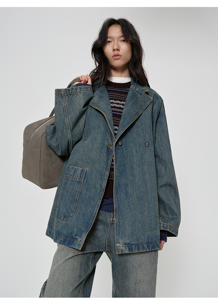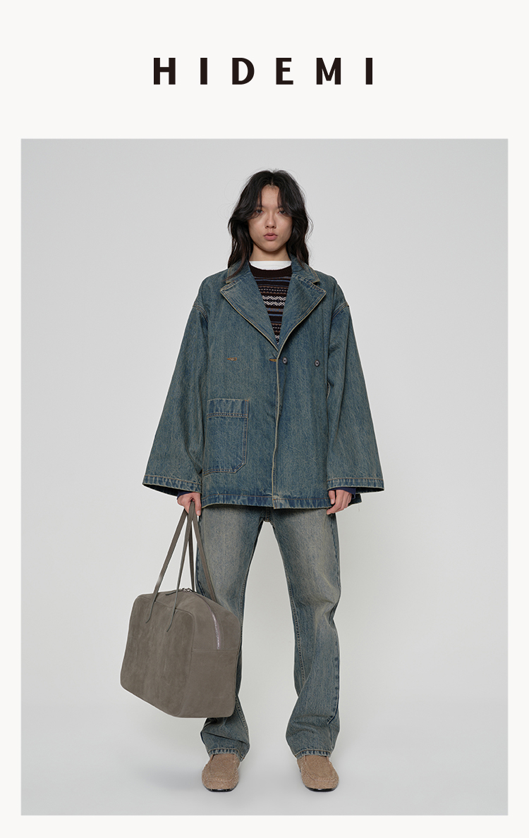 HIDEMI 多重水洗做旧感极简大廓形翻领口袋式纽扣西装大衣外套