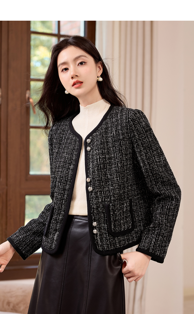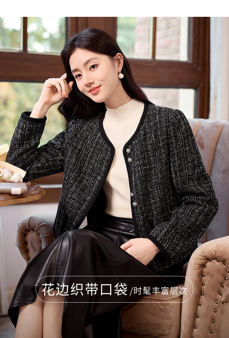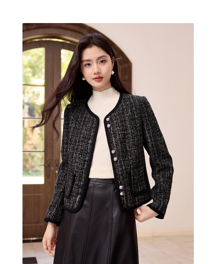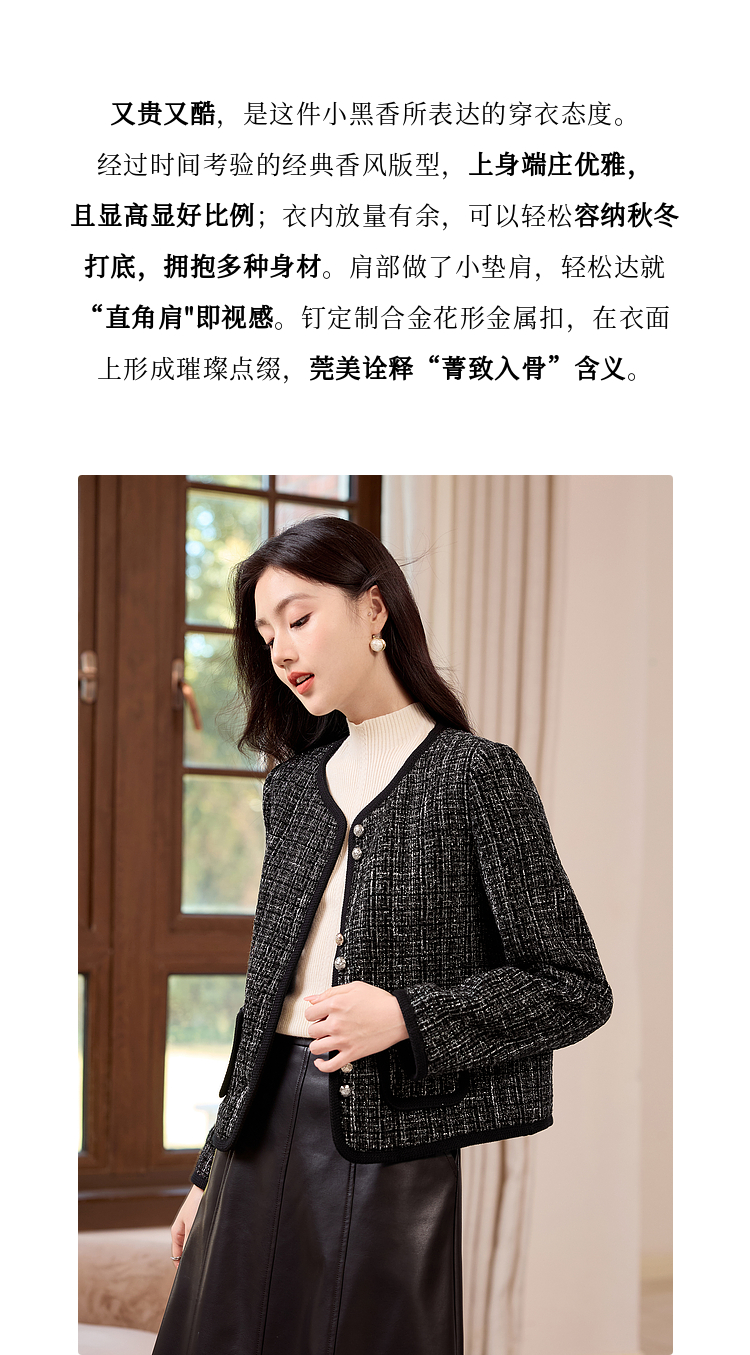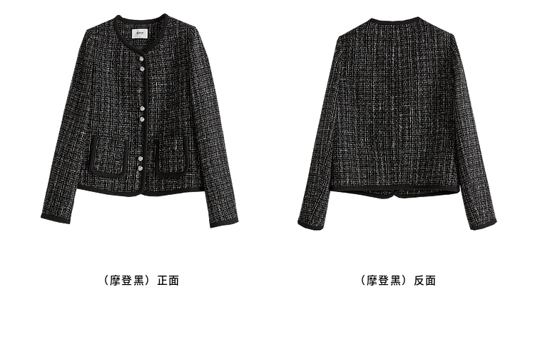 【年货节】熙世界小香风黑色短外套秋冬季新款气质名媛加厚夹棉粗花呢上衣