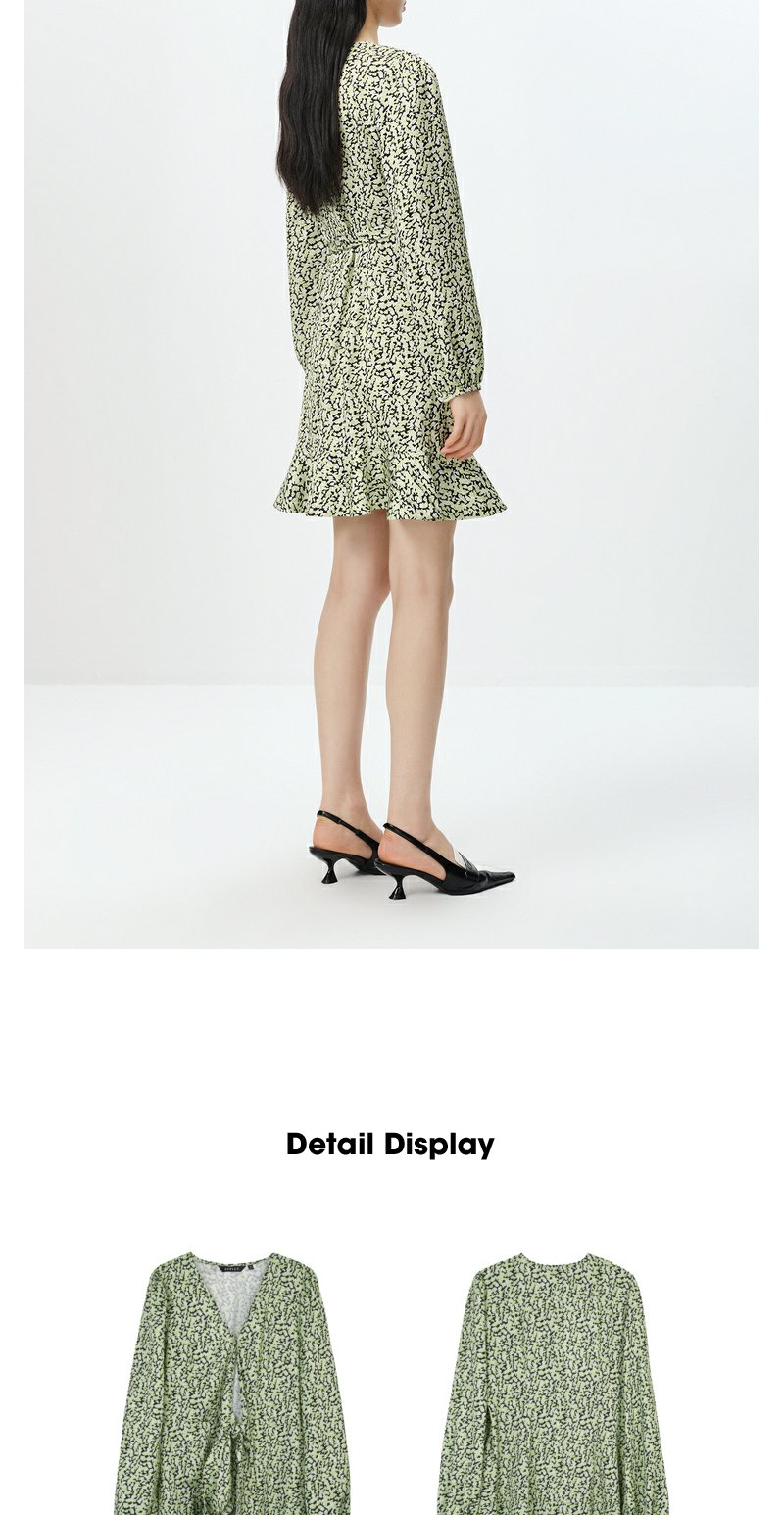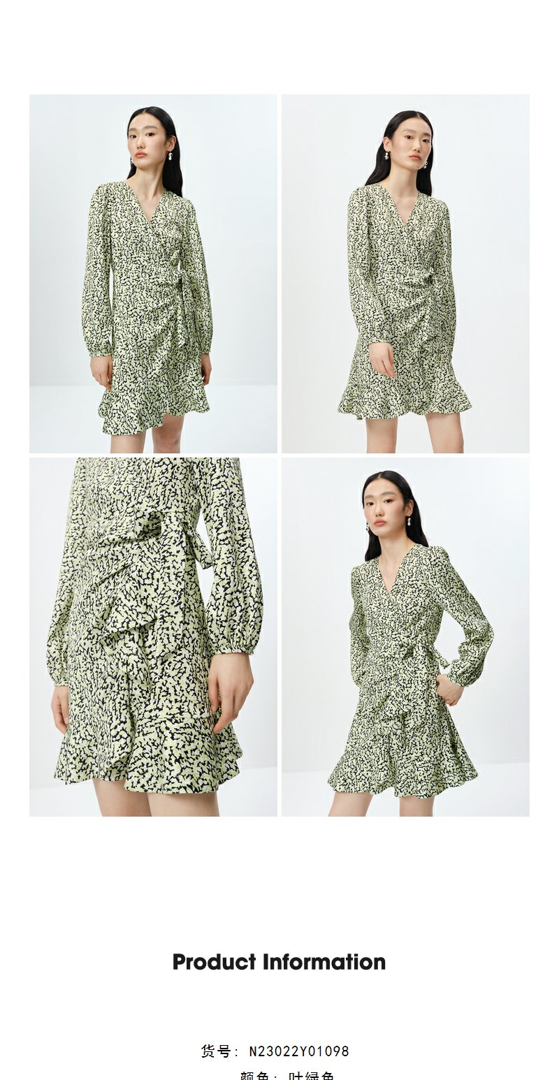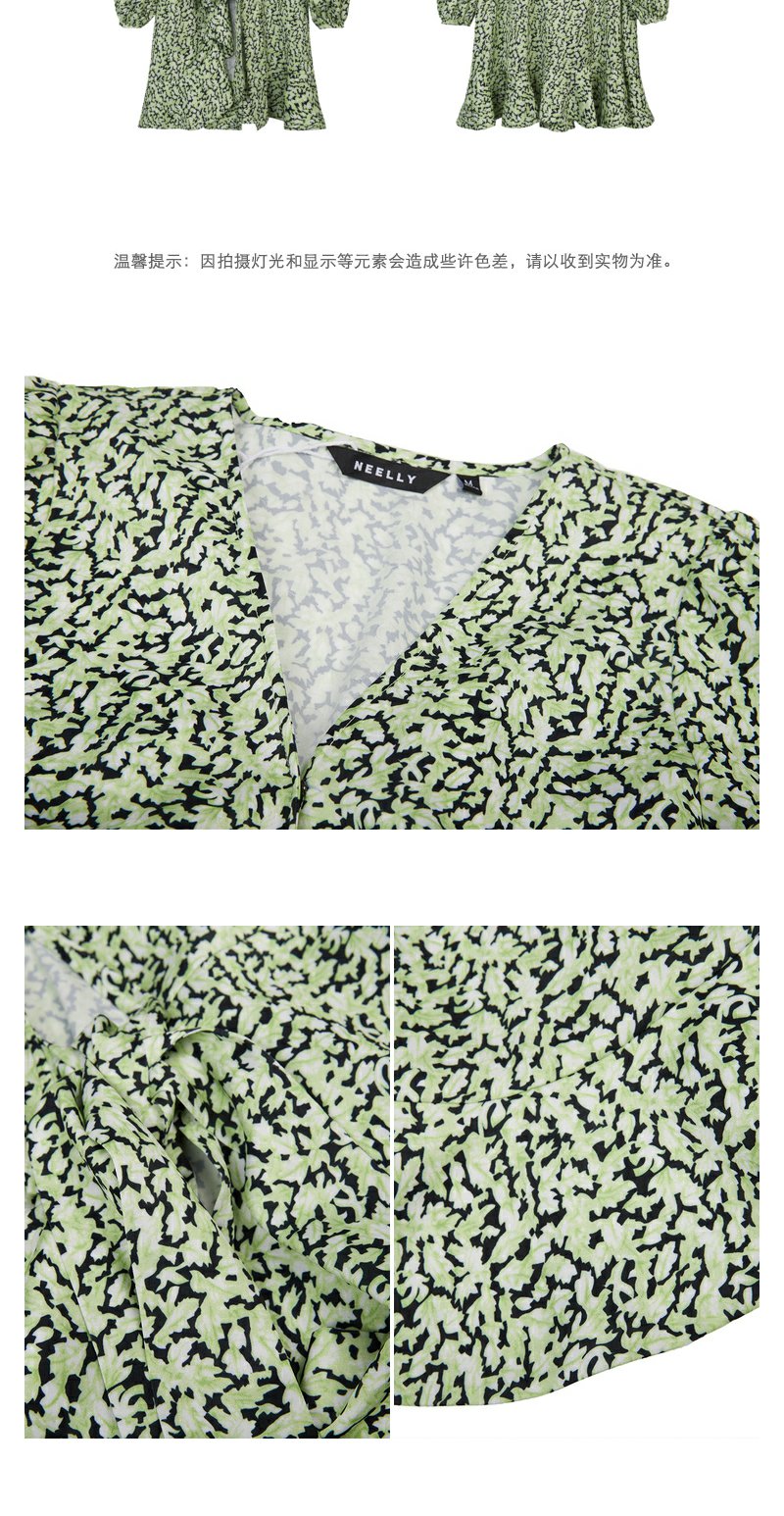 NEELLY纳俪商场同款春季V领泡泡袖连衣裙女收腰系带a字裙中长款N23022Y01098