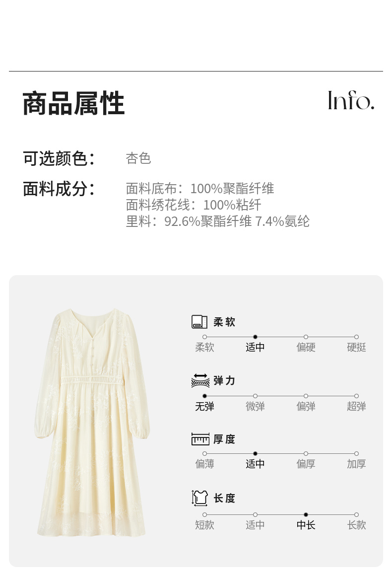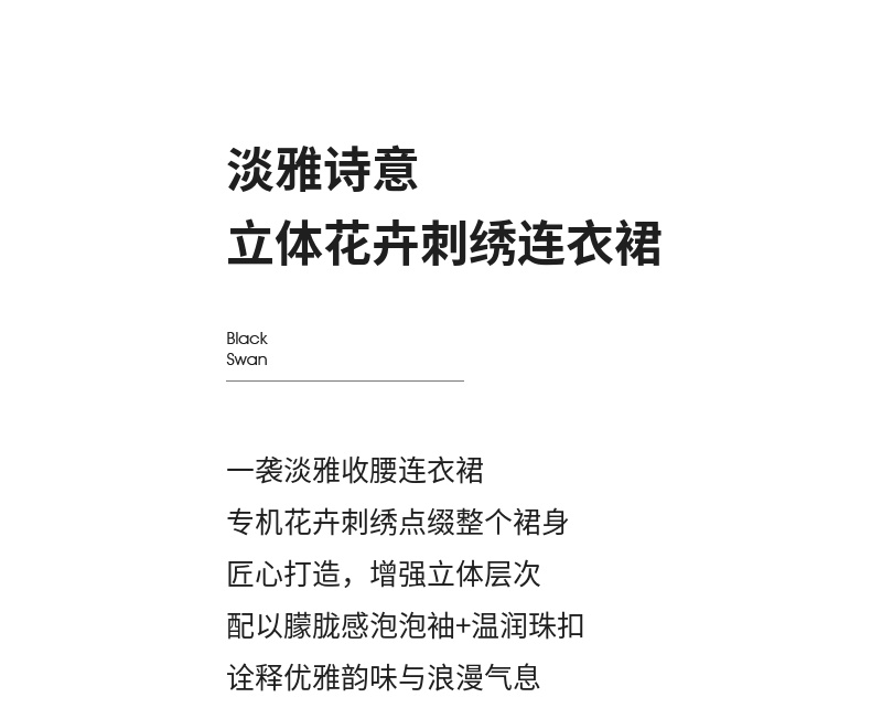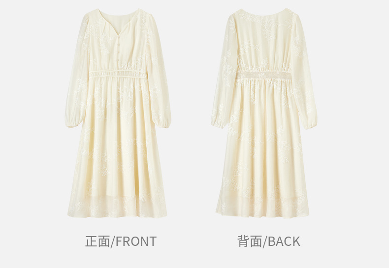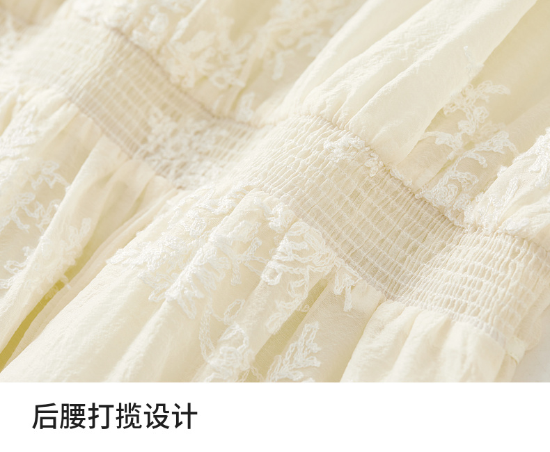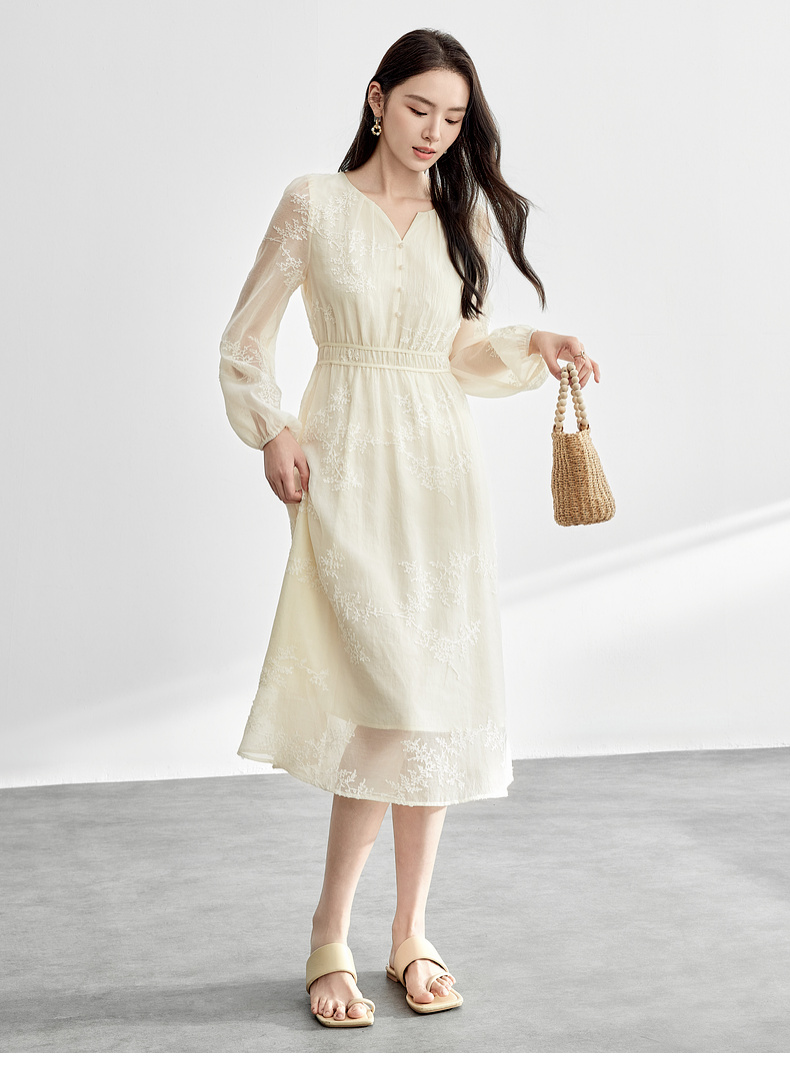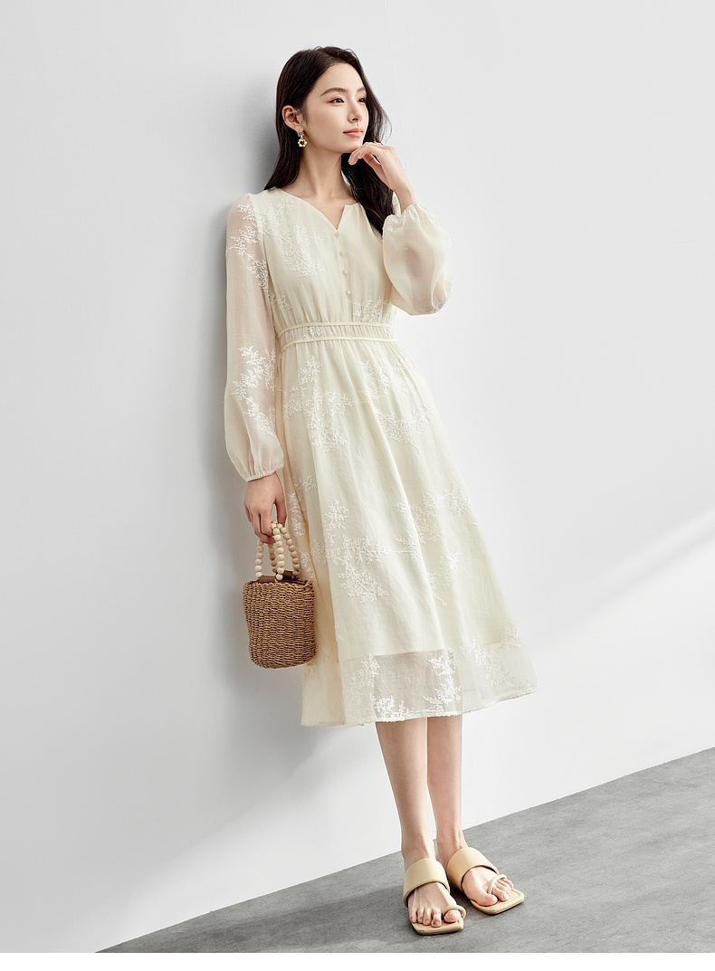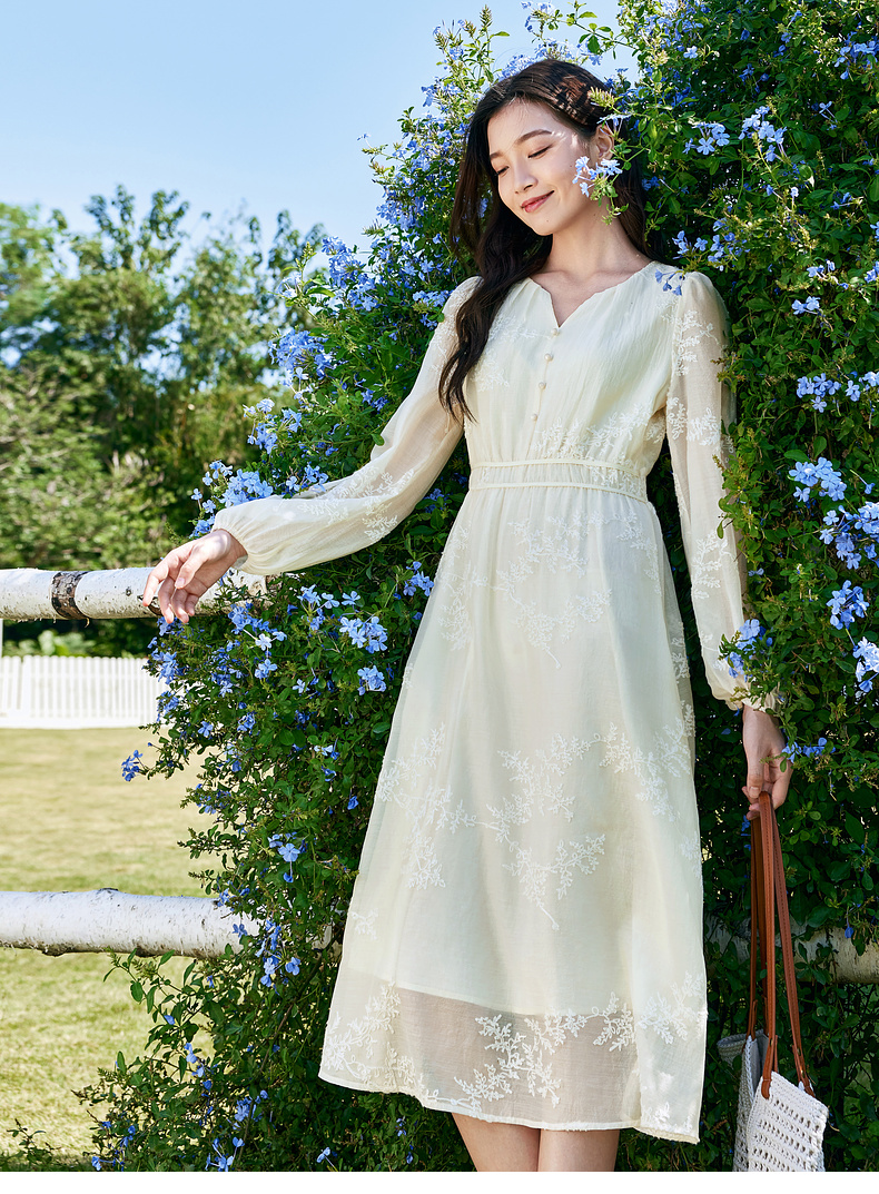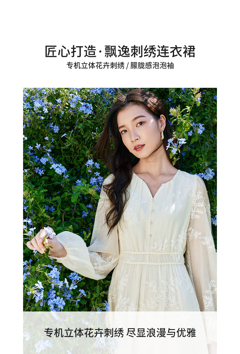 【内购】尚都比拉专机花卉刺绣肌理感V型圆领珠扣装饰收腰泡泡袖A字中长连衣裙-58303