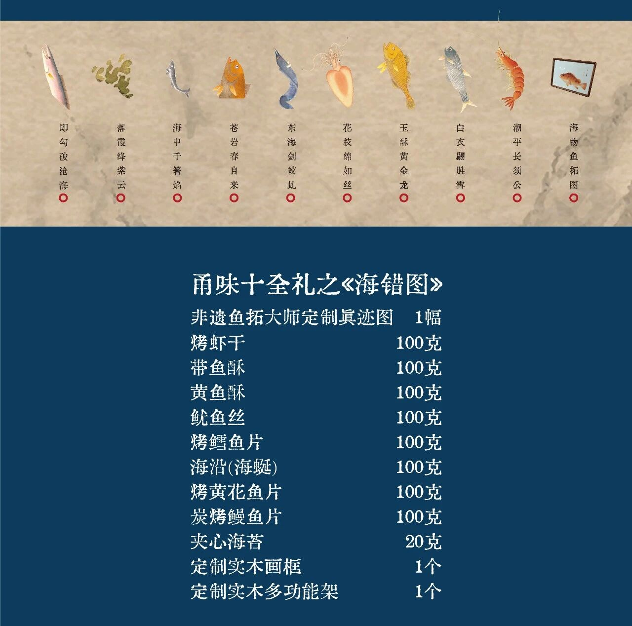 礼盒内容再度升级,严选《海错图》中描绘的九种经典海鲜干货。它们不仅是美味,更是承载着历史与传说风味的文化符号。我们希望通过这九种风味,让您在品尝之时,脑海中能浮现出聂璜笔下那个光怪陆离、生机勃勃的海洋世界。当非遗鱼拓的艺术视觉,与穿越三百年的海洋风味相结合,您打开的将是一个汇聚了艺术、历史、民俗与美食的立体文化空间。