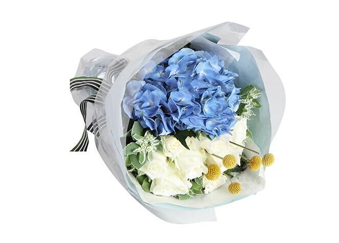 白玫瑰9枝,蓝绣球1枝,黄金球5枝,叶上花7枝(黄金球为季节性花材,缺货时花艺师会用等价的粉色、绿色桔梗或者绿色小雏菊替代,不影响花束整体效果)