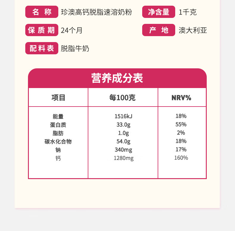 珍澳高钙脱脂速溶奶粉 1kg/袋