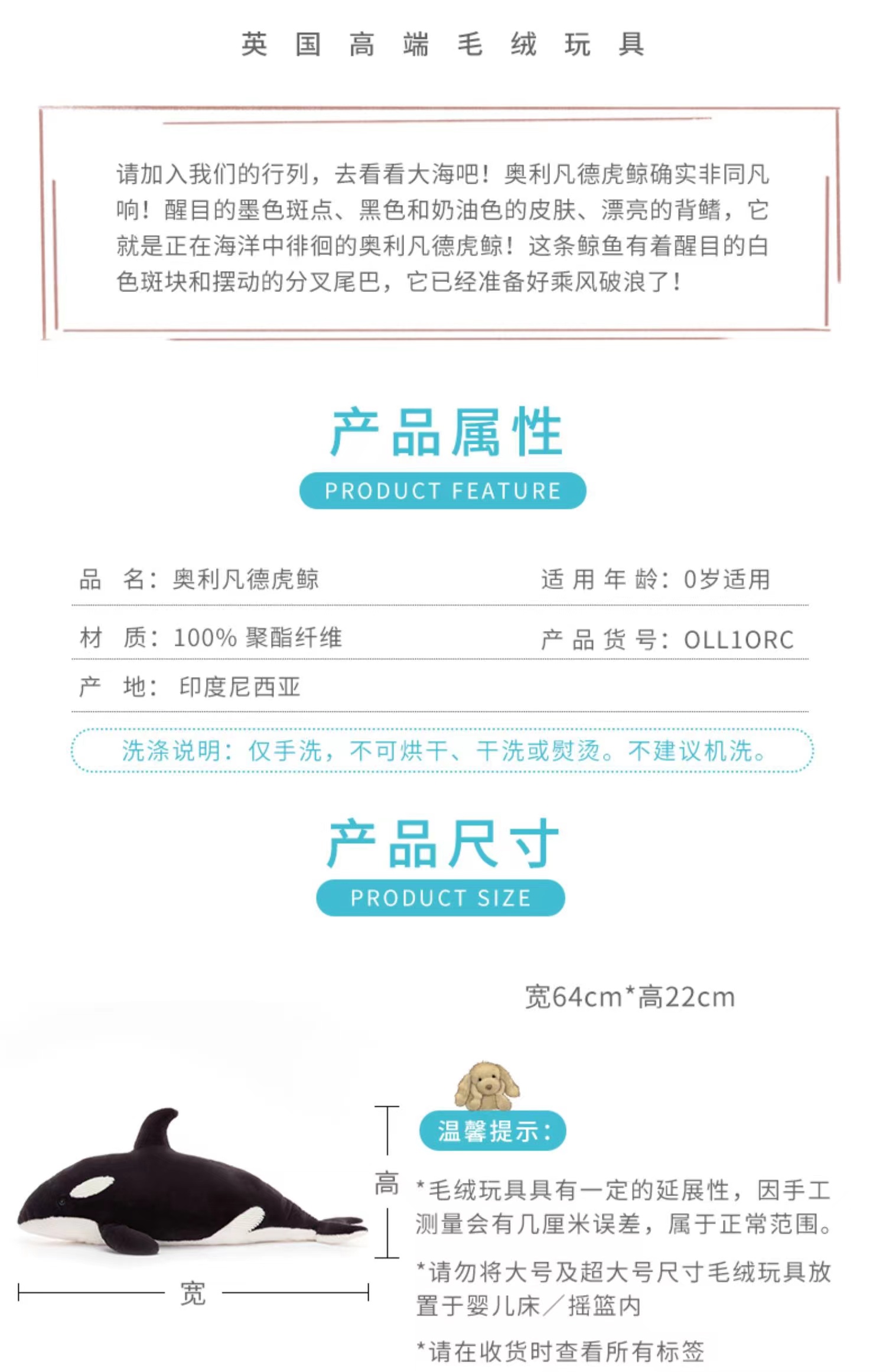 JellyCat 奥利凡德虎鲸 (均码 22cm)玩偶