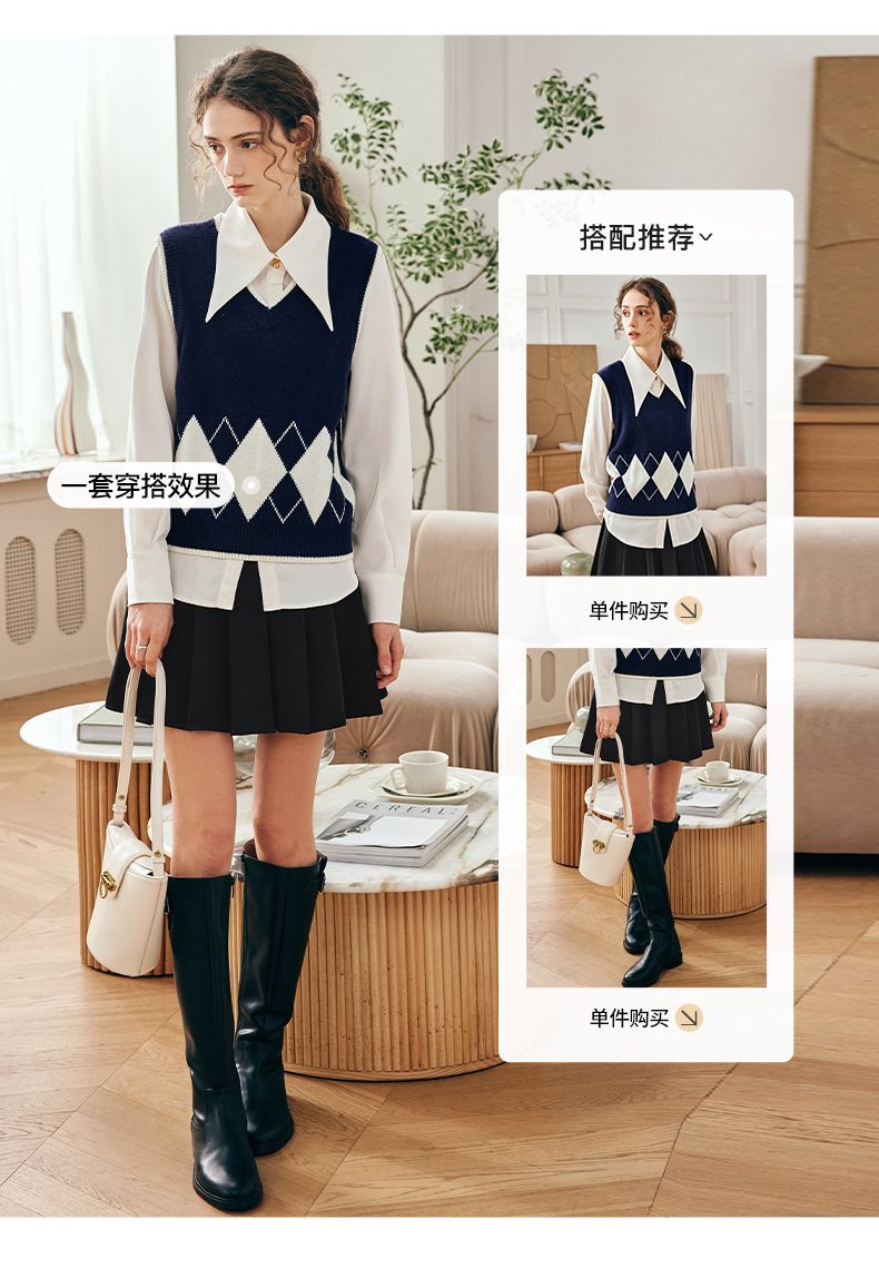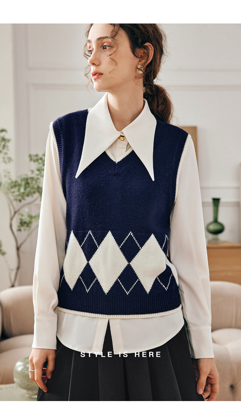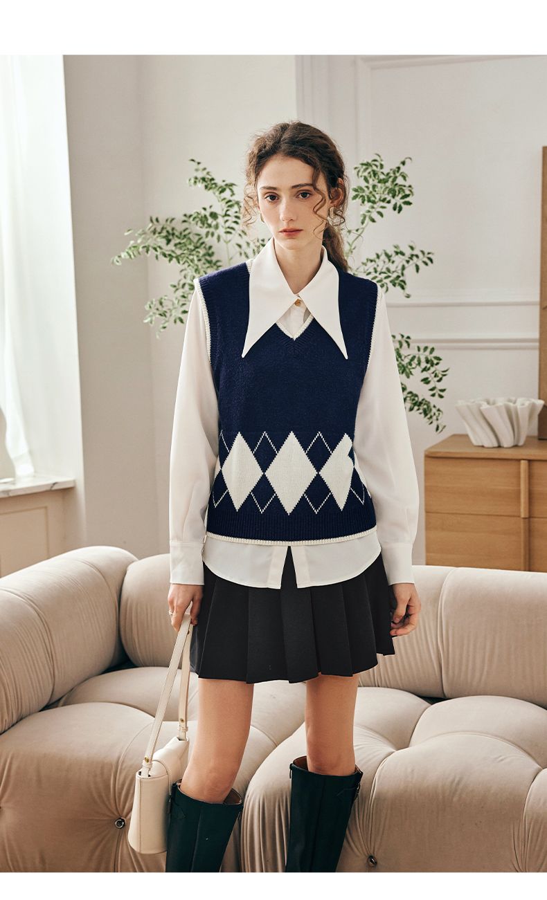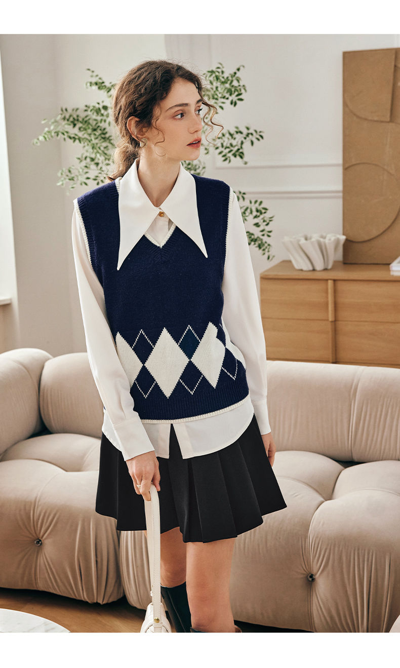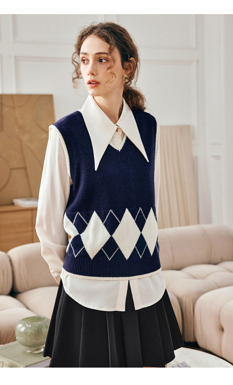 OLrain欧芮儿法式菱格毛衣马甲女早春2023新款英伦风减龄针织背心