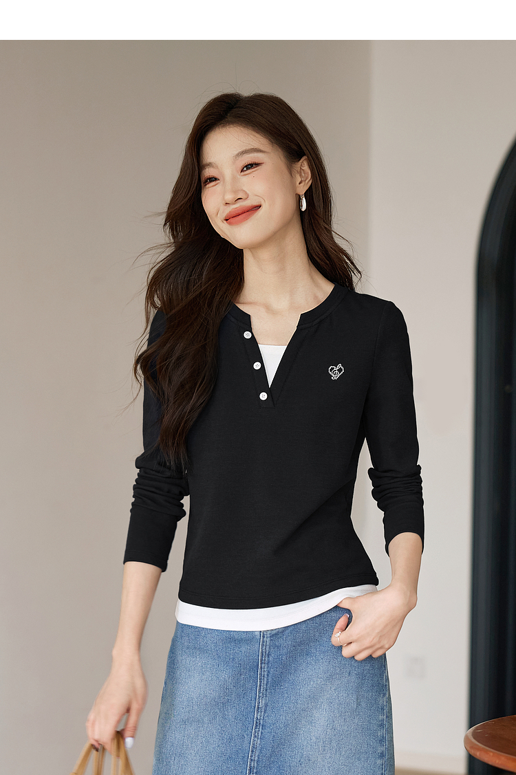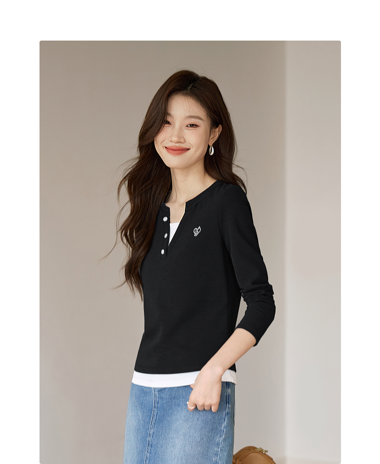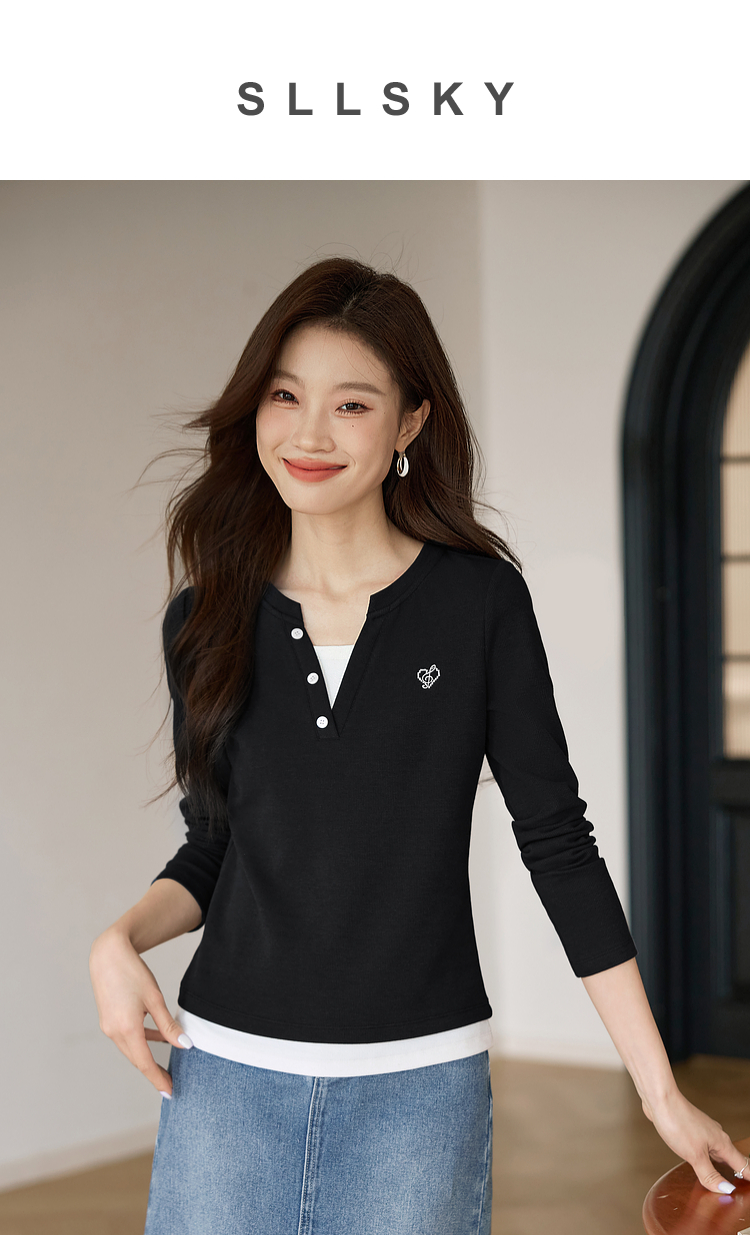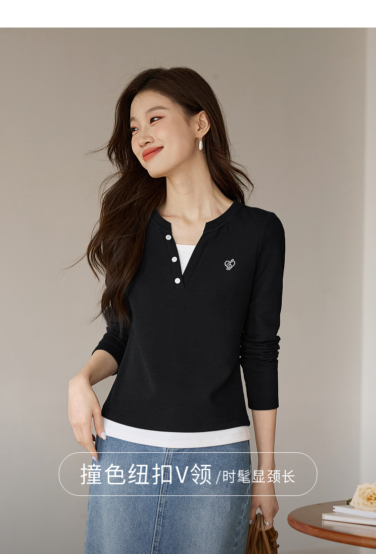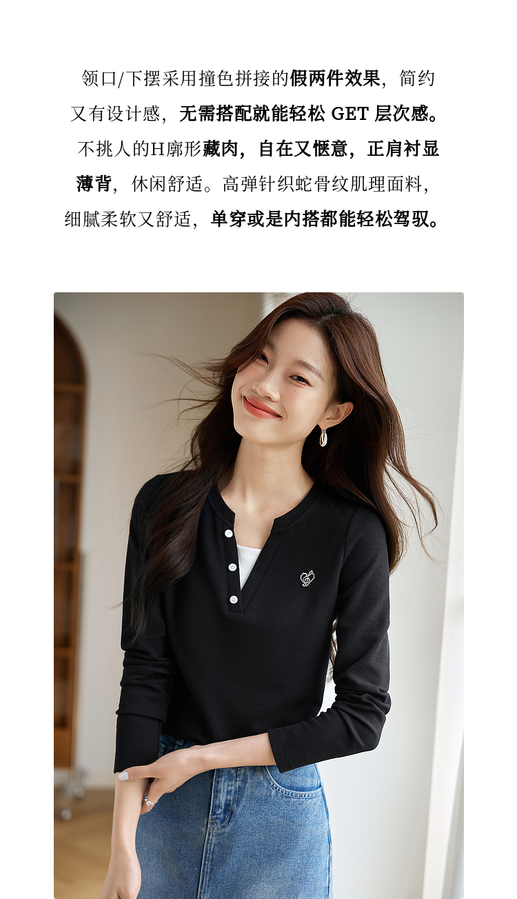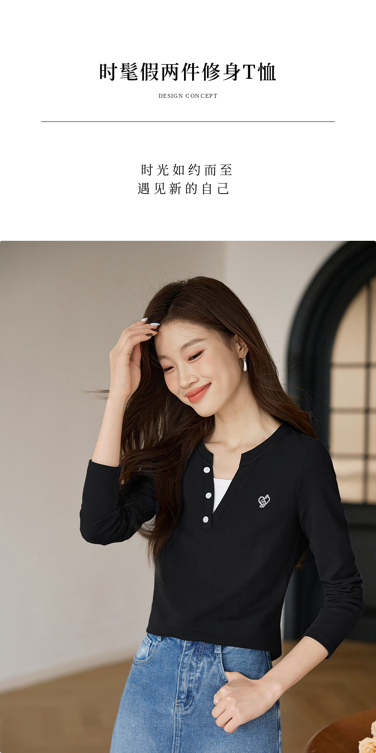 【专属特价】熙世界假两件正肩针织t恤长袖2025早春新款设计感休闲打底上衣