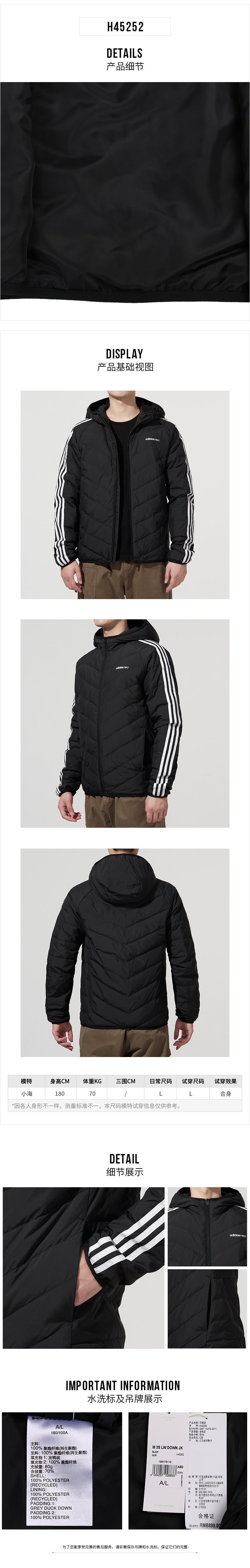 Adidas阿迪达斯 Neo2021男子M 3S LW DOWN JK羽绒服H45252