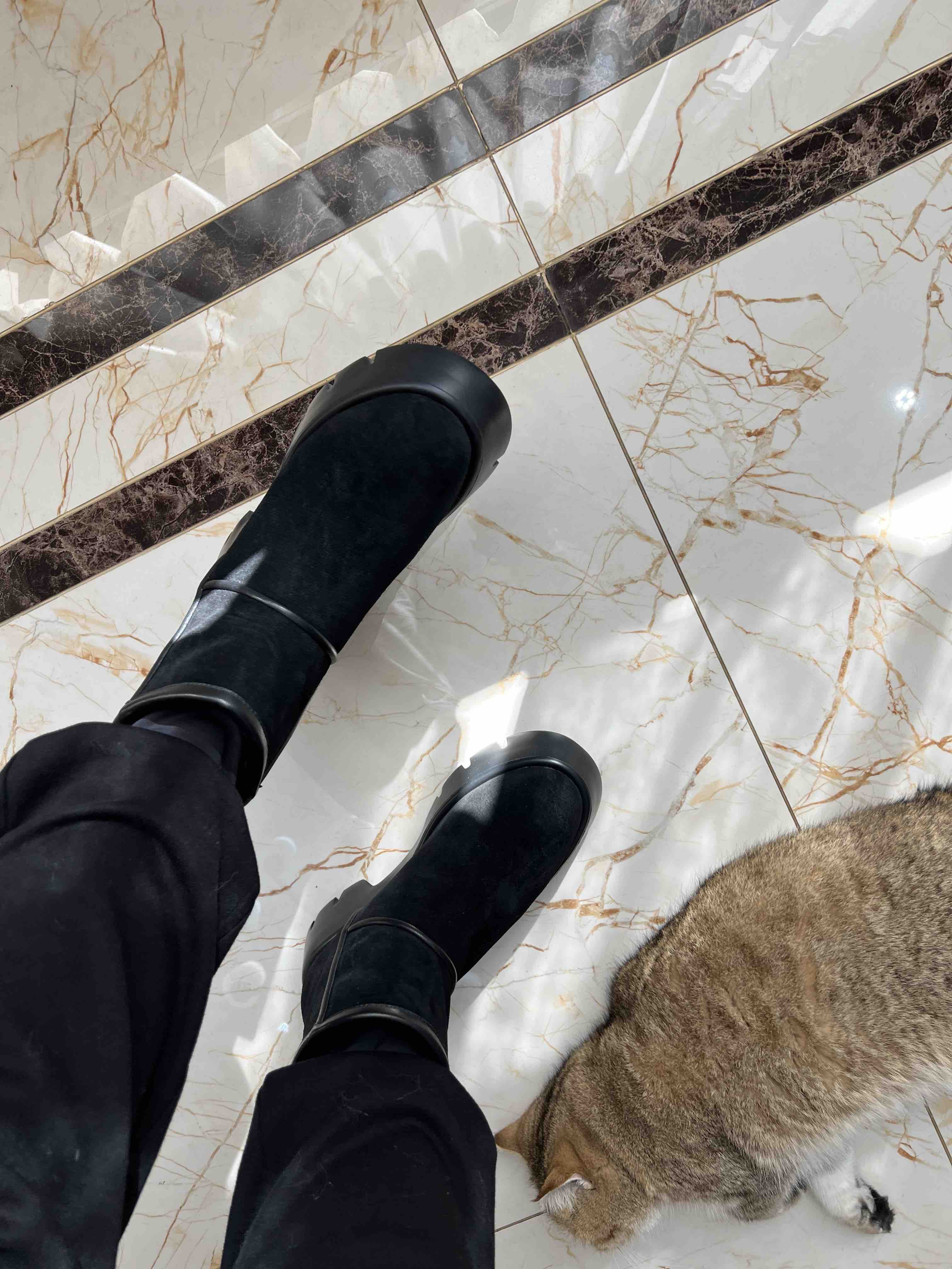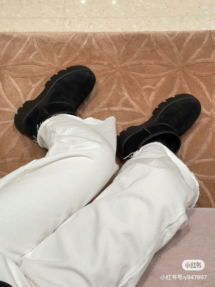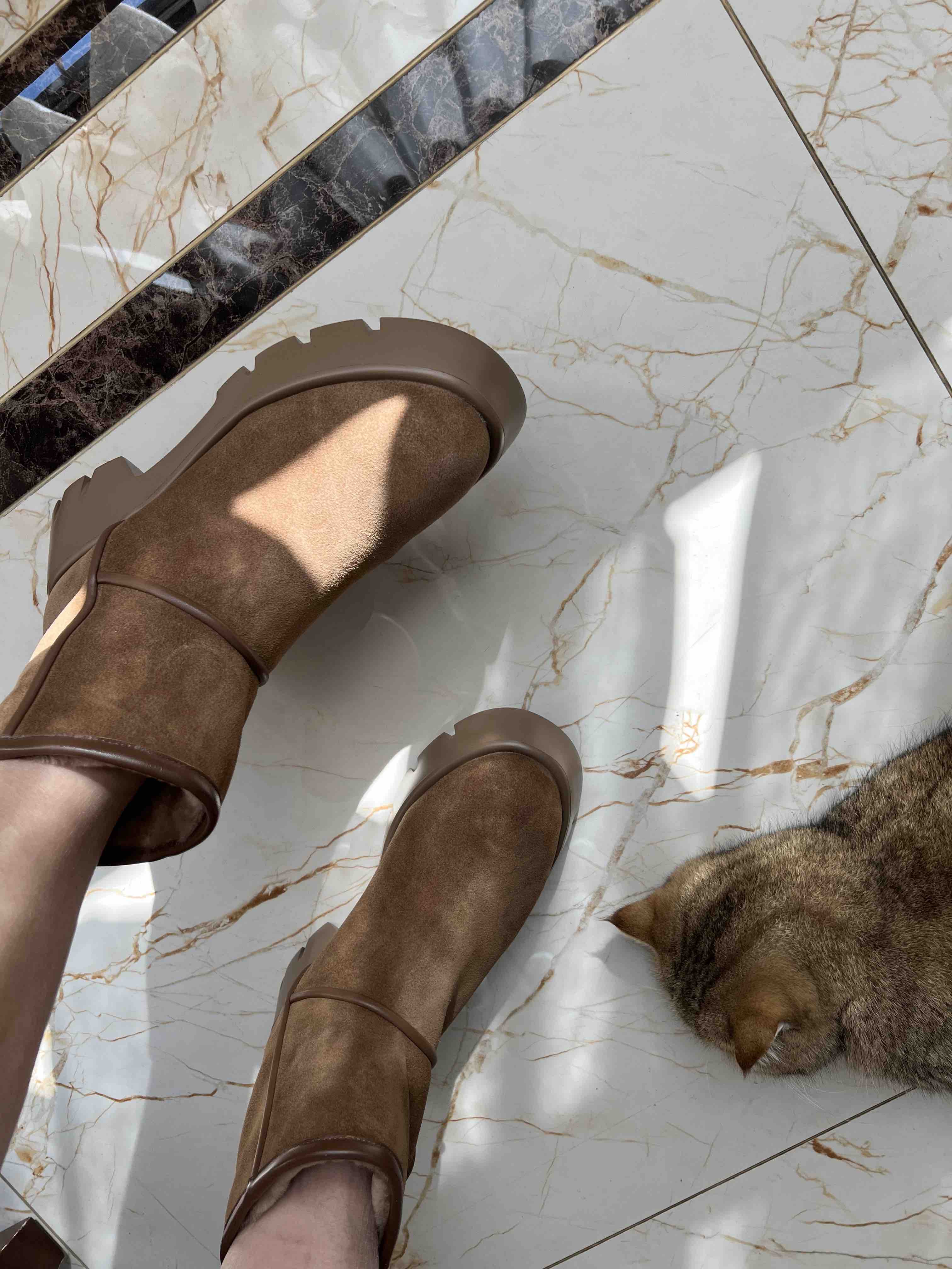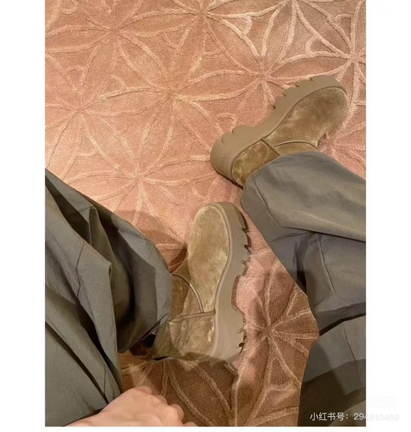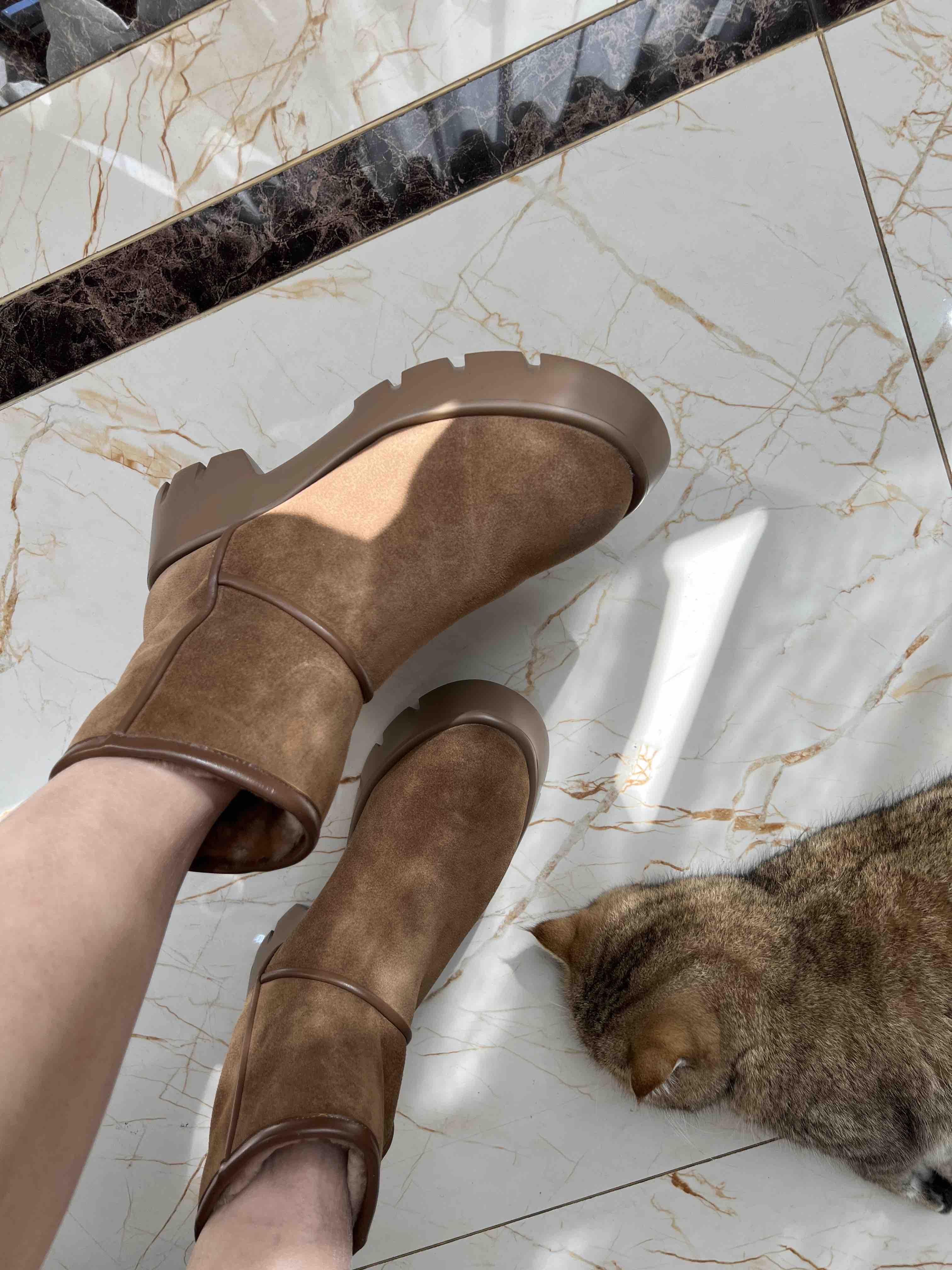 实拍来,鞋型千锤百炼,饱满复古圆头,流畅秀气大身,同色系超轻厚底,整个拼接都用小羊皮包边,可以算得上非常细致了。鞋面是细腻羊反绒,内里是真正的皮毛一体。仔细看高密柔滑细腻亲肤的内衬嗷嗷嗷