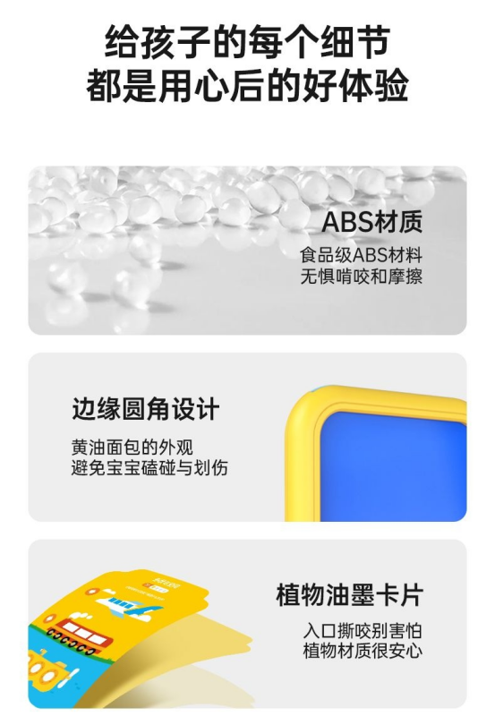 产品设计贴心,4个角圆角设计,不怕孩子刮伤,采用食品级ABS材质,让孩子玩的放心。