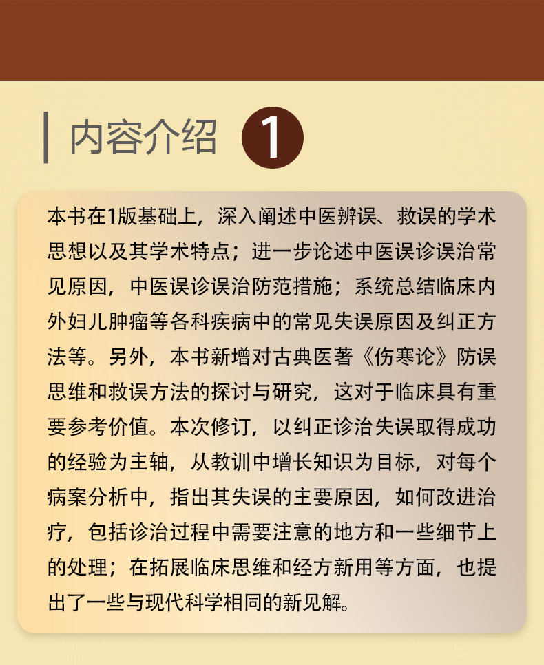 本书在1版基础上,深入阐述中医辨误、救误的学术思想以及其学术特点;进一步论述中医误诊误治常见原因,中医误诊误治防范措施;系统总结临床内外妇儿肿瘤等各科疾病中的常见失误原因及纠正方法等。另外,本书新增对古典医著《伤寒论》防误思维和救误方法的探讨与研究,这对于临床具有重要参考价值。本次修订,以纠正诊治失误取得成功的经验为主轴,从教训中增长知识为目标,对每个病案分析中,指出其失误的主要原因,如何改进治疗,包括诊治过程中需要注意的地方和一些细节上的处理;在拓展临床思维和经方新用等方面,也提出了一些与现代科学相同的新见解。
