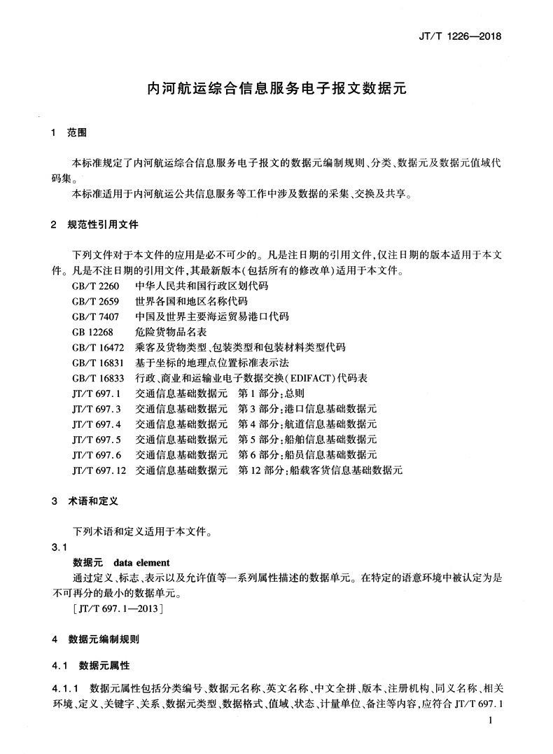 正版现货 JT/T 1226—2018 内河航运综合信息服务电子报文数据元 中华人民共和国交通运输行业标准 中华人民共和国交通运输部发布