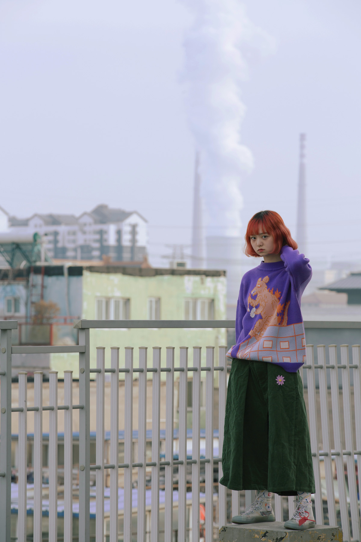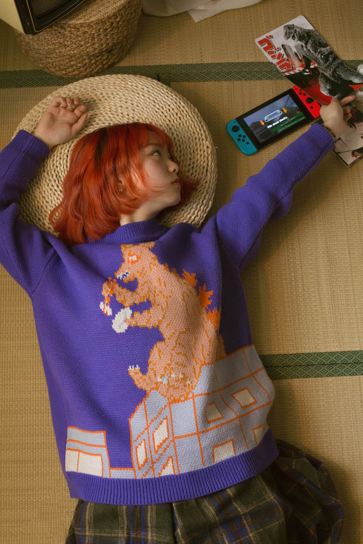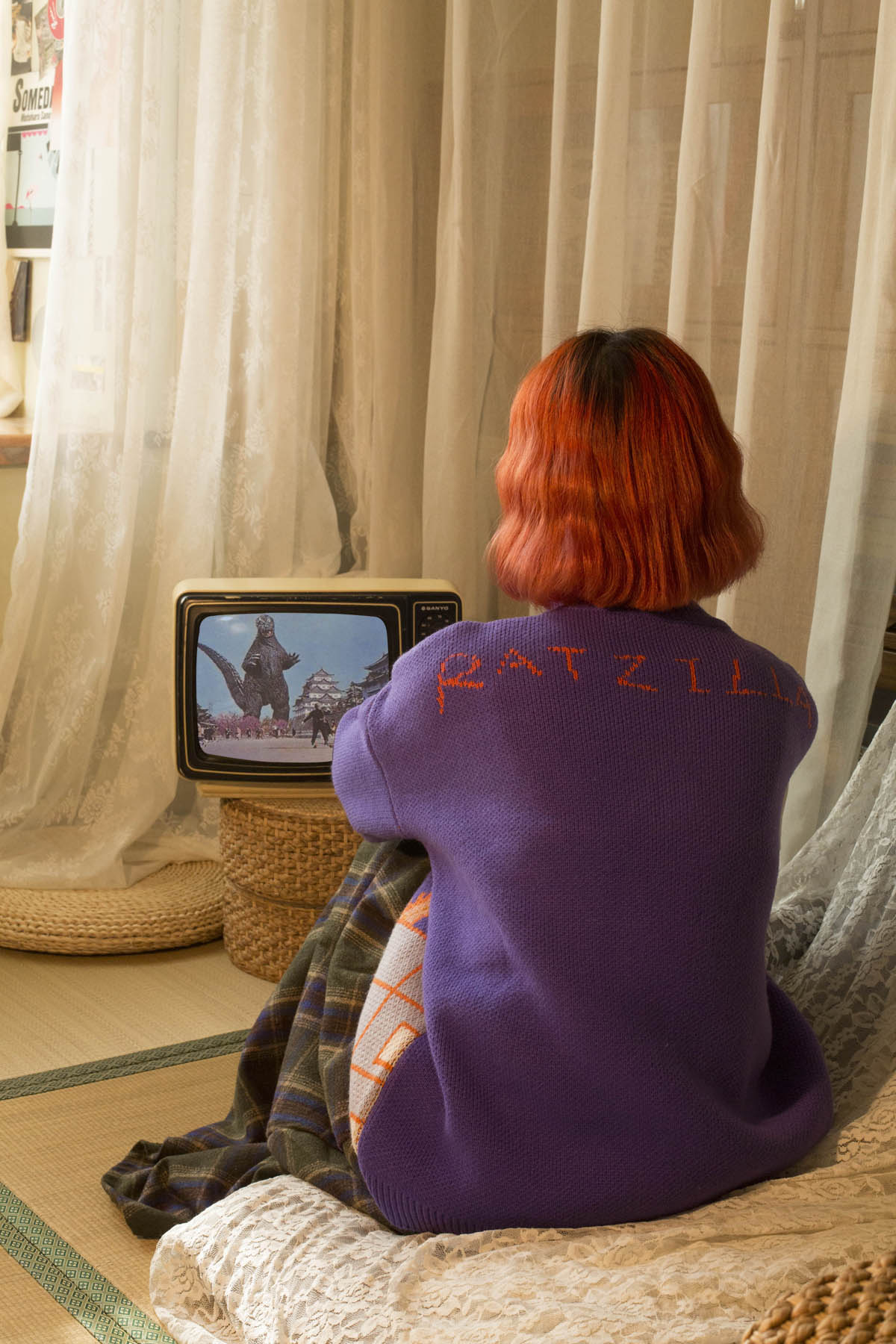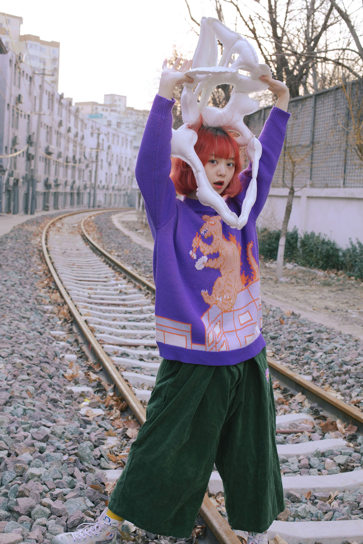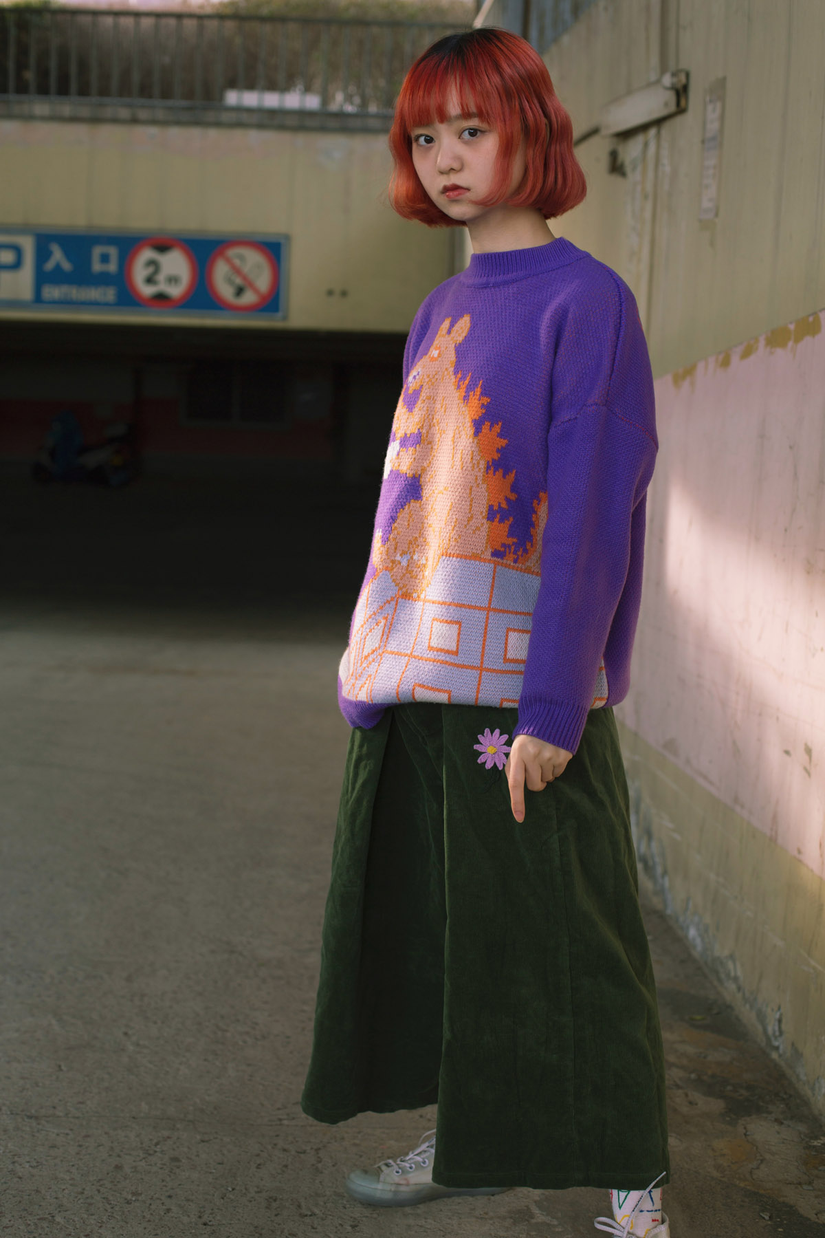 一只坐在天台上吃饺子的鼠斯拉,配上霓虹般的紫色毛衣,让你在冬天变成最亮眼的小孩。