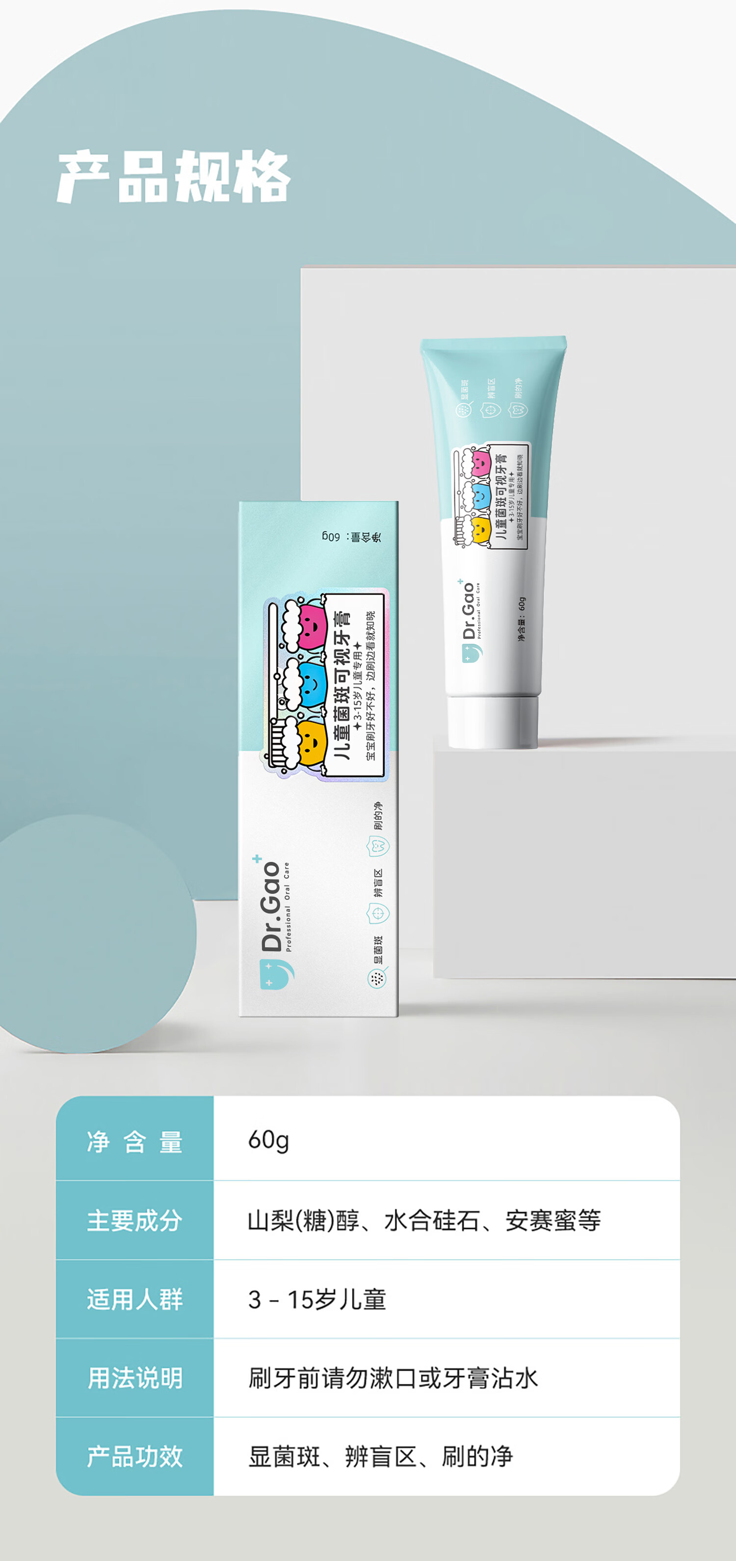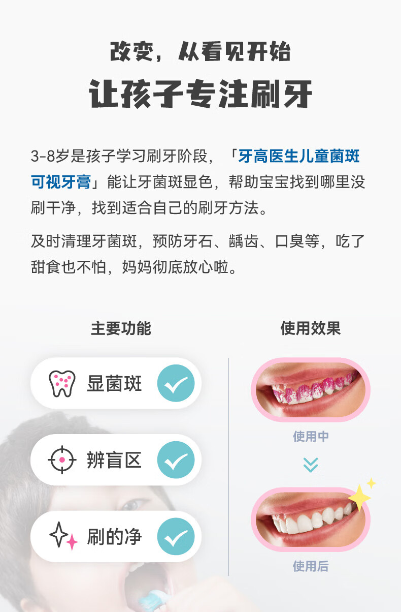 牙高医生儿童菌斑可视牙膏60g 菌斑防蛀牙虫牙龋齿水果草莓味含氟防蛀牙膏